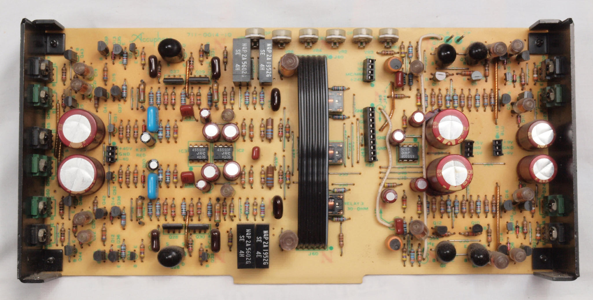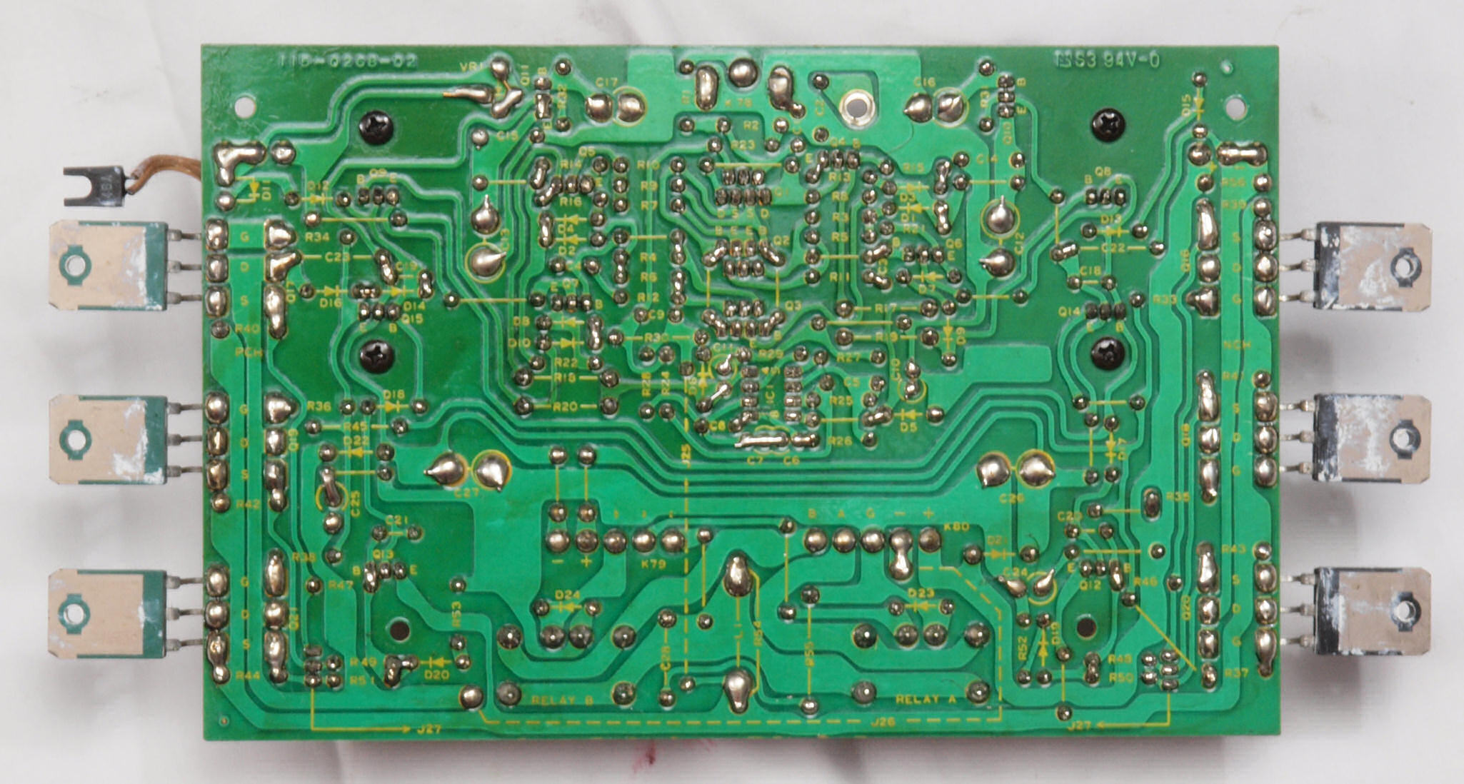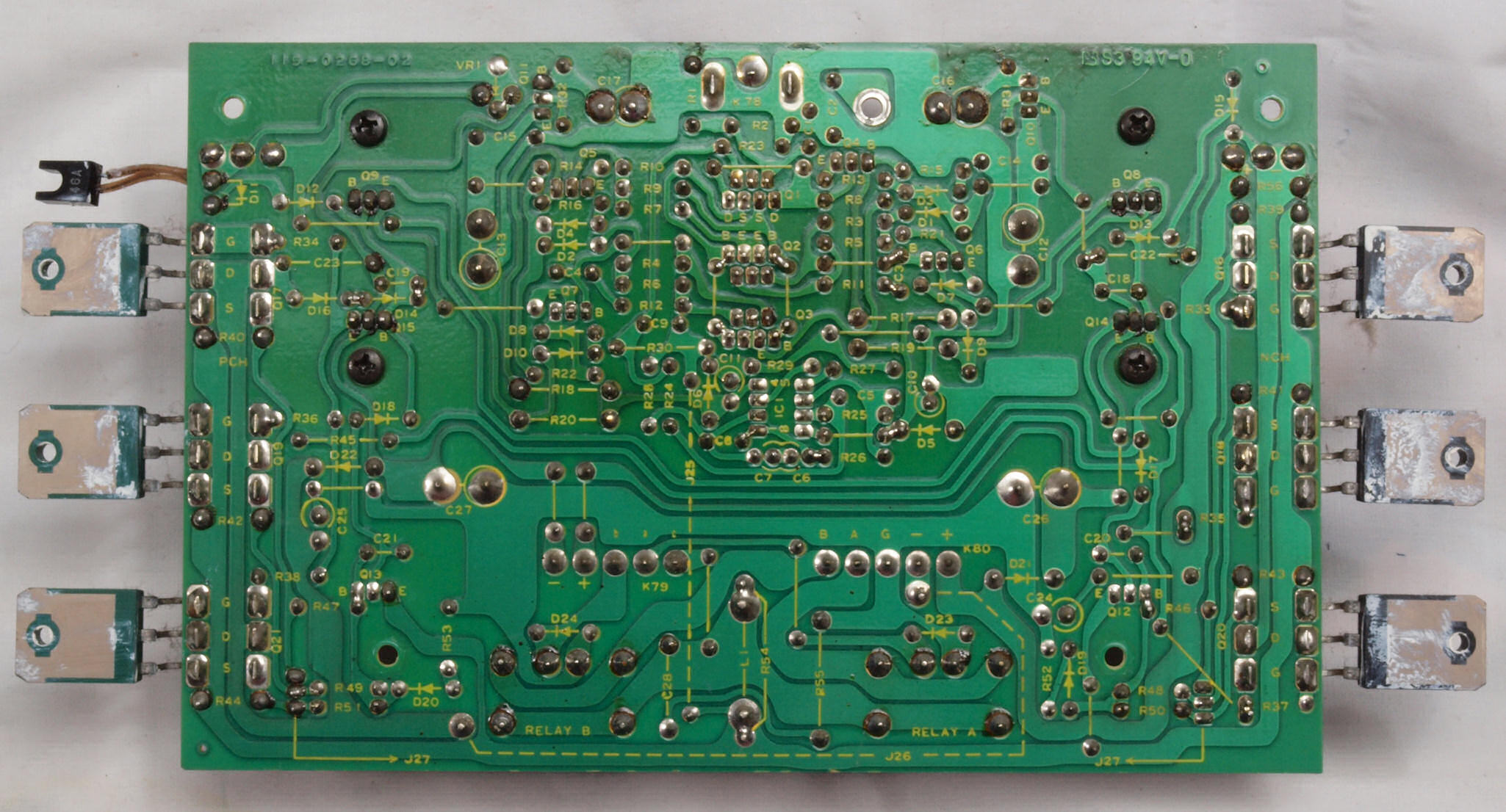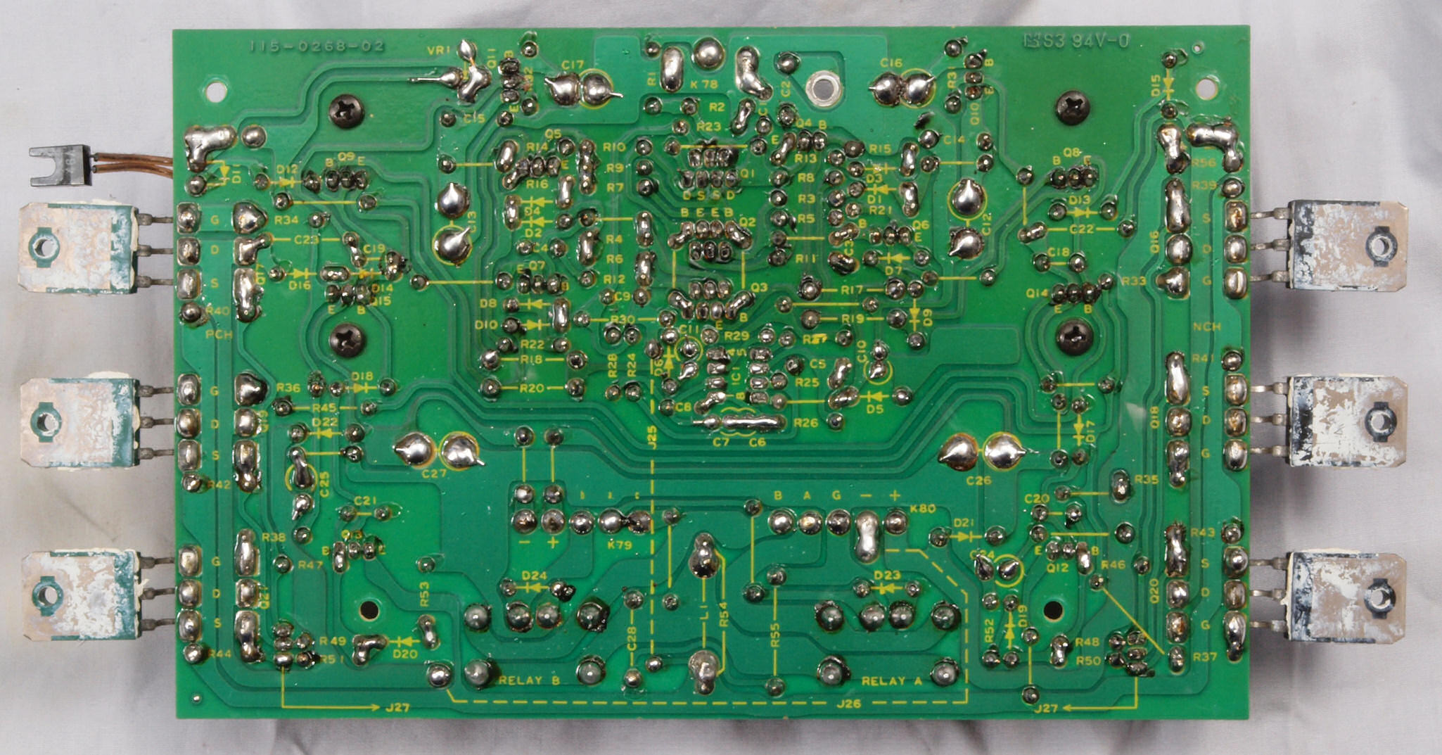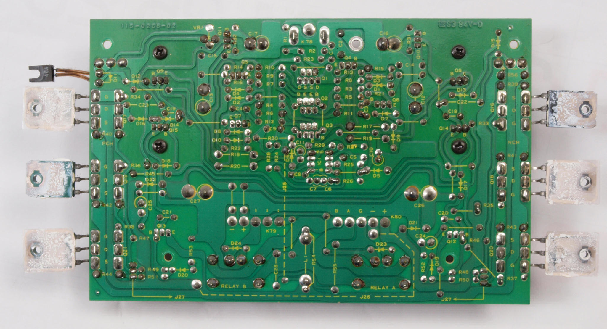 | C12. 修理後 右側終段基板。 電解コンデンサー11個、リレー2個、初段複合FET(電界効果トランジスター)1個、OP−AMP1個、テフロン絶縁シート6枚交換。 | ||||||||||||||||||||||||||||||||||||||||||||||||||||||||||||||||||||||||||||||||||||||