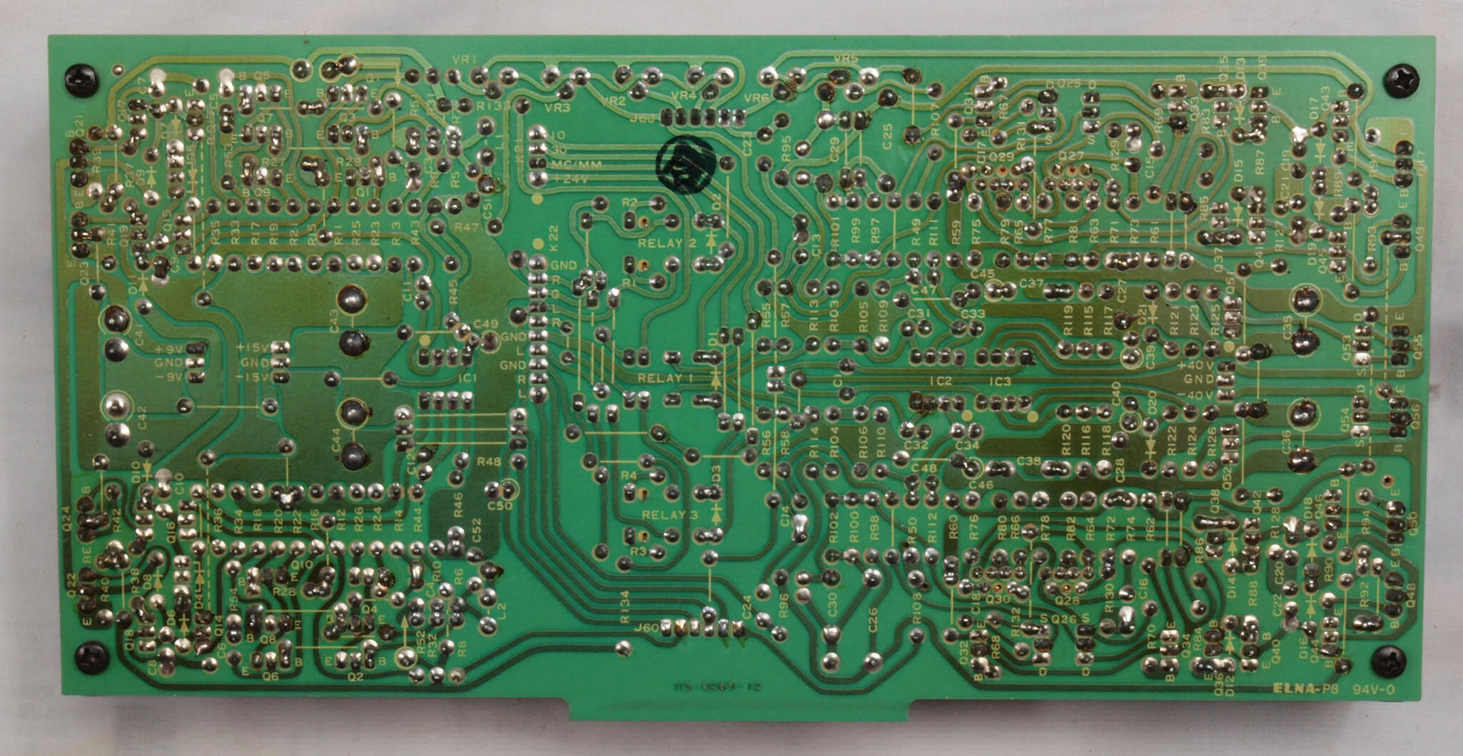 | CC4. 修理後(半田補正) ヘッドアンプ/イコライザーアンプ基板裏。 半田を全部やり直す。 | ||||||||||||||||||||||||||||||||||||||||||||||||||||||||||||||||||||||||||||||||||||||