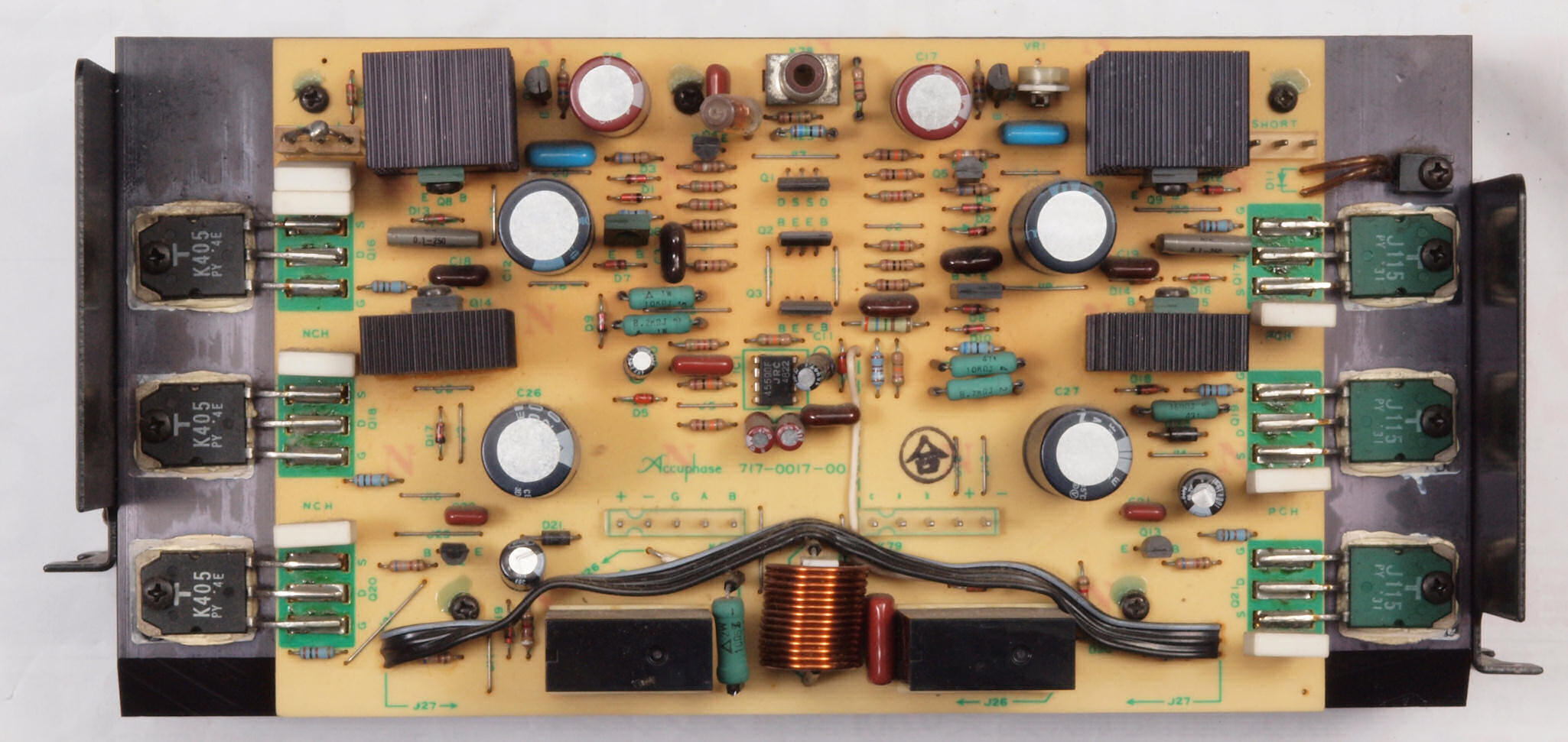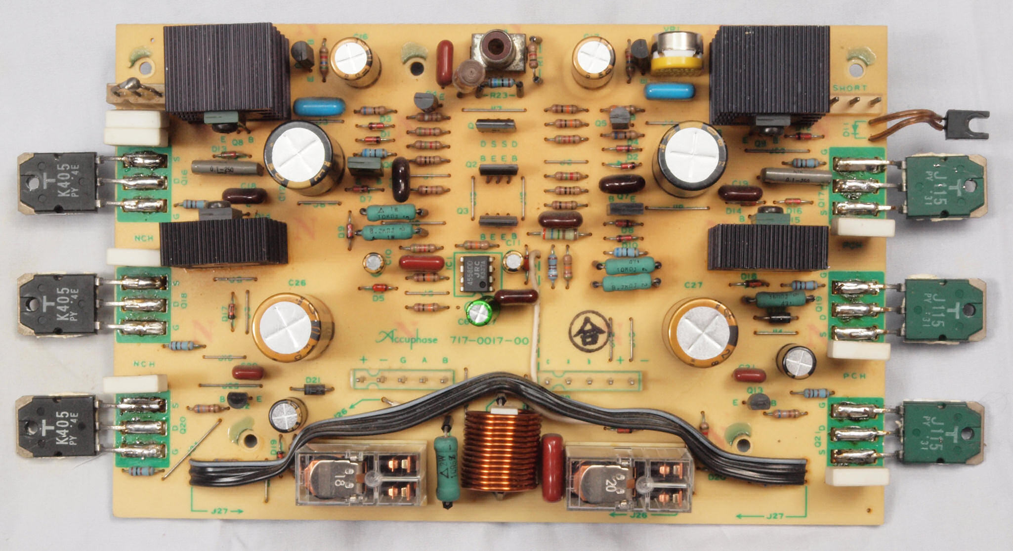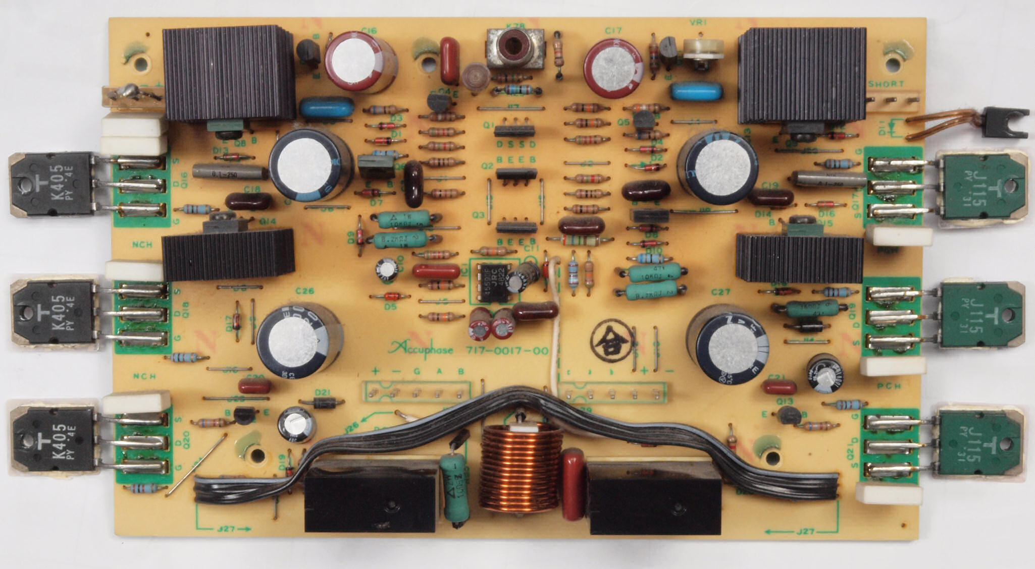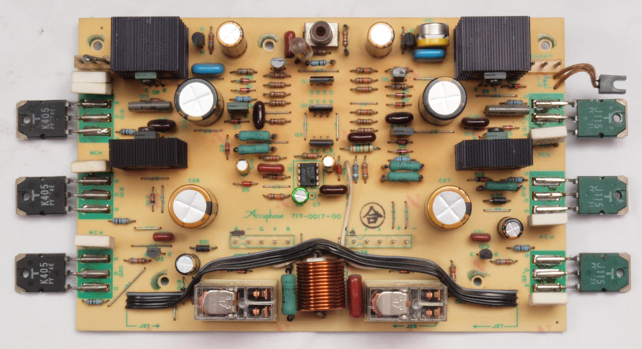 | C22. 修理後 左側終段基板。電解コンデンサー11個、リレー2個、初段複合FET(電界効果トランジスター)1個、OP−AMP1個、テフロン絶縁シート6枚交換。 | ||||||||||||||||||||||||||||||||||||||||||||||||||||||||||||||||||||||||||||||||||||||