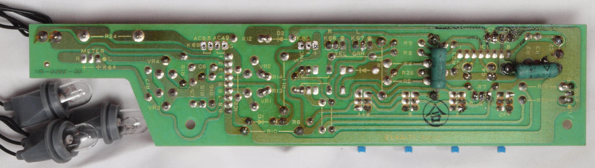 | CF1. 修理前 スピーカー選択SW/VUアンプ基板。 メーター照明ランプは駆動電圧が低く綺麗。 | ||||||||||||||||||||||||||||||||||||||||||||||||||||||||||||||||||||||||||||||||||||||