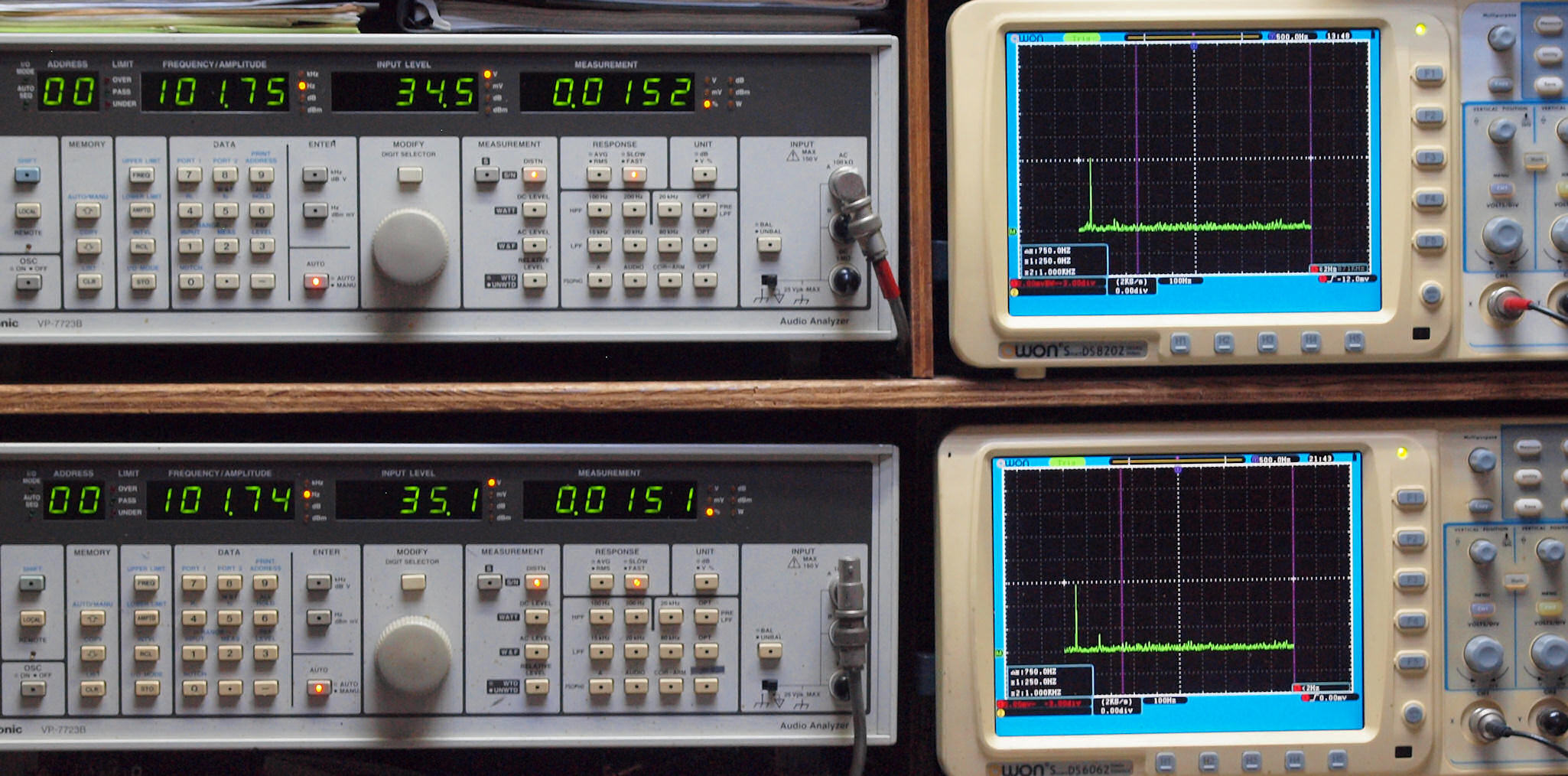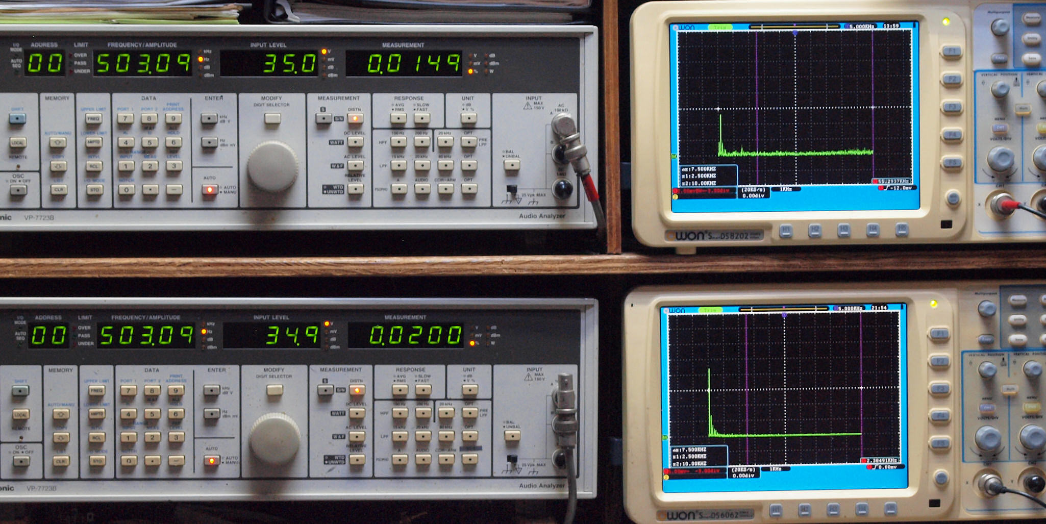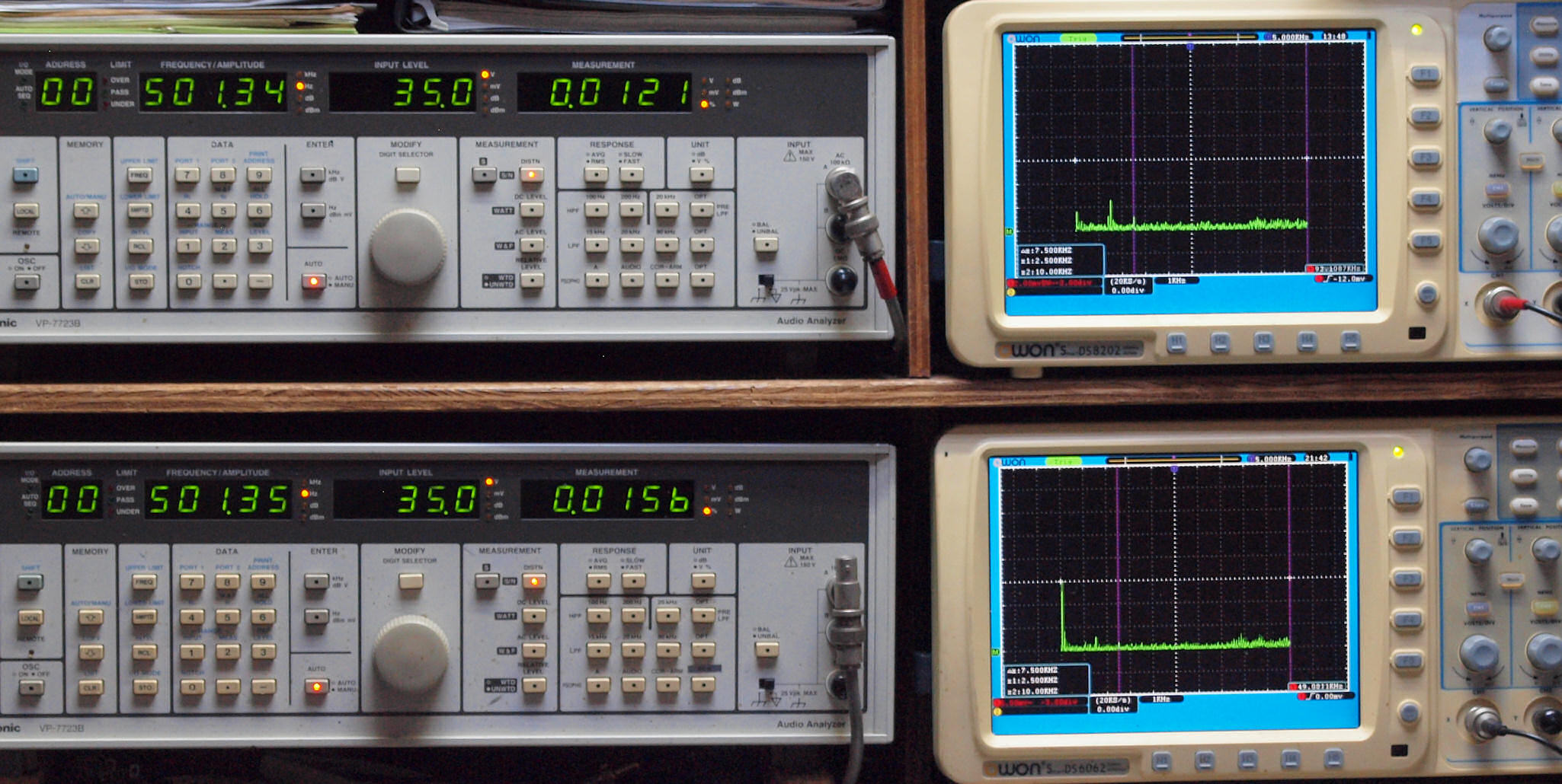 | E. 測定・調整。 画像をクリックすると、大きく(横幅2050ドット)表示されます。 E1. 出力・歪み率測定・調整 「見方」。 上段中 右側SP出力を「Audio Analyzer Panasonic VP−7723B」により測定。 表示LED、 左端=メモリーNo、 中左=周波数測定、 中右=出力電圧測定、 右端=歪み率測定。 上段右端 VP−7723Bの基本波除去出力を「owon SDS8202(200MHZ)」で「FFT分析」表示。 下段中 左側SP出力を「Audio Analyzer Panasonic VP−7723B」により測定。 表示LED、 左端=メモリーNo、 中左=周波数測定、 中右=出力電圧測定、 右端=歪み率測定。 下段右端 VP−7723Bの基本波除去出力を「owon SDS6062(200MHZ)」で「FFT分析」表示。 下段左端 オーディオ発振器 VP−7201A より50Hz〜100kHzの信号を出し(歪み率=約0.003%)、ATT+分配器を通し、AMPに入力。 よって、ダイアル設定出力レベルより低くなります。測定機器の仕様や整備の様子はこちら、「VP−7723B」「VP−7201A」。 FFT画面の見方はこちら。 |