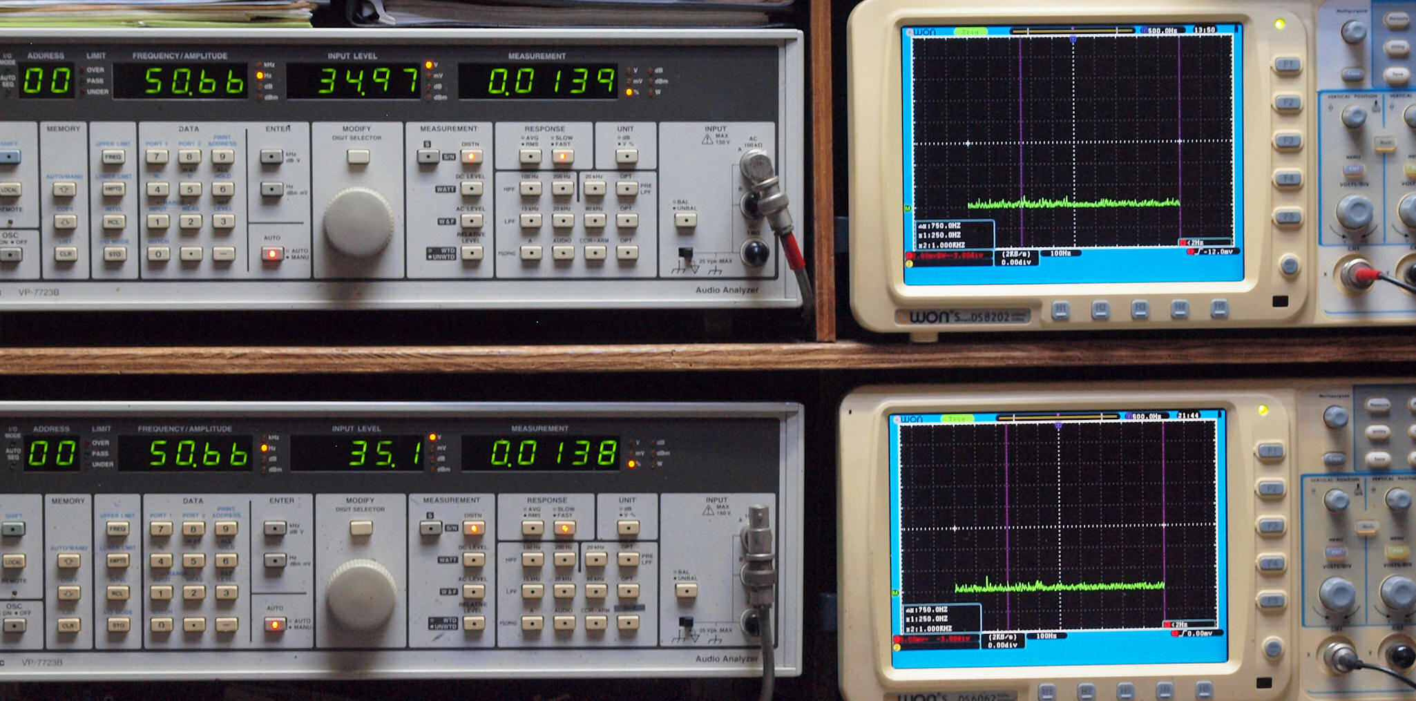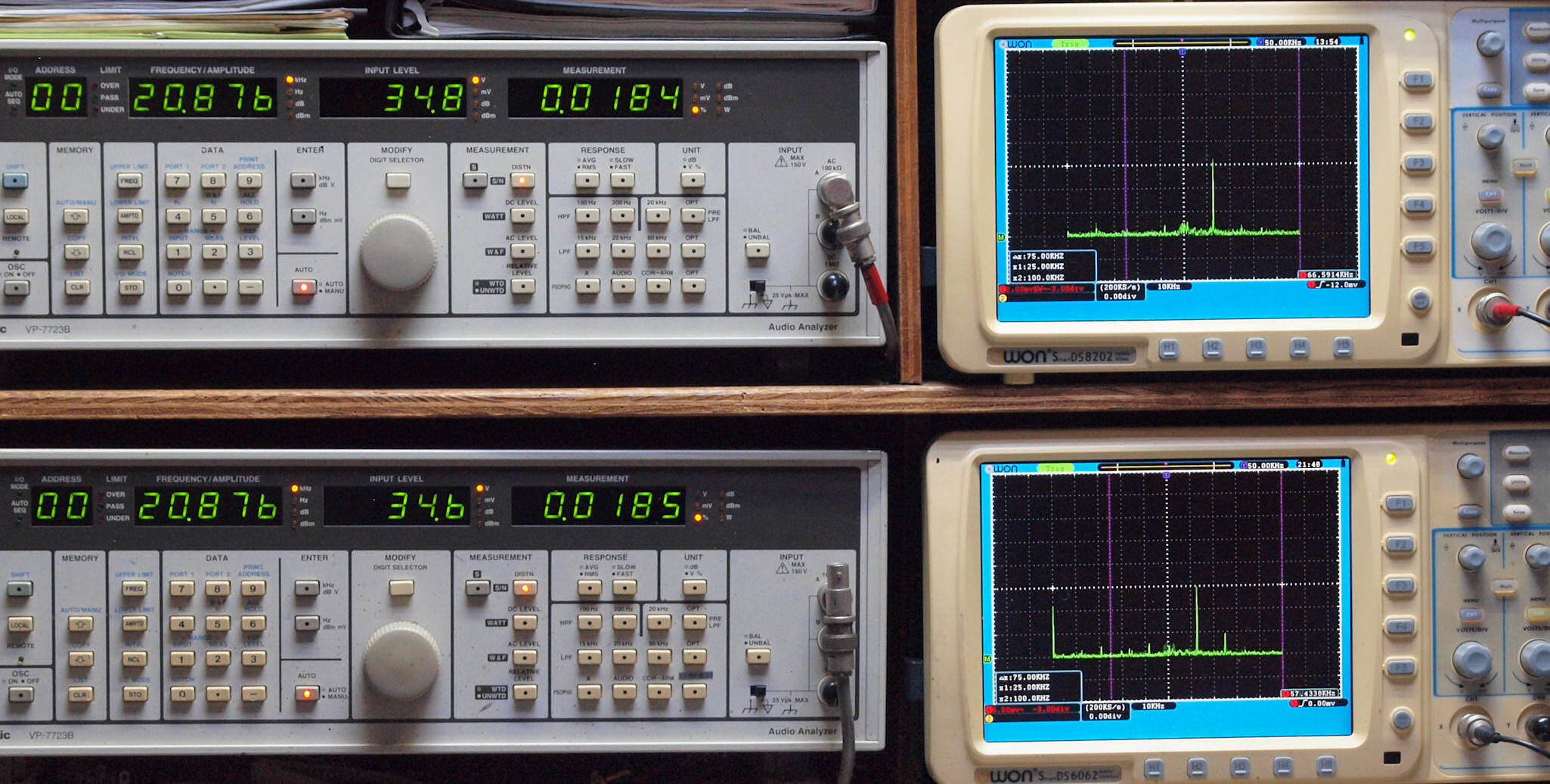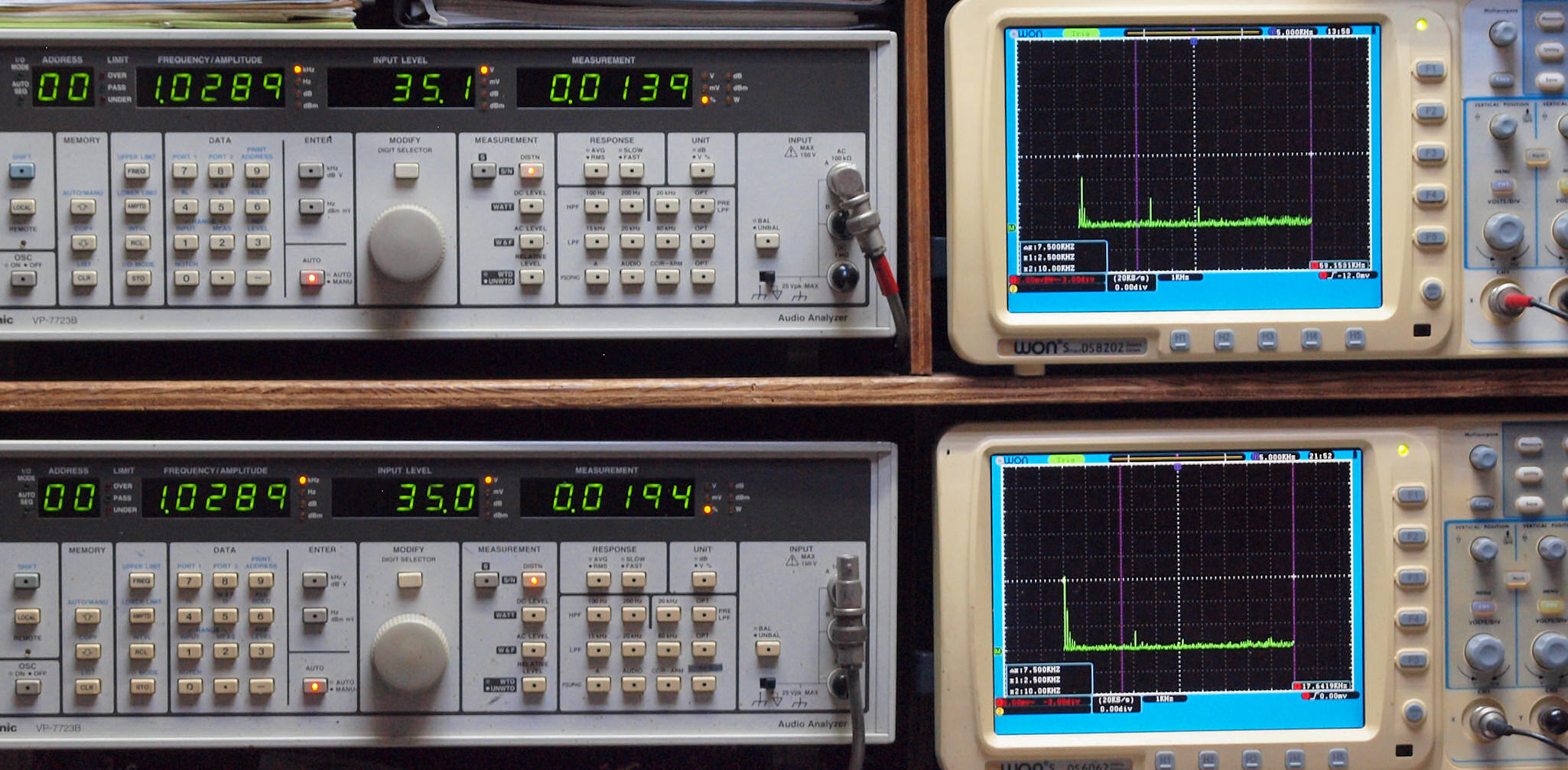 | E. 測定・調整。 画像をクリックすると、大きく(横幅2050ドット)表示されます。 E1. 出力・歪み率測定・調整 「見方」。 上段中 右側SP出力を「Audio Analyzer Panasonic VP−7723B」により測定。 表示LED、 左端=メモリーNo、 中左=周波数測定、 中右=出力電圧測定、 右端=歪み率測定。 上段右端 VP−7723Bの基本波除去出力を「owon SDS8202(200MHZ)」で「FFT分析」表示。 下段中 左側SP出力を「Audio Analyzer Panasonic VP−7723B」により測定。 表示LED、 左端=メモリーNo、 中左=周波数測定、 中右=出力電圧測定、 右端=歪み率測定。 下段右端 VP−7723Bの基本波除去出力を「owon SDS6062(200MHZ)」で「FFT分析」表示。 下段左端 オーディオ発振器 VP−7201A より50Hz〜100kHzの信号を出し(歪み率=約0.003%)、ATT+分配器を通し、AMPに入力。 よって、ダイアル設定出力レベルより低くなります。測定機器の仕様や整備の様子はこちら、「VP−7723B」「VP−7201A」。 FFT画面の見方はこちら。 |