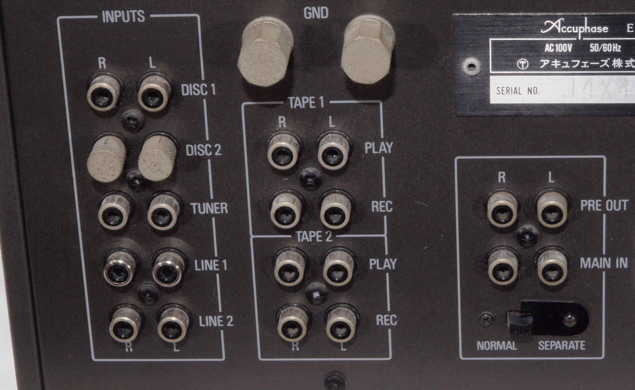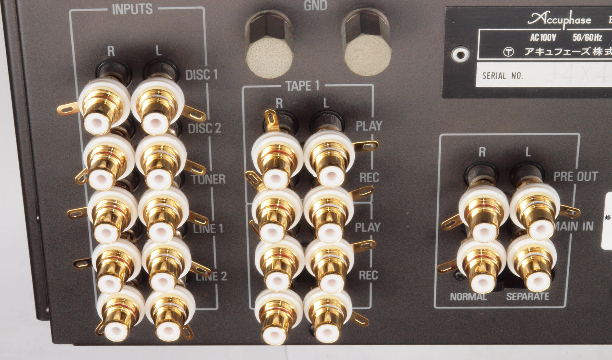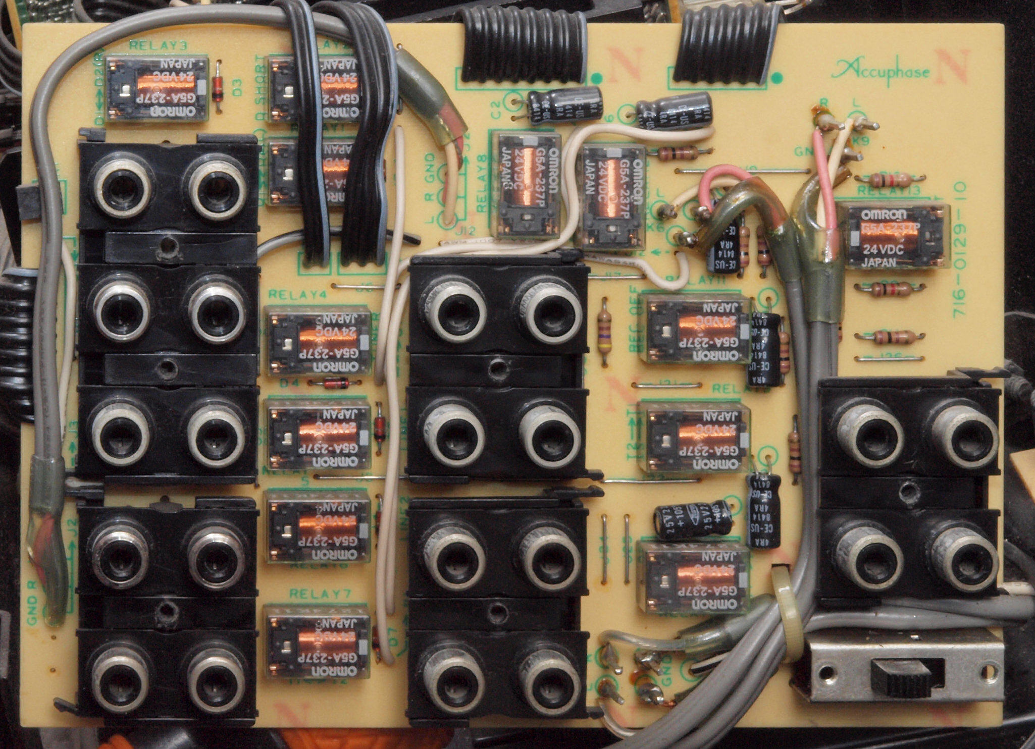 | A42. 点検中 入力RCA端子郡。 テフロン絶縁RCA端子に交換可能、今回見送り。 WBT−0201は定価で工賃込みです。 | ||||||||||||||||||||||||||||||||||||||||||||||||||||||||||||||||||||||||||||||||||||||