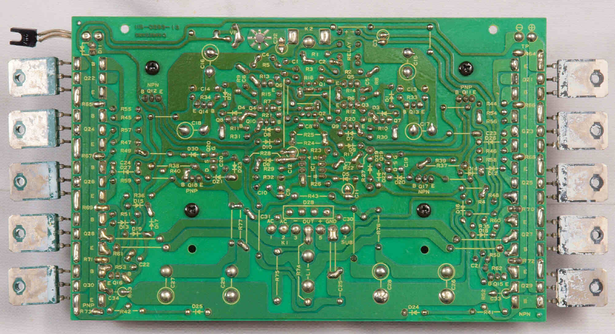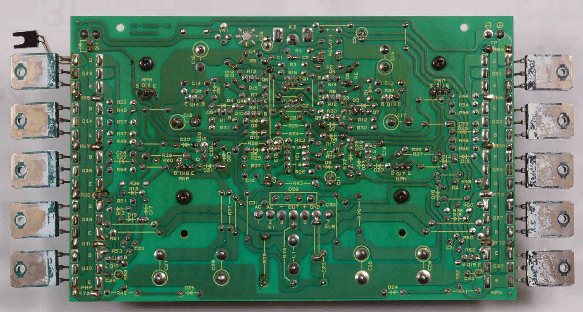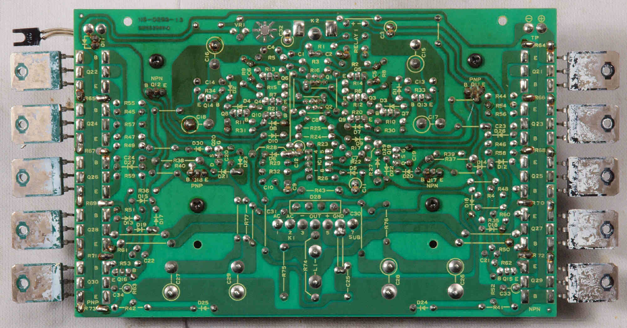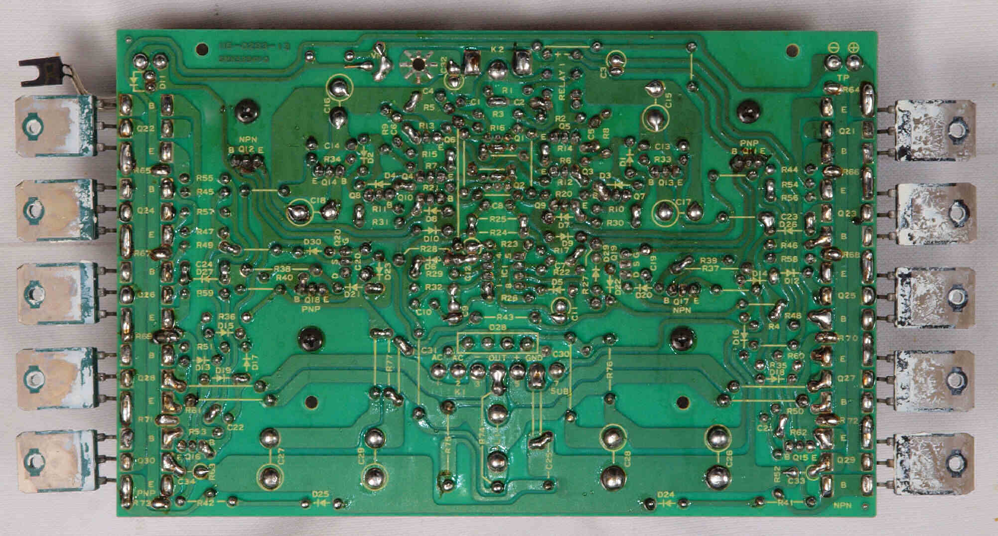 | C22. 修理後 L側ドライブ基板。 OP-AMP1個、リレー1個、電解コンデンサー11個、半固定VR1個交換。 | ||||||||||||||||||||||||||||||||||||||||||