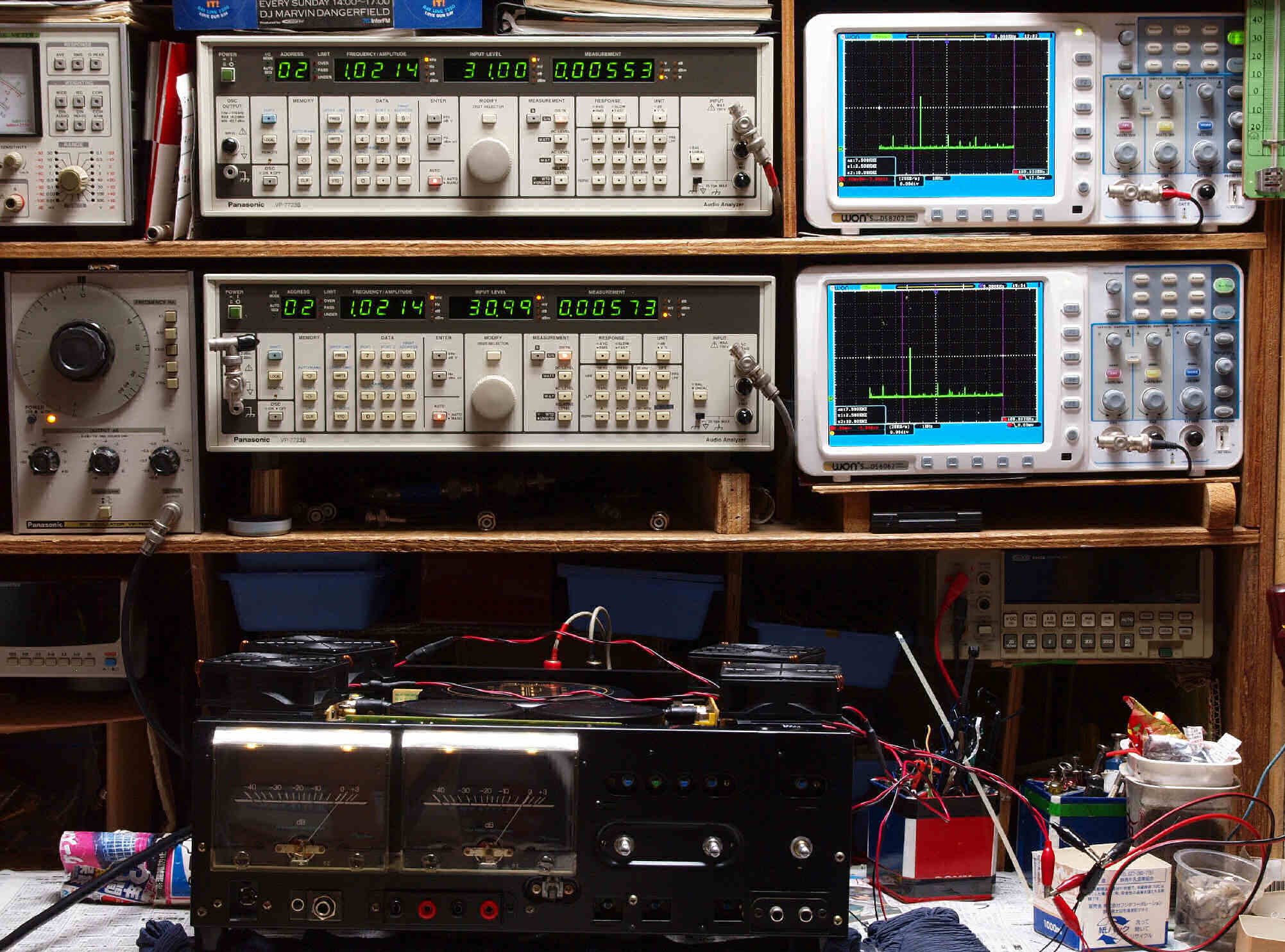| E. 調整・測定 E1. 出力・歪み率測定・調整。 「見方」。 上段中 右側SP出力を「Audio Analyzer Panasonic VP−7723B」により測定。 表示LED、 左端=メモリーNo、 中左=周波数測定、 中右=出力電圧測定、 右端=歪み率測定。 上段右端 VP−7723Bの基本波除去出力を「owon SDS8202(200MHZ)」で「FFT分析」表示。 下段中 左側SP出力を「Audio Analyzer Panasonic VP−7723B」により測定。 表示LED、 左端=メモリーNo、 中左=周波数測定、 中右=出力電圧測定、 右端=歪み率測定。 下段右端 VP−7723Bの基本波除去出力を「owon SDS6062(200MHZ)」で「FFT分析」表示。 下段左端 オーディオ発振器 VP−7201A より50Hz〜100kHzの信号を出し(歪み率=約0.003%)、ATT+分配器を通し、AMPに入力。 よって、ダイアル設定出力レベルより低くなります。測定機器の仕様や整備の様子はこちら、「VP−7723B」「VP−7201A」。 FFT画面の見方はこちら。 |