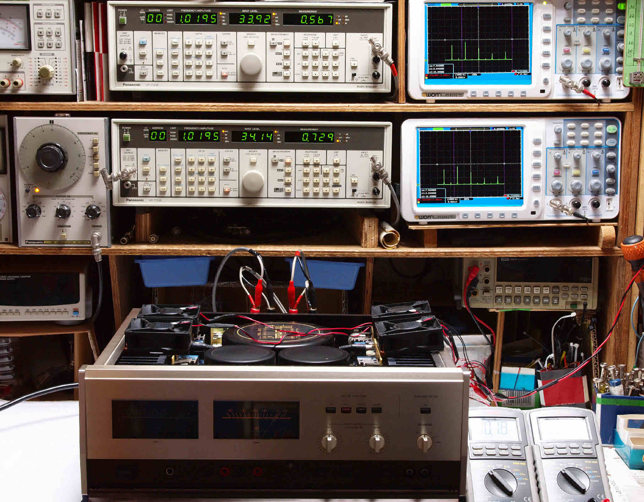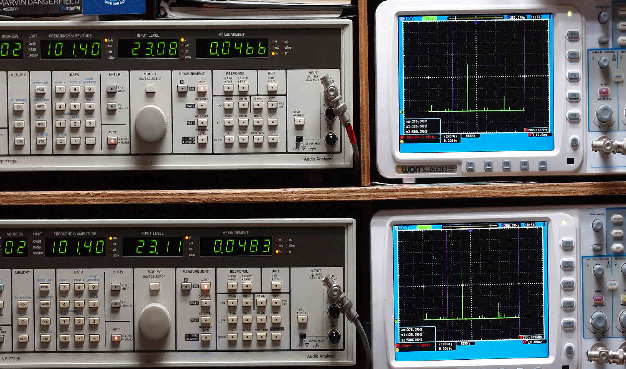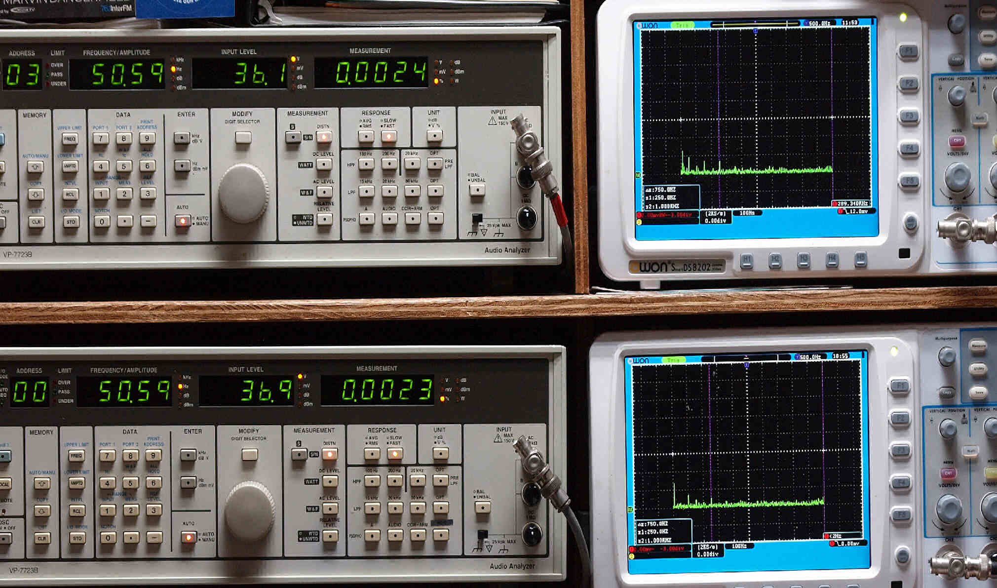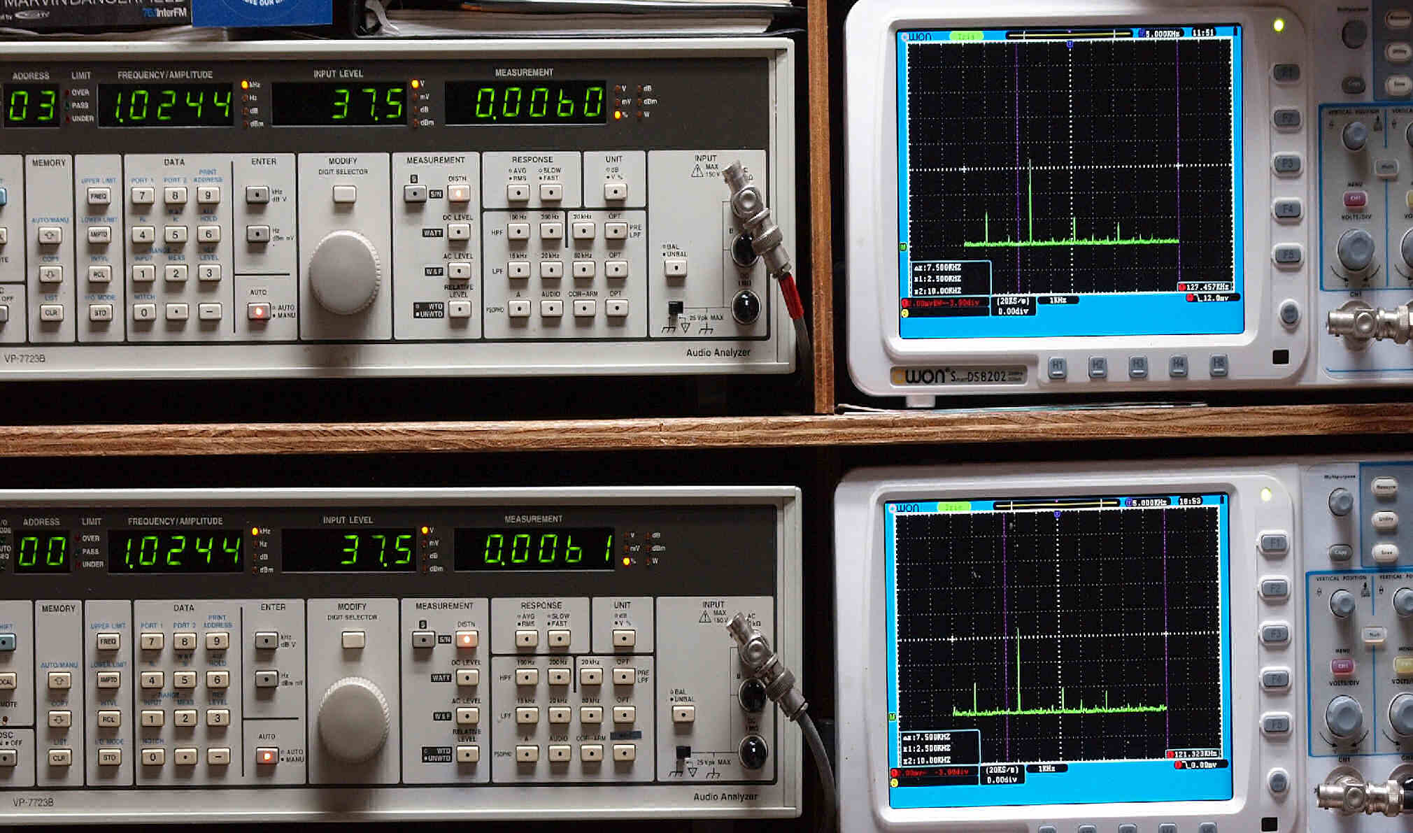 | T. 修理前点検測定 T1. 出力・歪み率測定・調整。 「見方」。 上段中 右側SP出力を「Audio Analyzer Panasonic VP−7723B」により測定。 表示LED、 左端=メモリーNo、 中左=周波数測定、 中右=出力電圧測定、 右端=歪み率測定。 上段右端 VP−7723Bの基本波除去出力を「owon SDS8202(200MHZ)」で「FFT分析」表示。 下段中 左側SP出力を「Audio Analyzer Panasonic VP−7723B」により測定。 表示LED、 左端=メモリーNo、 中左=周波数測定、 中右=出力電圧測定、 右端=歪み率測定。 下段右端 VP−7723Bの基本波除去出力を「owon SDS6062(200MHZ)」で「FFT分析」表示。 下段左端 オーディオ発振器 VP−7201A より50Hz〜100kHzの信号を出し(歪み率=約0.003%)、ATT+分配器を通し、AMPに入力。 よって、ダイアル設定出力レベルより低くなります。測定機器の仕様や整備の様子はこちら、「VP−7723B」「VP−7201A」。 FFT画面の見方はこちら。 |
