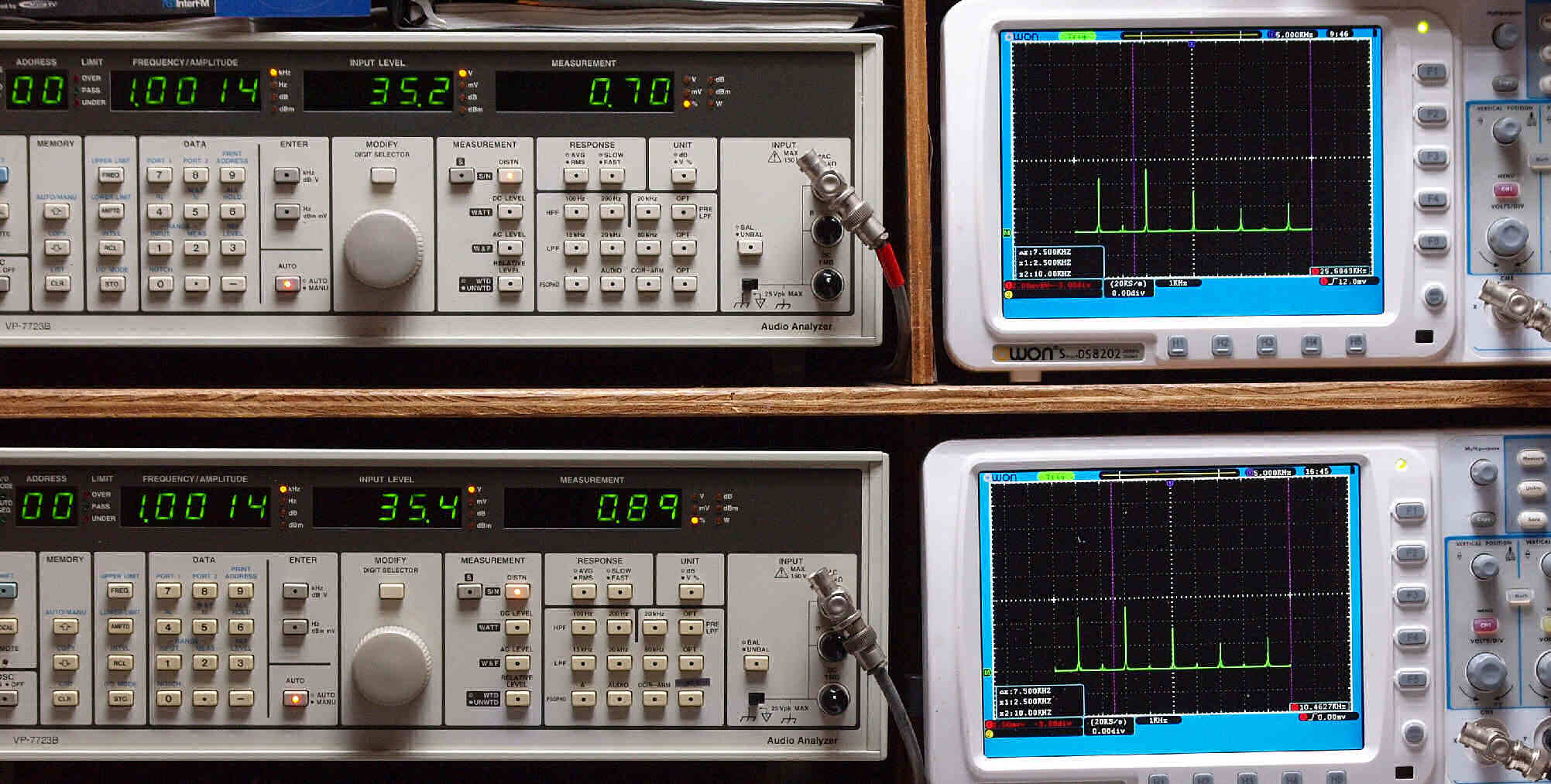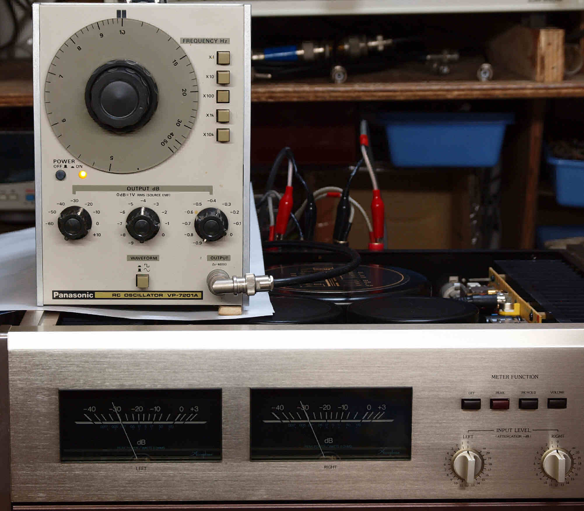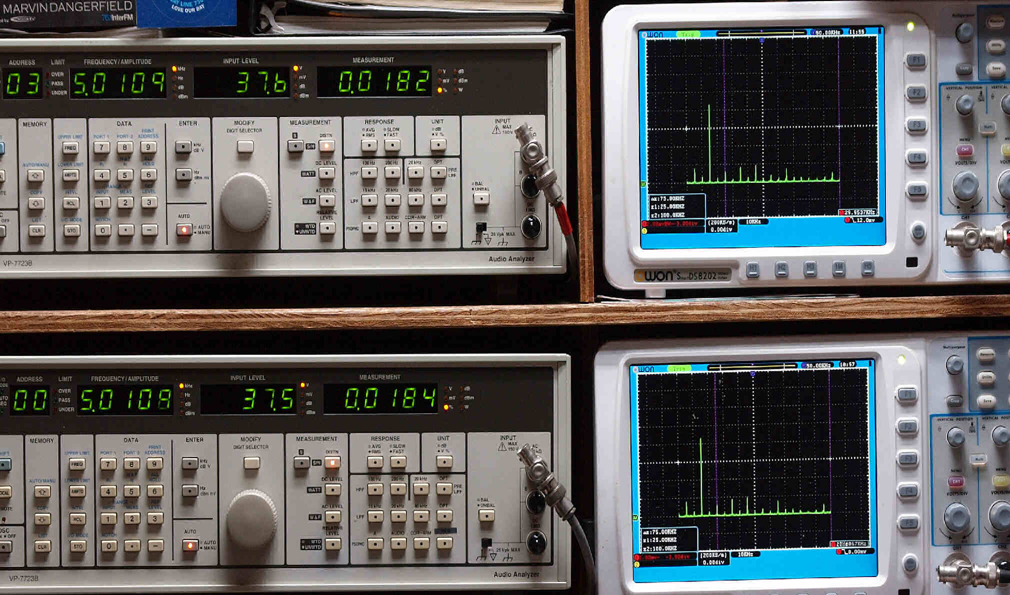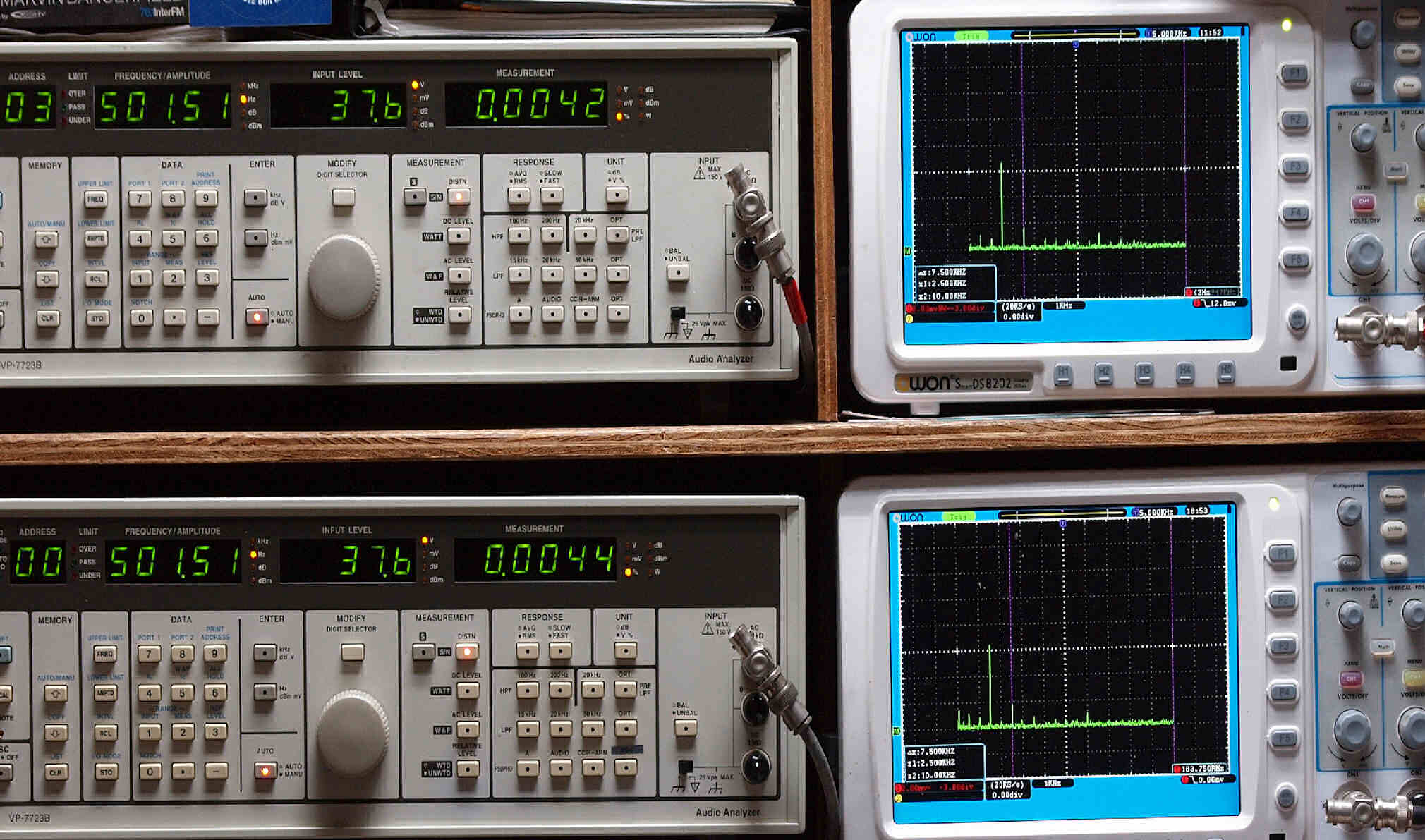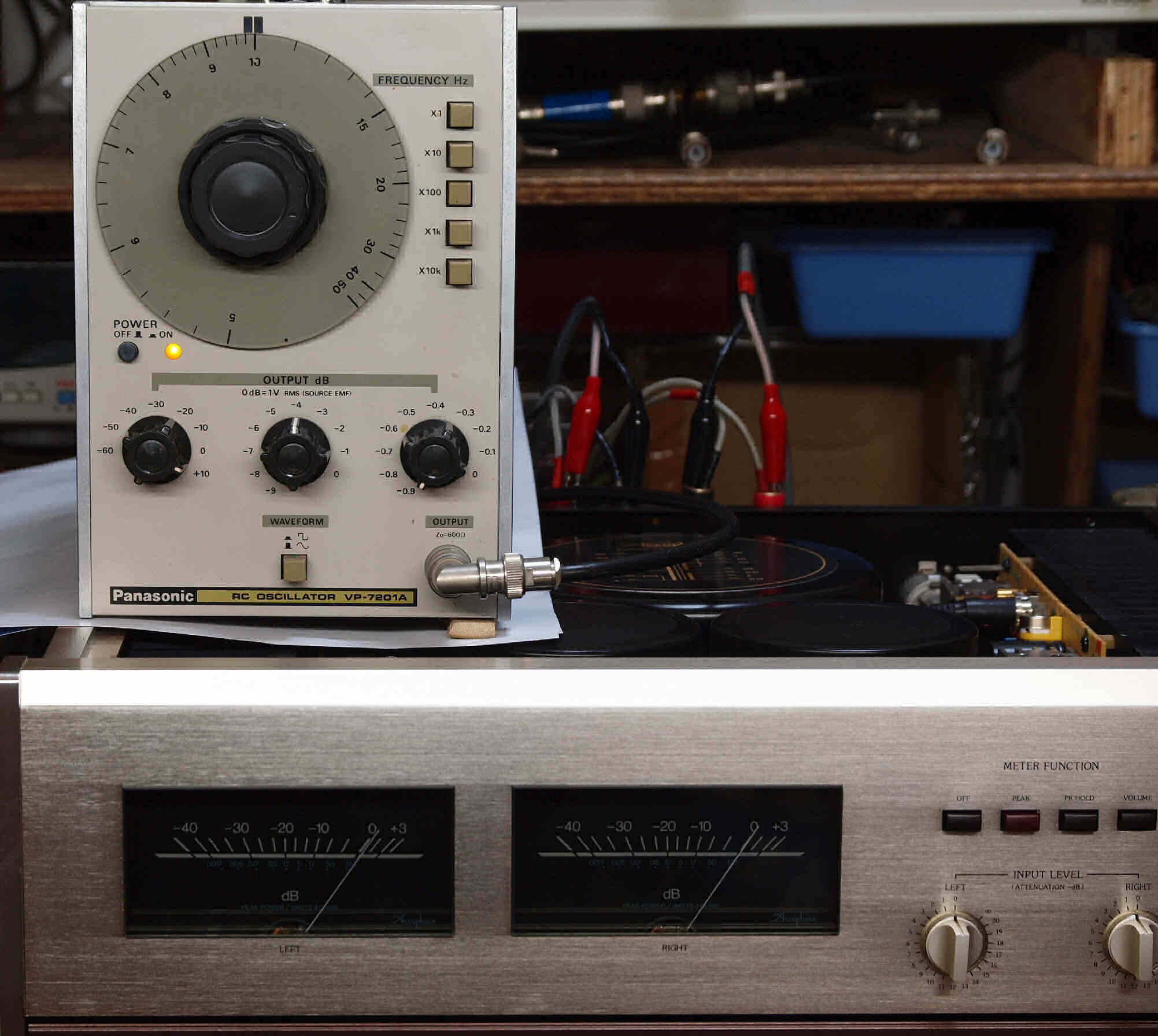 | T. 修理前点検測定 T1. 出力・歪み率測定・調整。 「見方」。 上段中 右側SP出力を「Audio Analyzer Panasonic VP−7723B」により測定。 表示LED、 左端=メモリーNo、 中左=周波数測定、 中右=出力電圧測定、 右端=歪み率測定。 上段右端 VP−7723Bの基本波除去出力を「owon SDS8202(200MHZ)」で「FFT分析」表示。 下段中 左側SP出力を「Audio Analyzer Panasonic VP−7723B」により測定。 表示LED、 左端=メモリーNo、 中左=周波数測定、 中右=出力電圧測定、 右端=歪み率測定。 下段右端 VP−7723Bの基本波除去出力を「owon SDS6062(200MHZ)」で「FFT分析」表示。 下段左端 オーディオ発振器 VP−7201A より50Hz〜100kHzの信号を出し(歪み率=約0.003%)、ATT+分配器を通し、AMPに入力。 よって、ダイアル設定出力レベルより低くなります。測定機器の仕様や整備の様子はこちら、「VP−7723B」「VP−7201A」。 FFT画面の見方はこちら。 |
