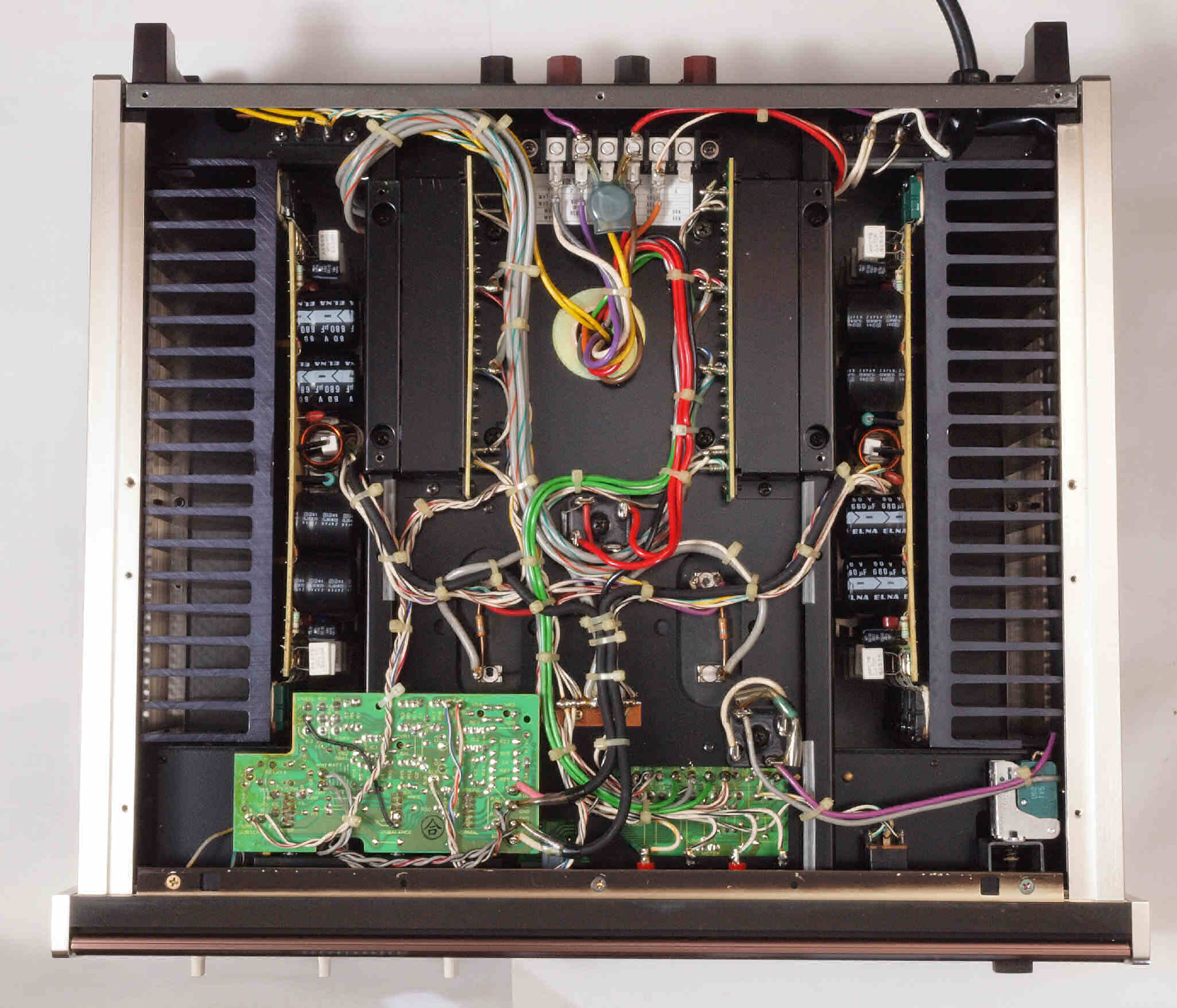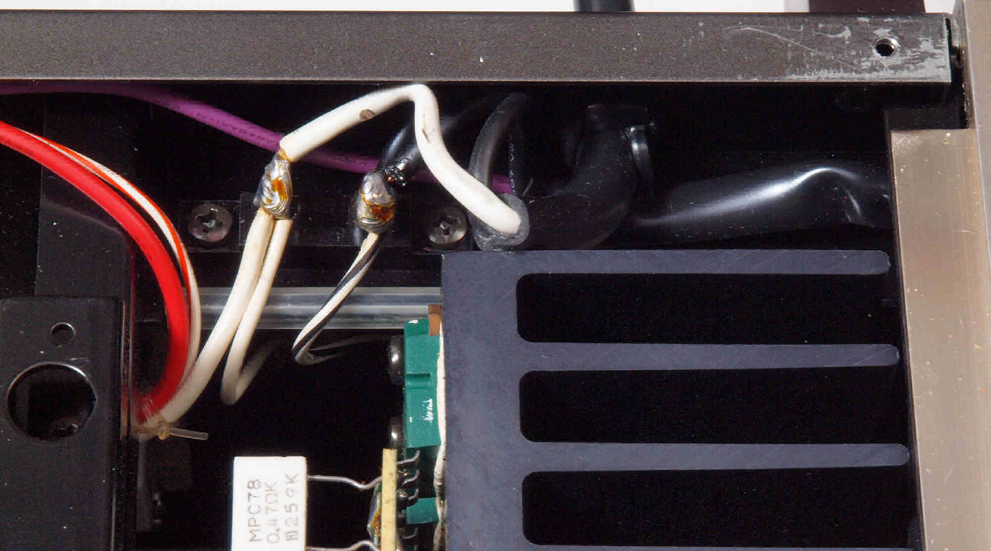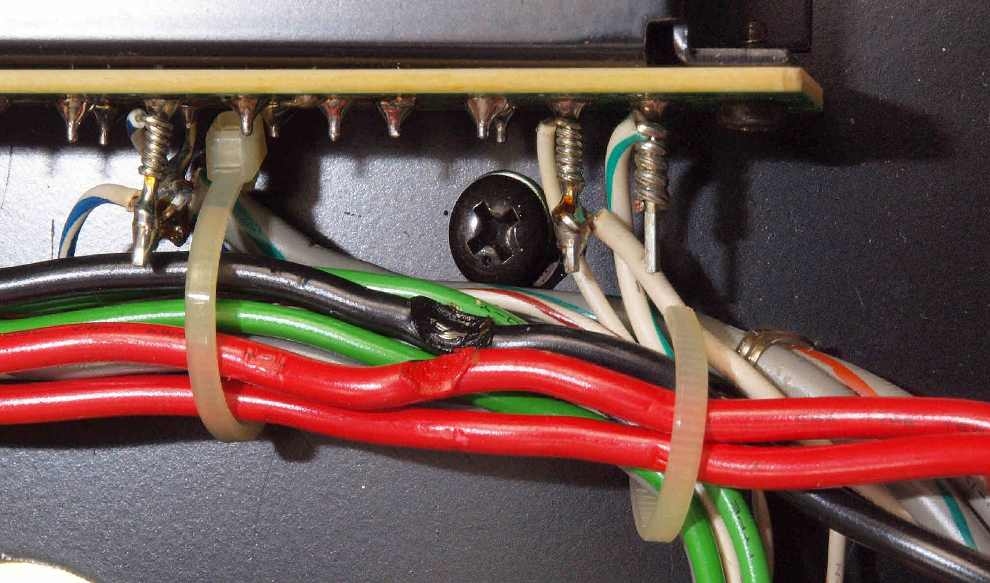 | A42. 点検中 SP接続リレーを交換時半田コテで剥けた配線(終段への電源供給電源線)。 忙しいのか、インシュロックを取らずに交換した為か? |