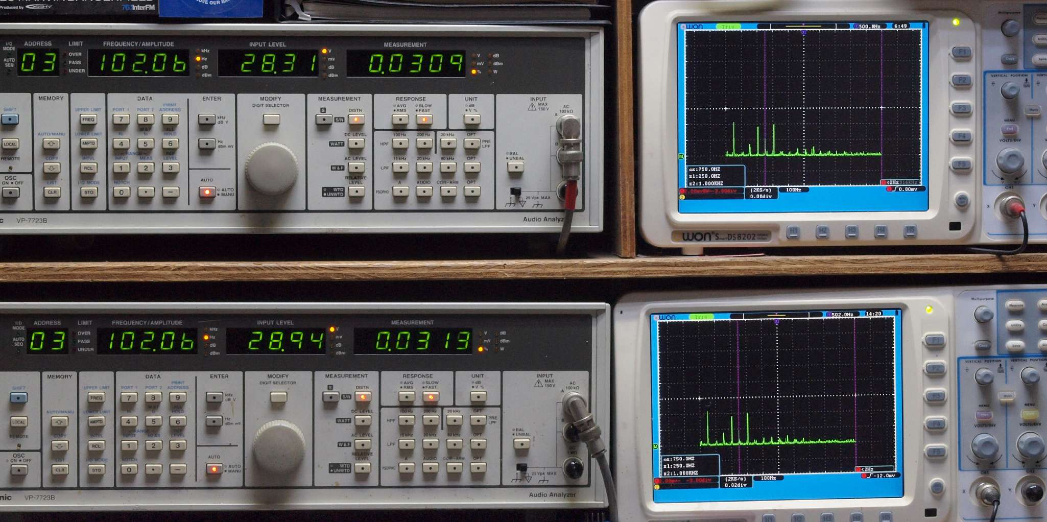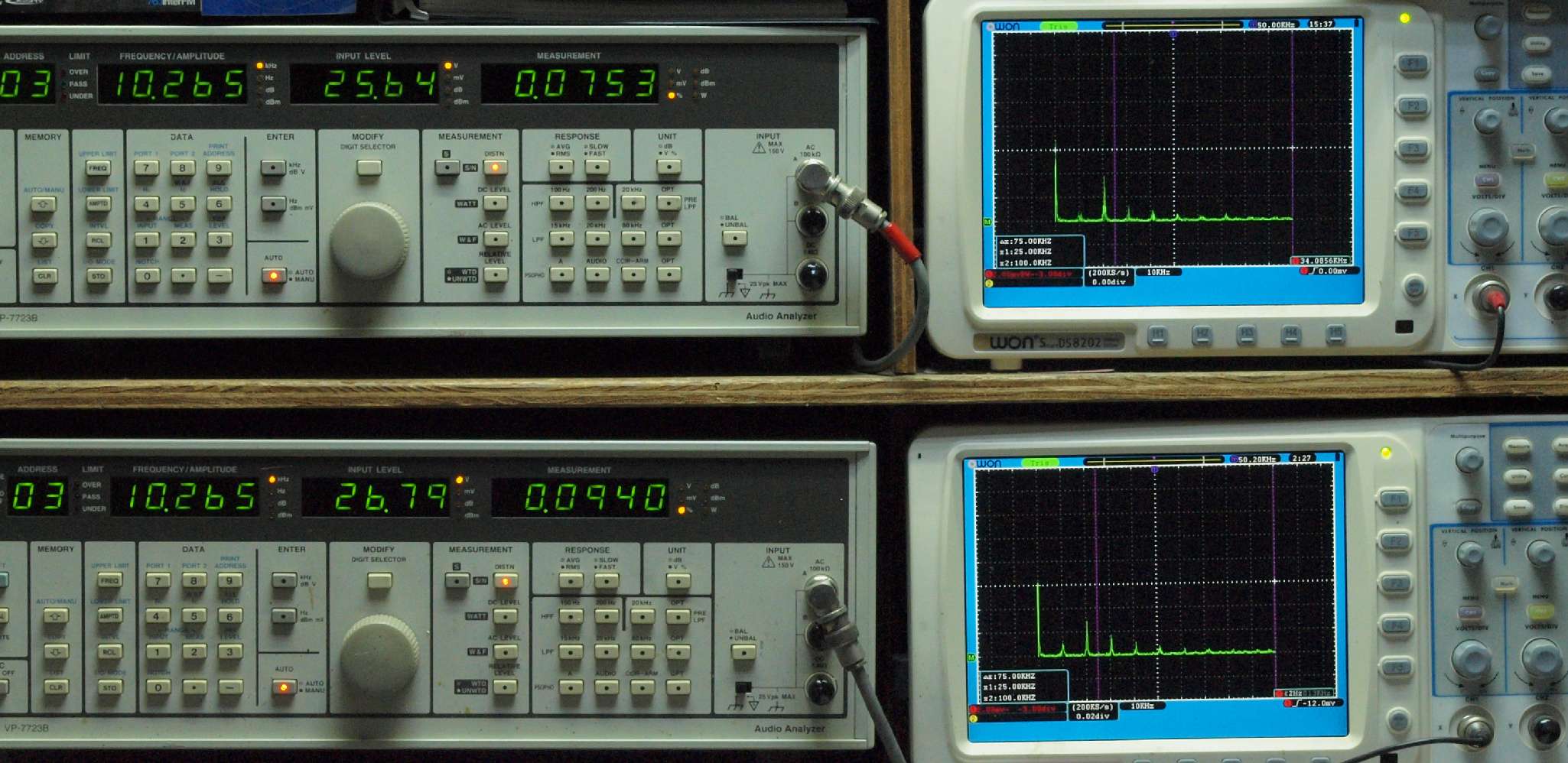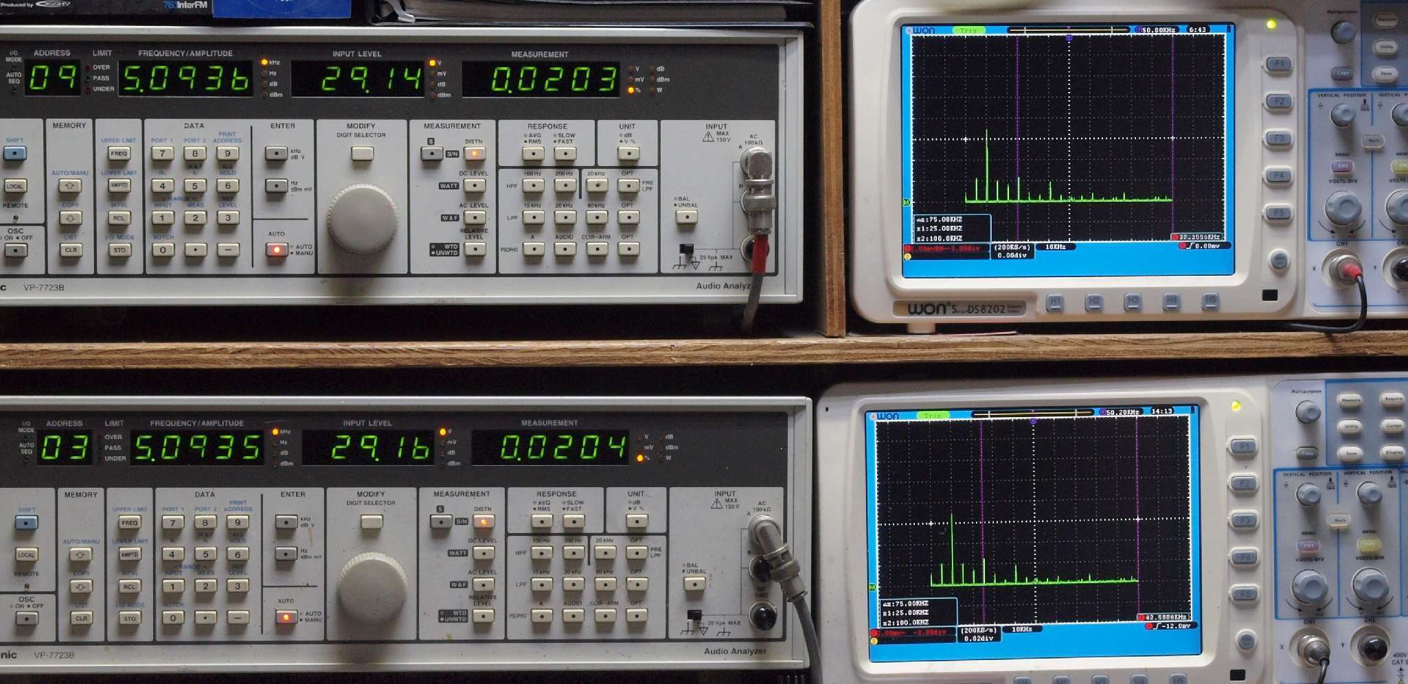 よって、ダイアル設定出力レベルより低くなります。測定機器の仕様や整備の様子はこちら、「VP−7723B」「VP−7201A」。 FFT画面の見方はこちら。
