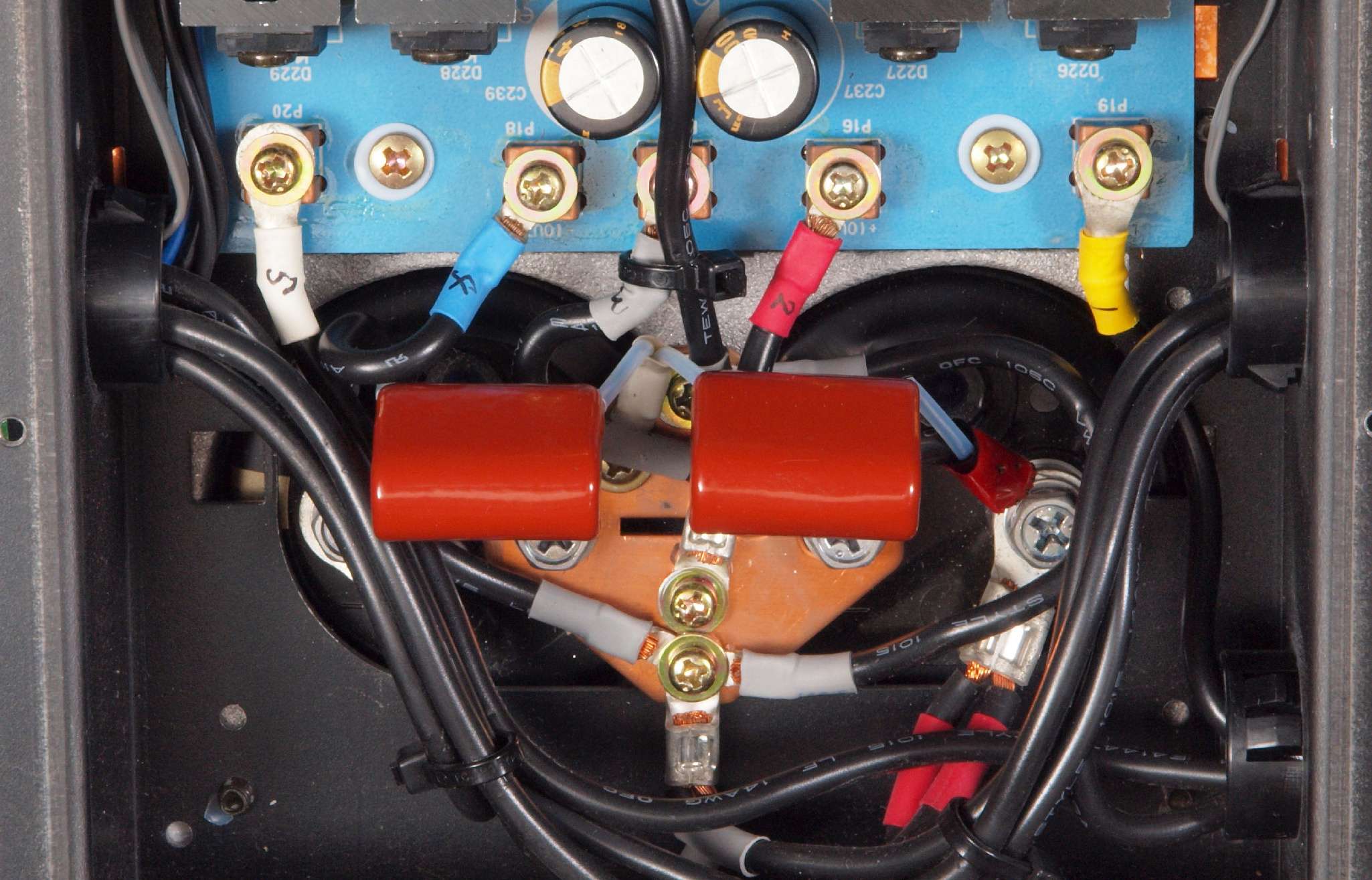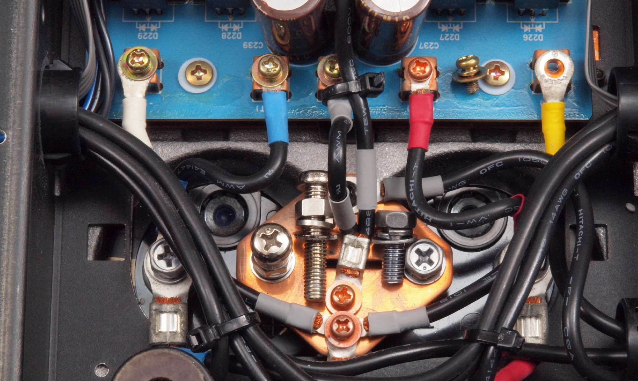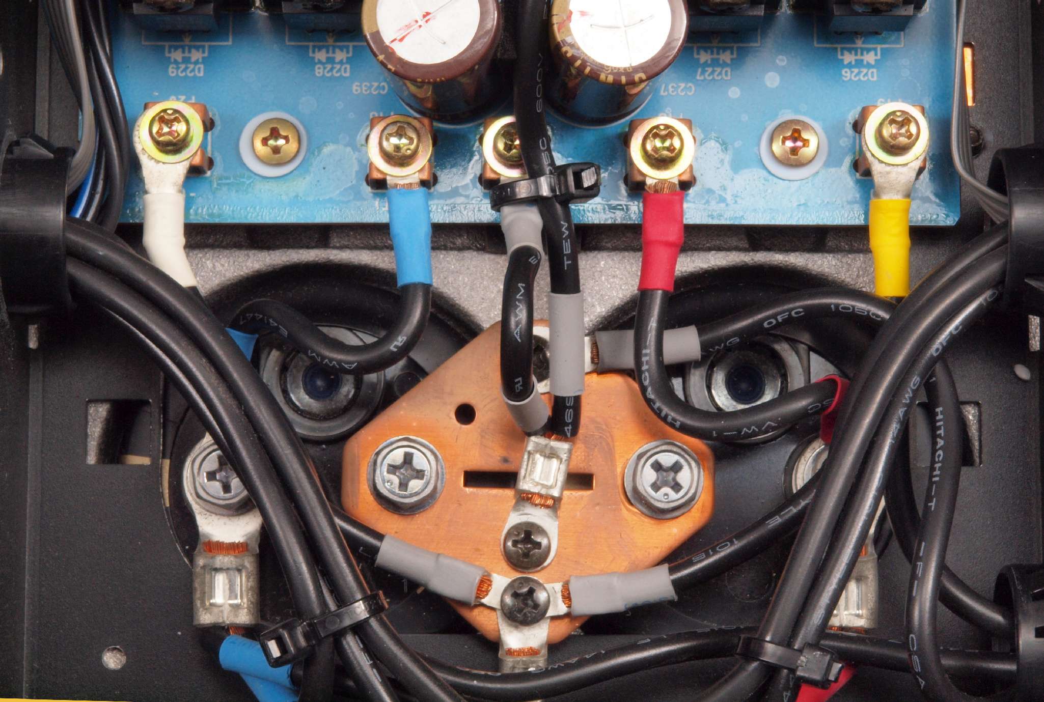 A34. 点検中 L側メインアンプへの配線、ラグ端子が鉄ビスで止められている。