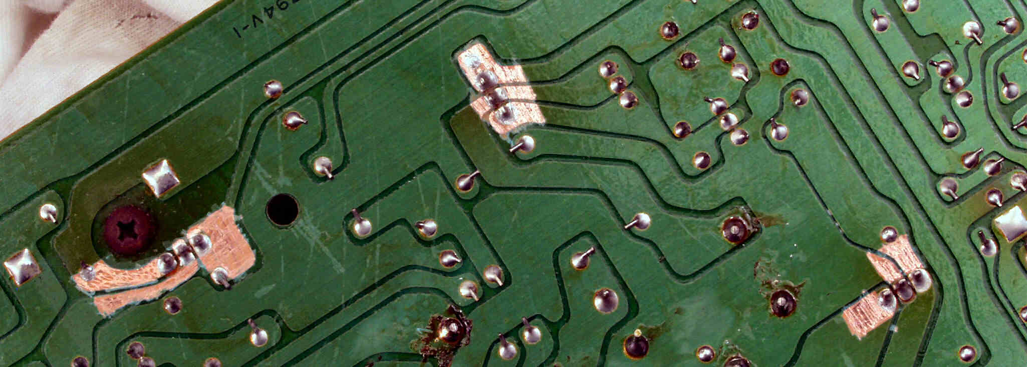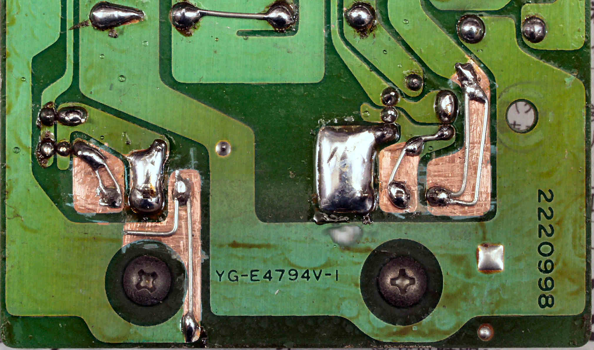 C833. 修理中 電源基板裏 さらに、錫メッキ線で補強する