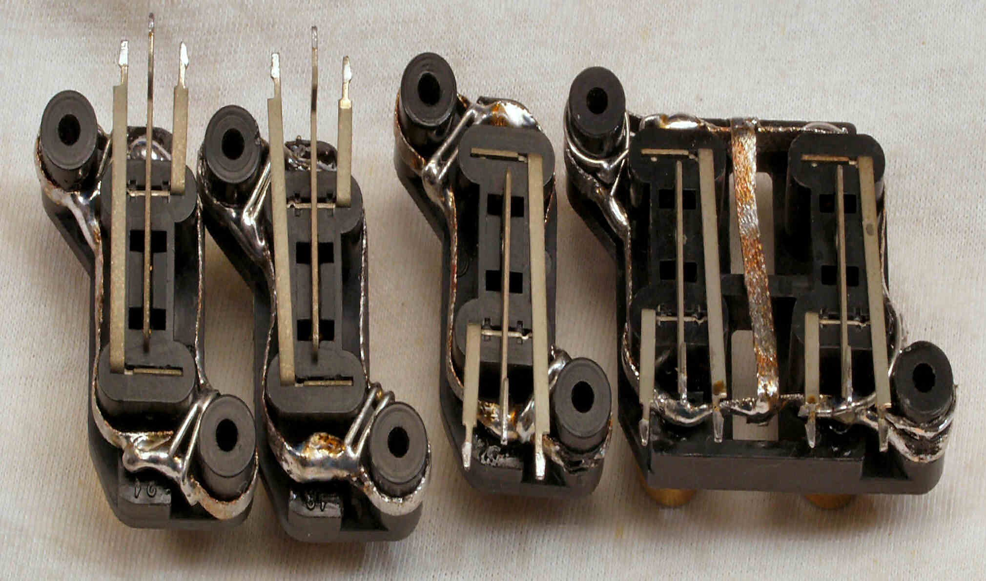 C222. 修理中 EQ−HEAD-AMP基板のRCA端子 半田吸い取り線で補強