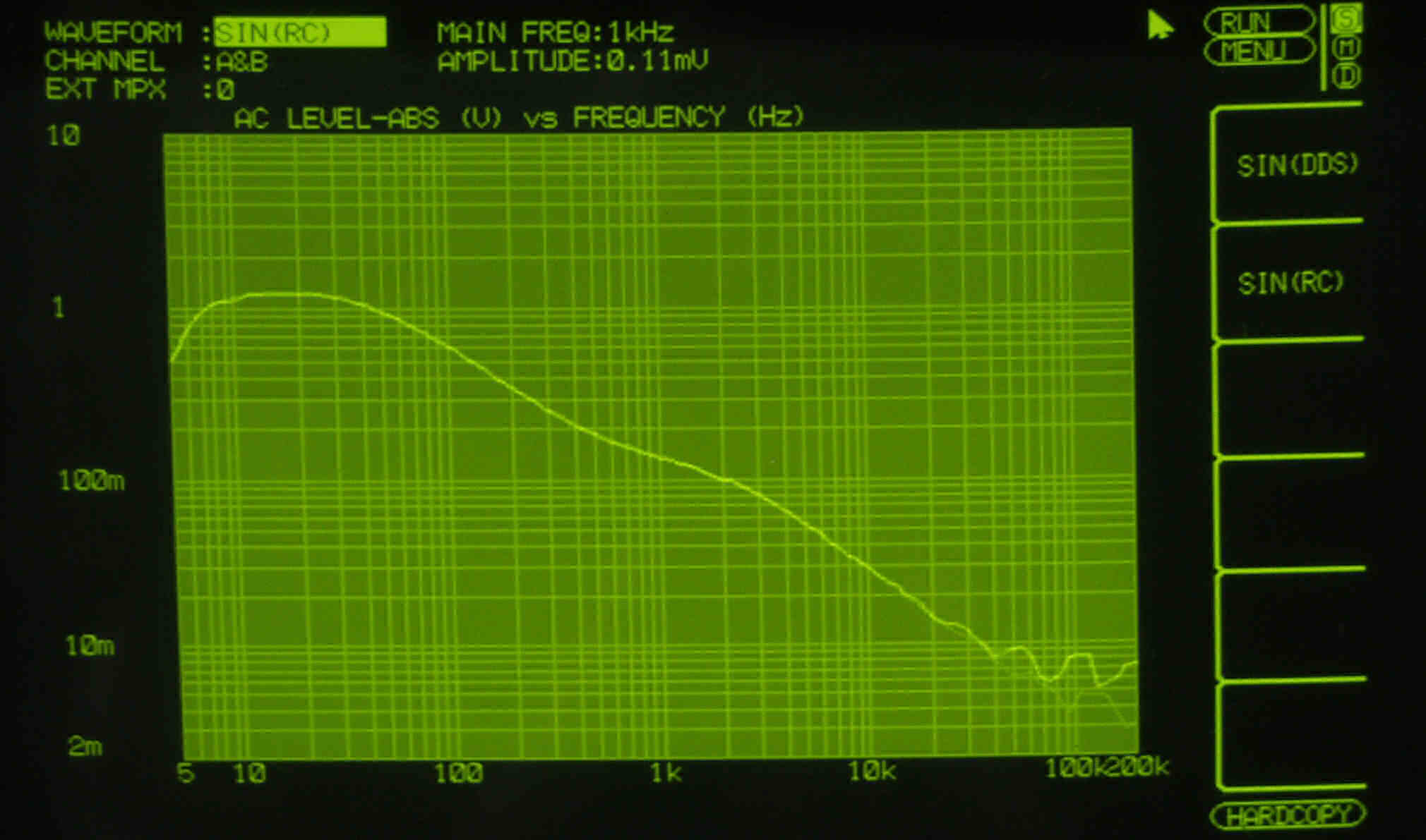 AUX入力端子へ150mV一定入力 VRはmax 平均で1V出力   左出力=薄(細い)色 右出力=濃い(太い)色