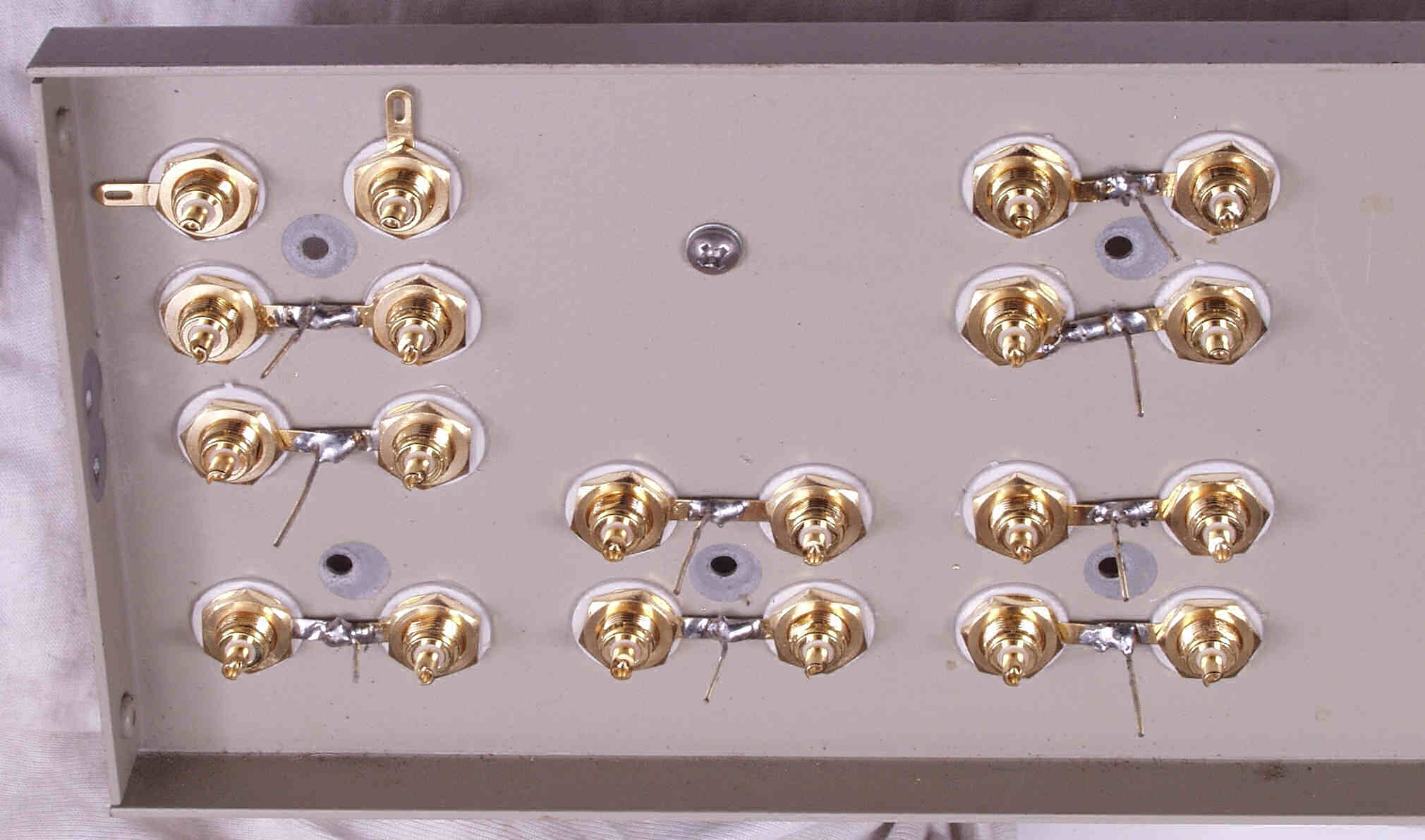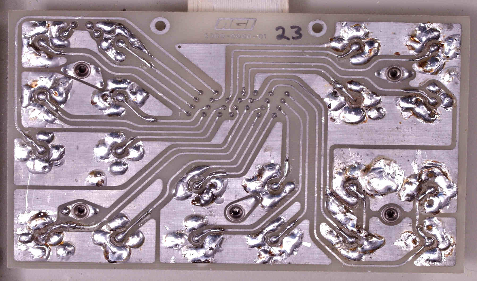 | C2B. 修理前 RCA端子基盤裏 外側端子が皆曲げてあるので、取り外すのに時間がかかる 取り付けの数10倍の時間がかかる |