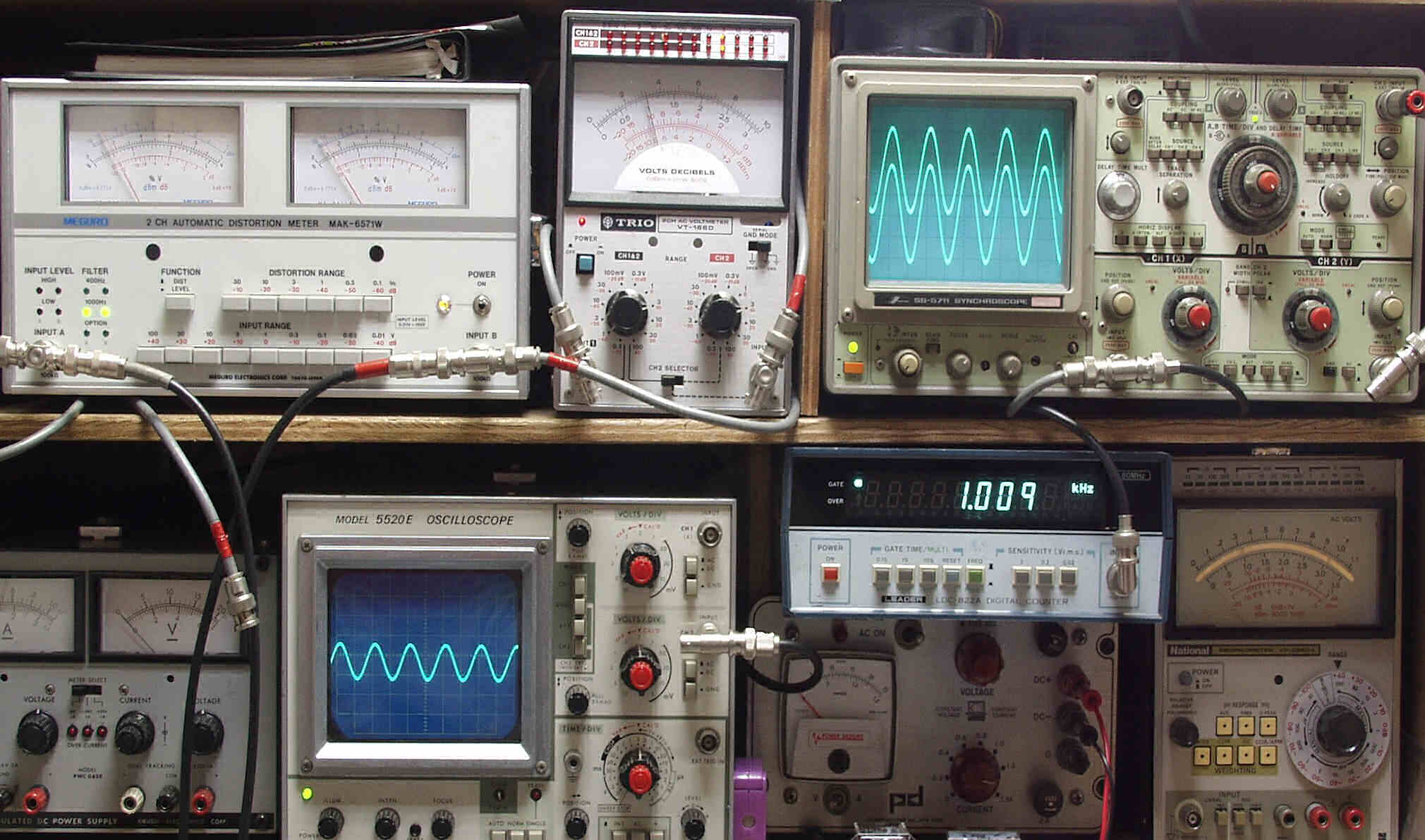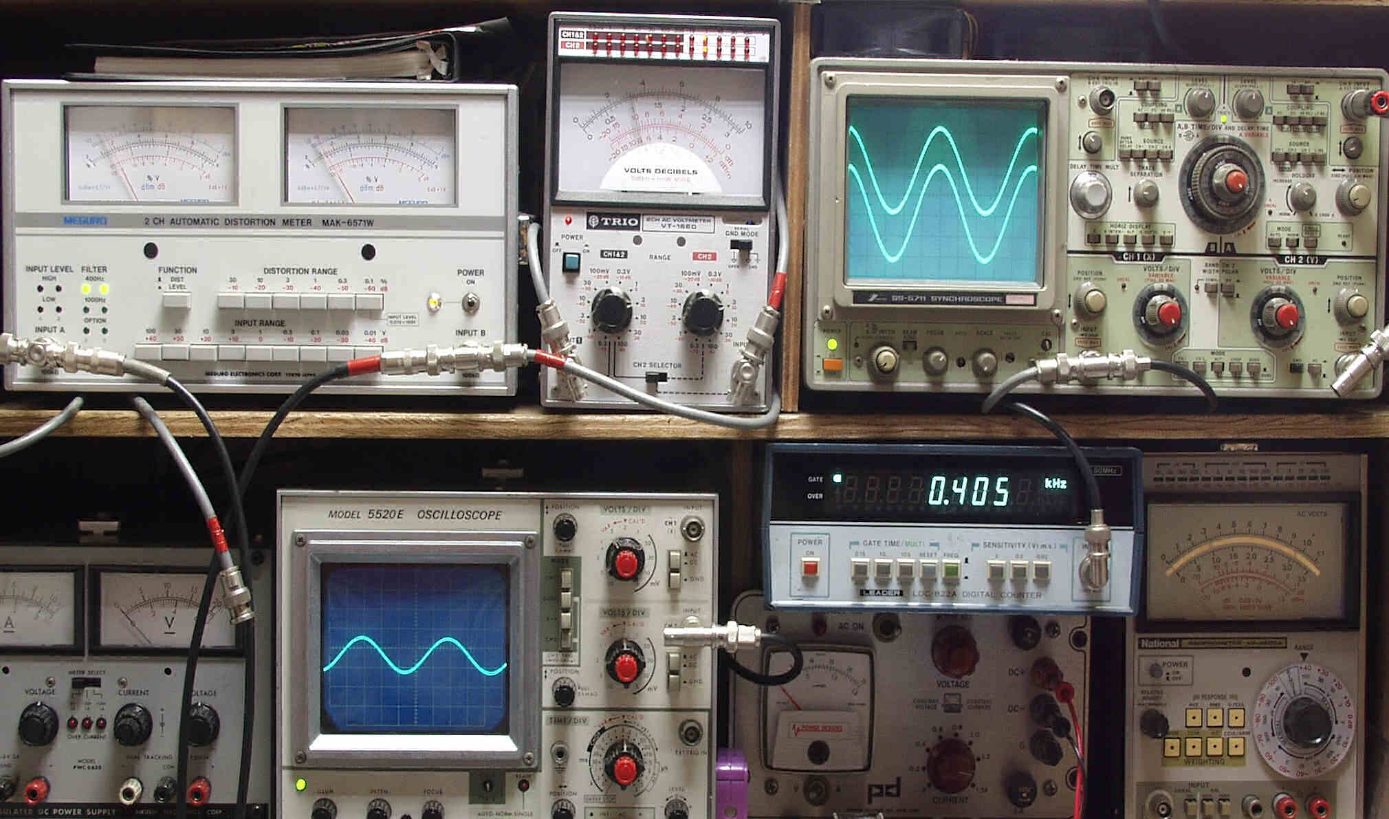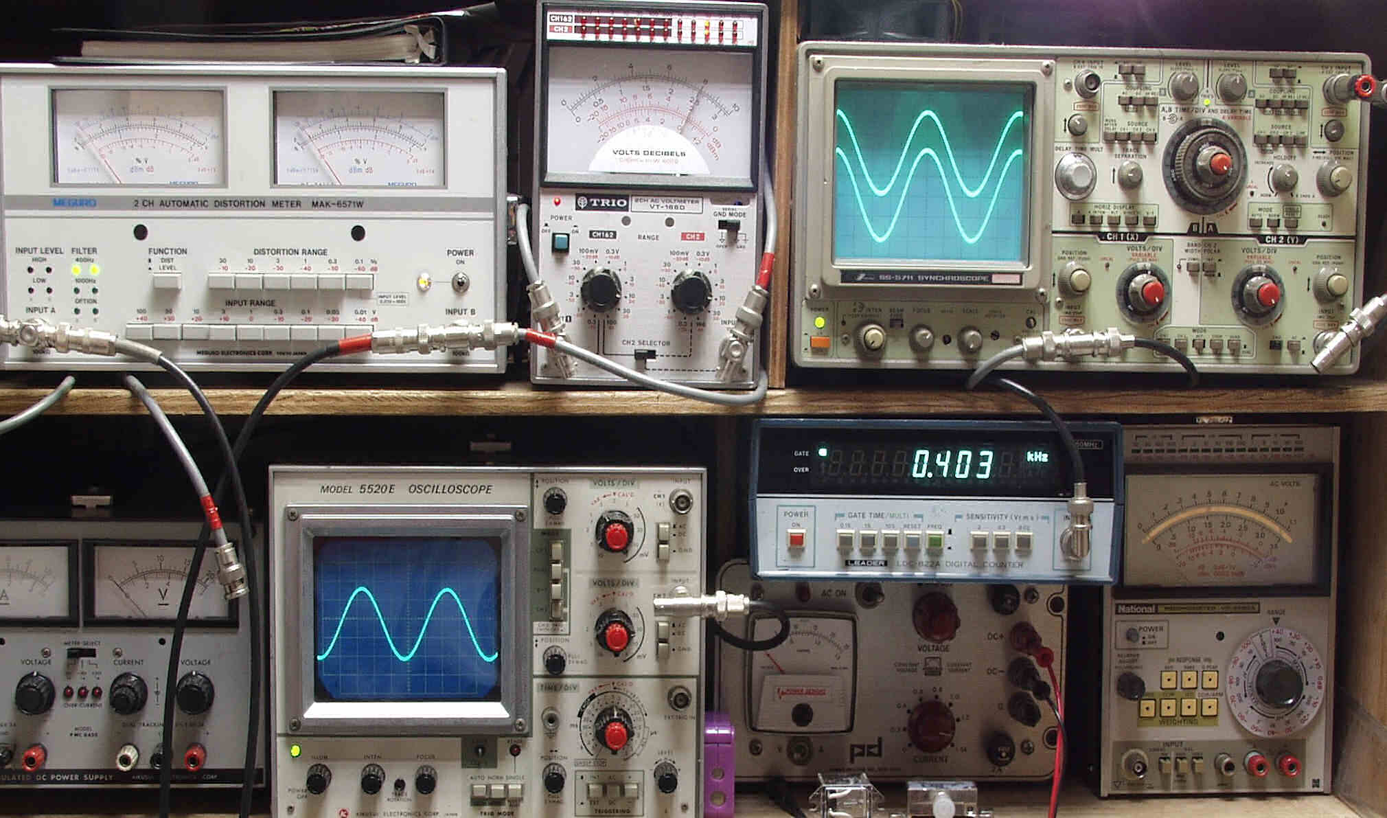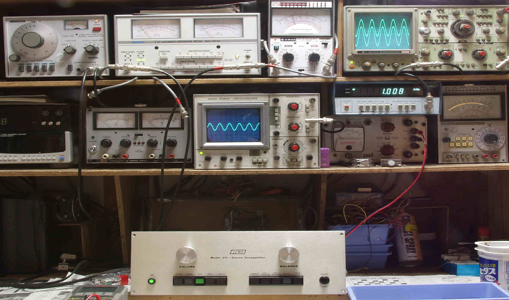 | E. 調整・測定。 E1. 出力/歪み率測定・調整。 <見方> 上左オーデオ発振器より400HZ・1KHZの信号を出す(歪み率=約0.003%)。 下中=入力波形(オーデオ発振器のTTLレベル)。 下右=周波数計。 上左=SP出力の歪み率測定、 左メ−タ−=L出力、右メ−タ−=R出力。 上中=SP出力電圧測定器、赤針=R出力、黒針=L出力。 上右=SP出力波形オシロ、 上=R出力、下=L出力(出力電圧測定器の出力)。 |