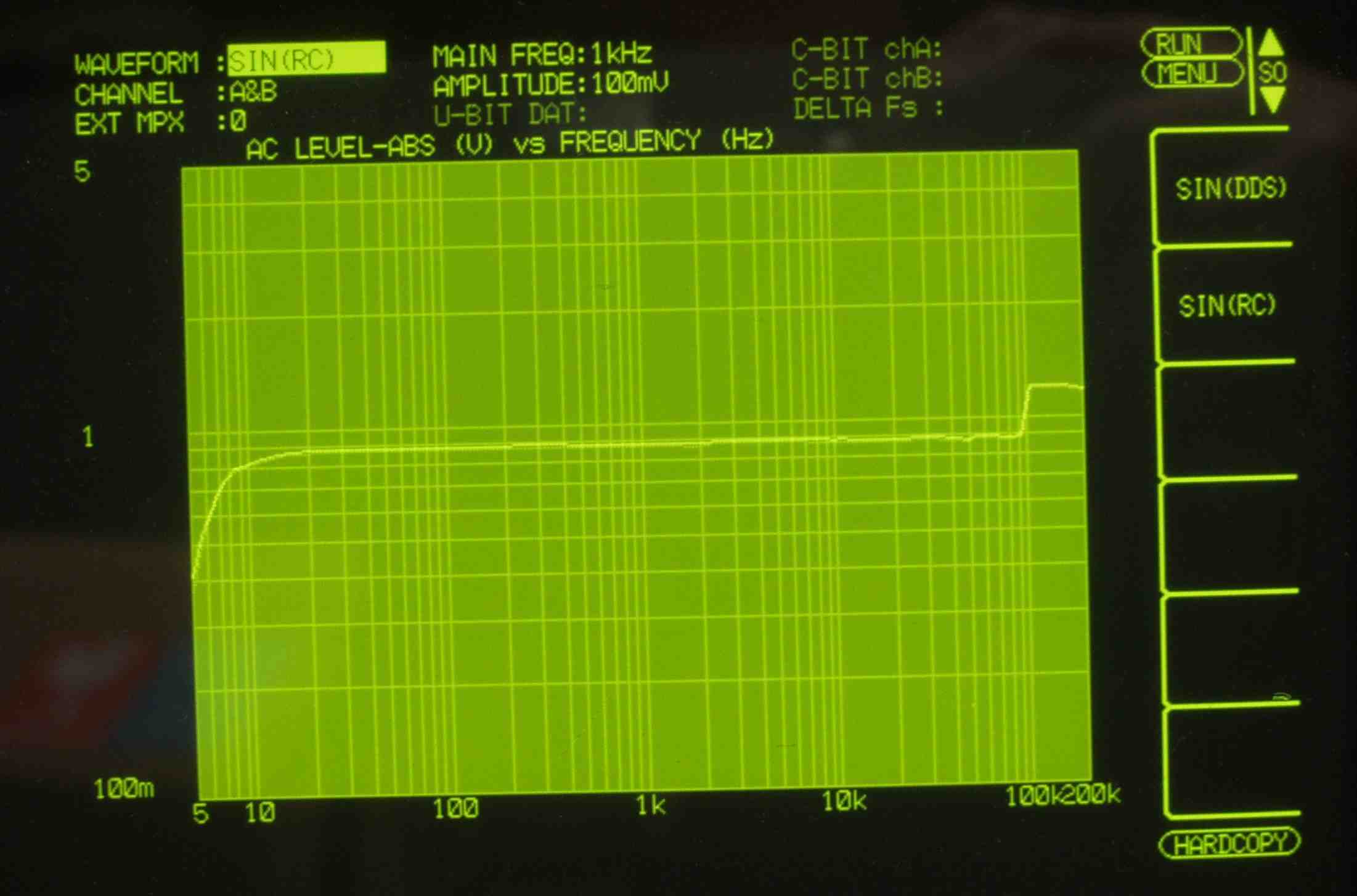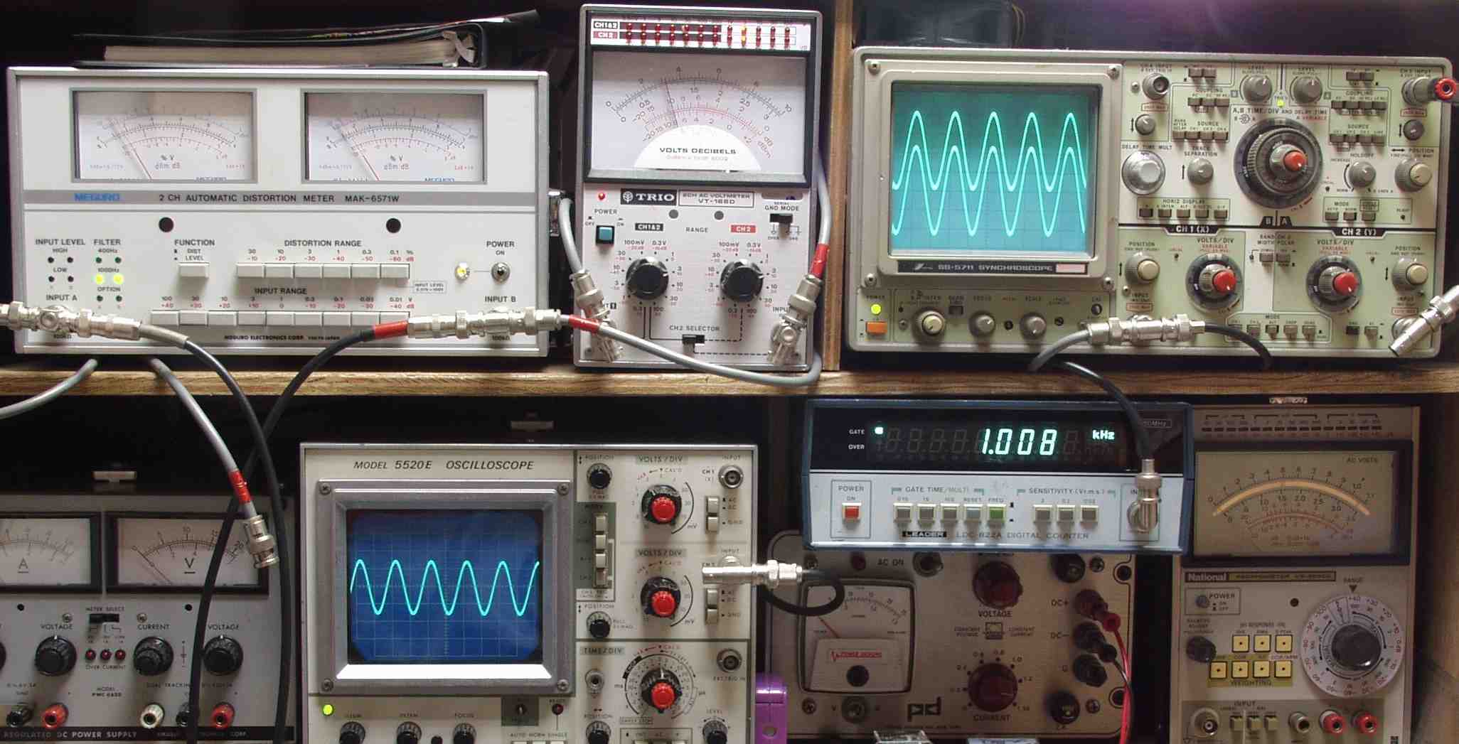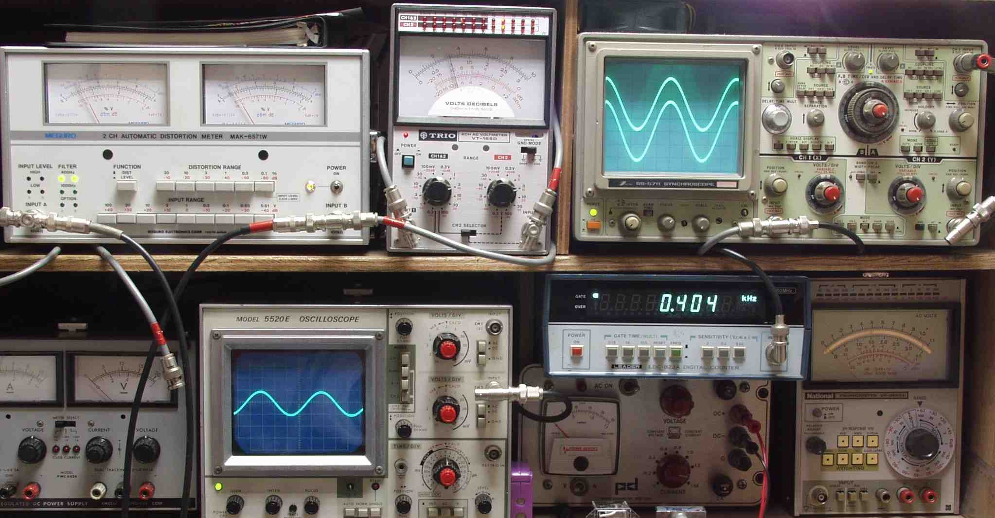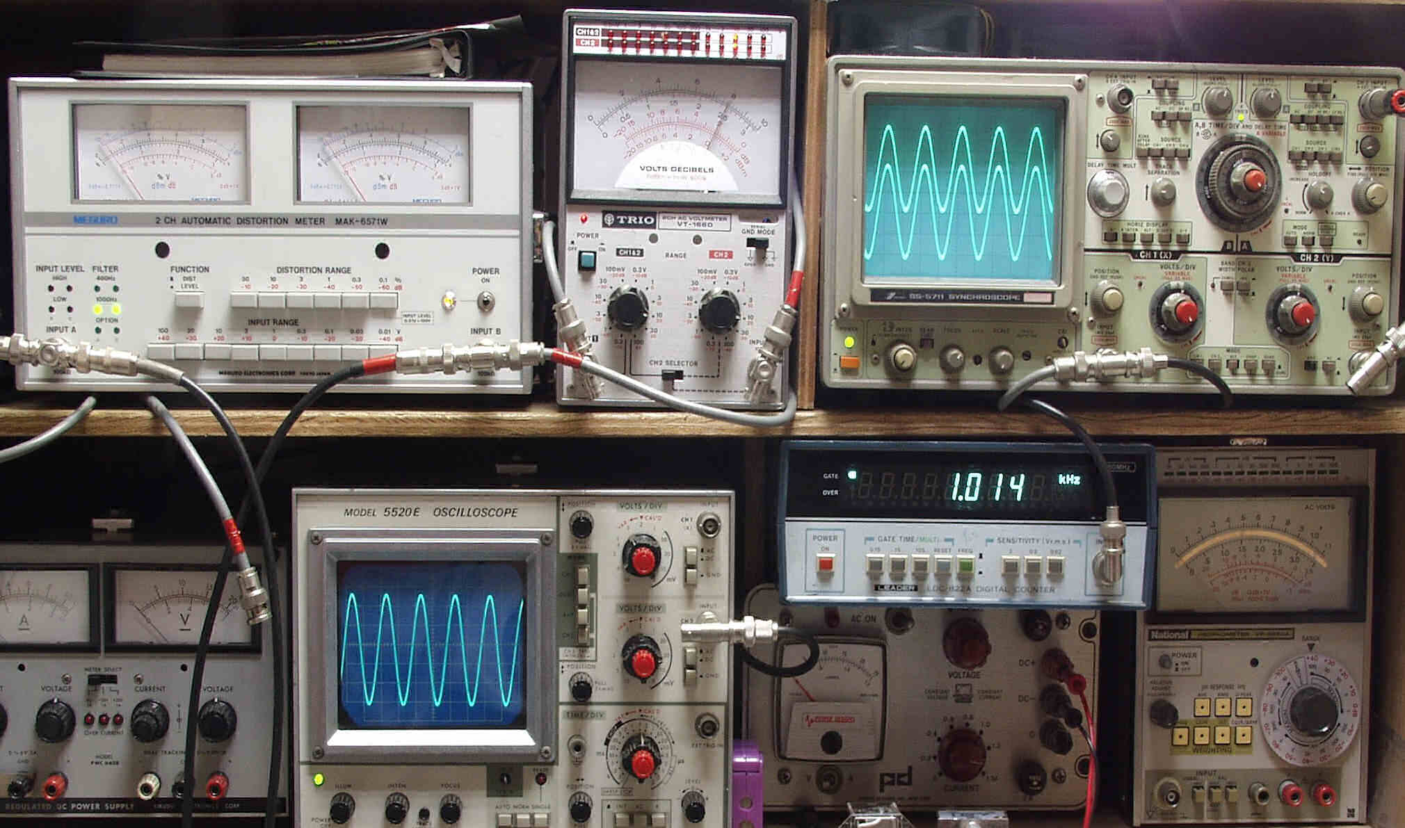 | E. 調整・測定。 E1. 出力/歪み率測定・調整。 <見方> 上左オーデオ発振器より400HZ・1KHZの信号を出す(歪み率=約0.003%)。 下中=入力波形(オーデオ発振器のTTLレベル)。 下右=周波数計。 上左=SP出力の歪み率測定、 左メ−タ−=L出力、右メ−タ−=R出力。 上中=SP出力電圧測定器、赤針=R出力、黒針=L出力。 上右=SP出力波形オシロ、 上=R出力、下=L出力(出力電圧測定器の出力)。 |