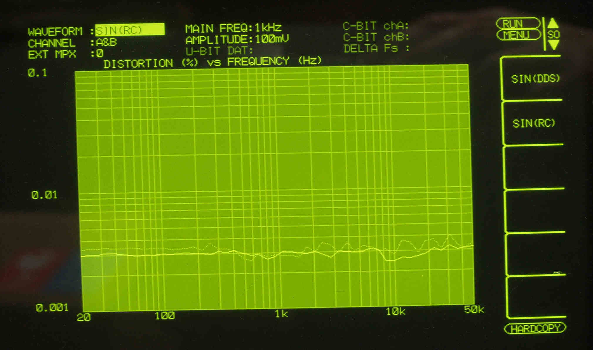 | F1B. 歪み測定 AUX入力端子へ100mV一定入力 VRはmax 左出力=薄(細い)色 右出力=濃い(太い)色 | ||||||||||||||||||||||||||||||||||||||||||||||||||||||||
