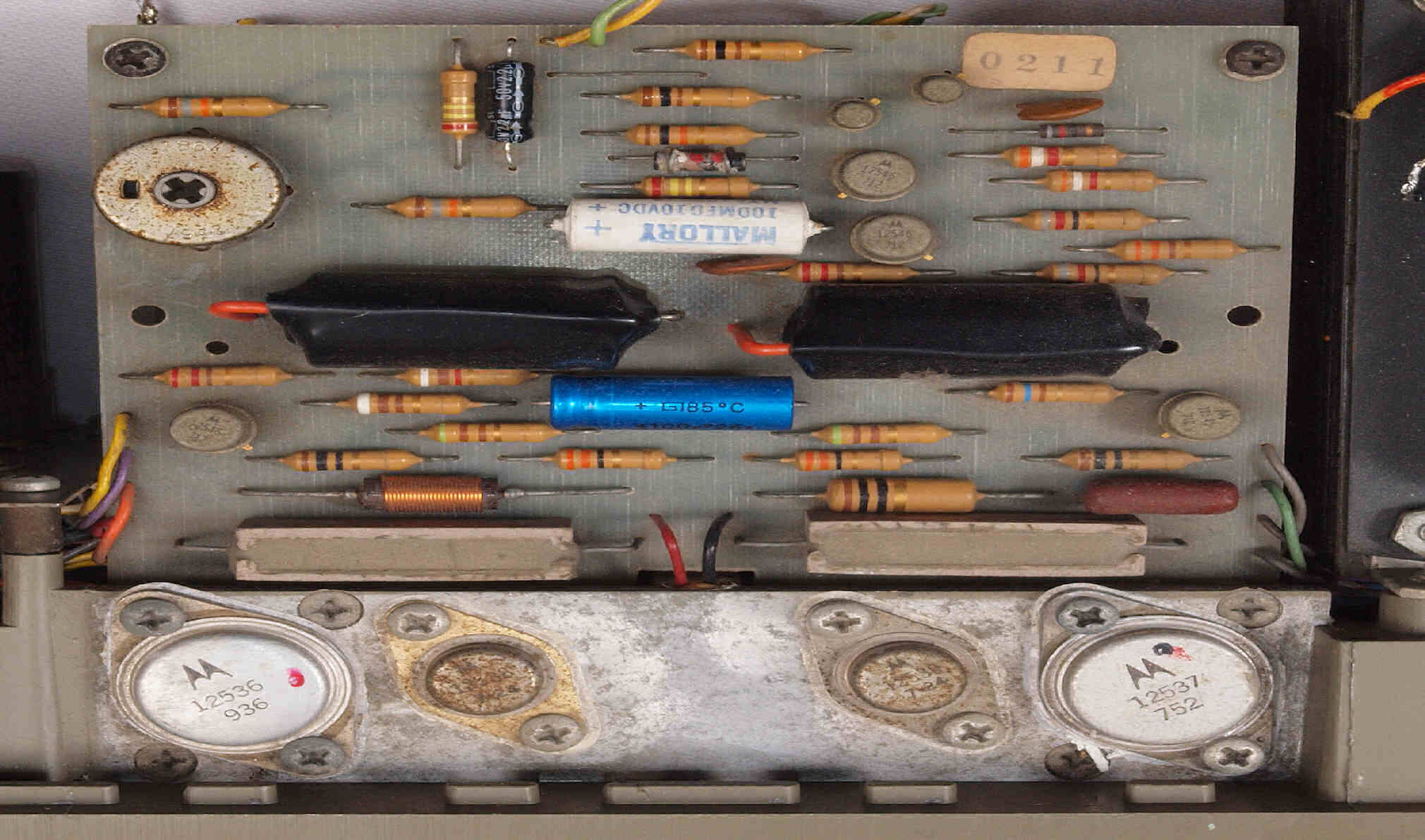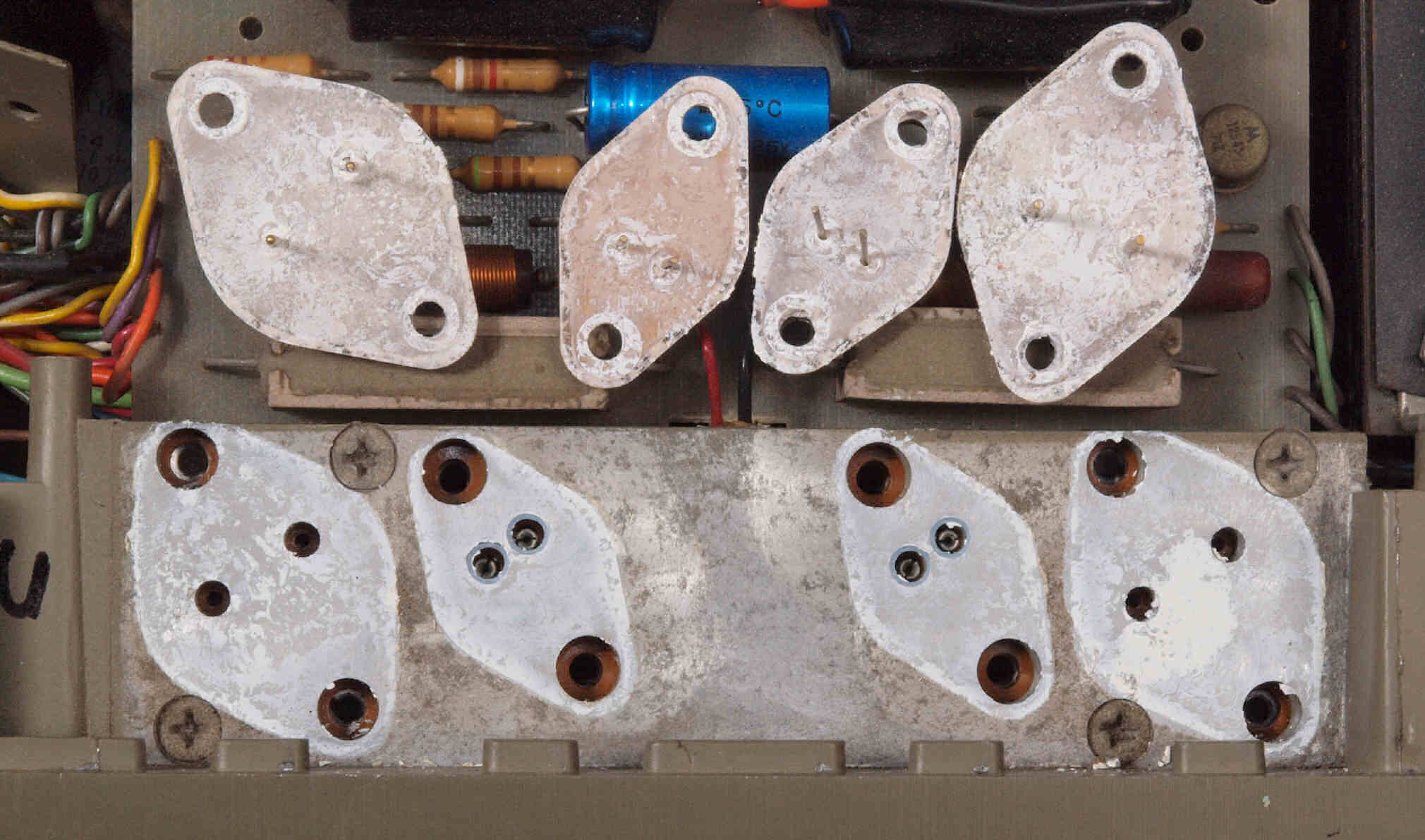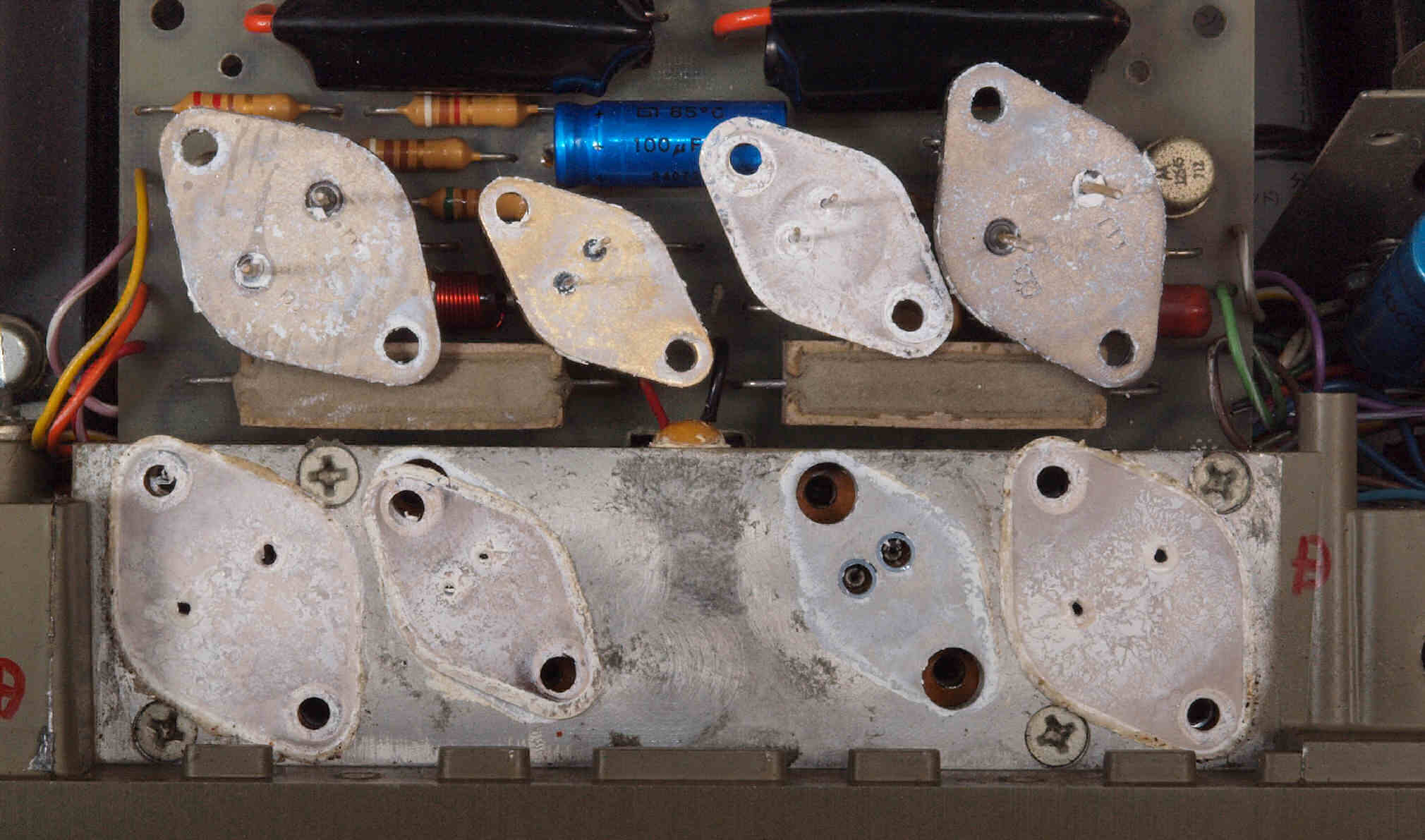 C13. 修理前 CH_A側終段TR(トランジスター)、 上側なので放熱シリコンがカラカラ!