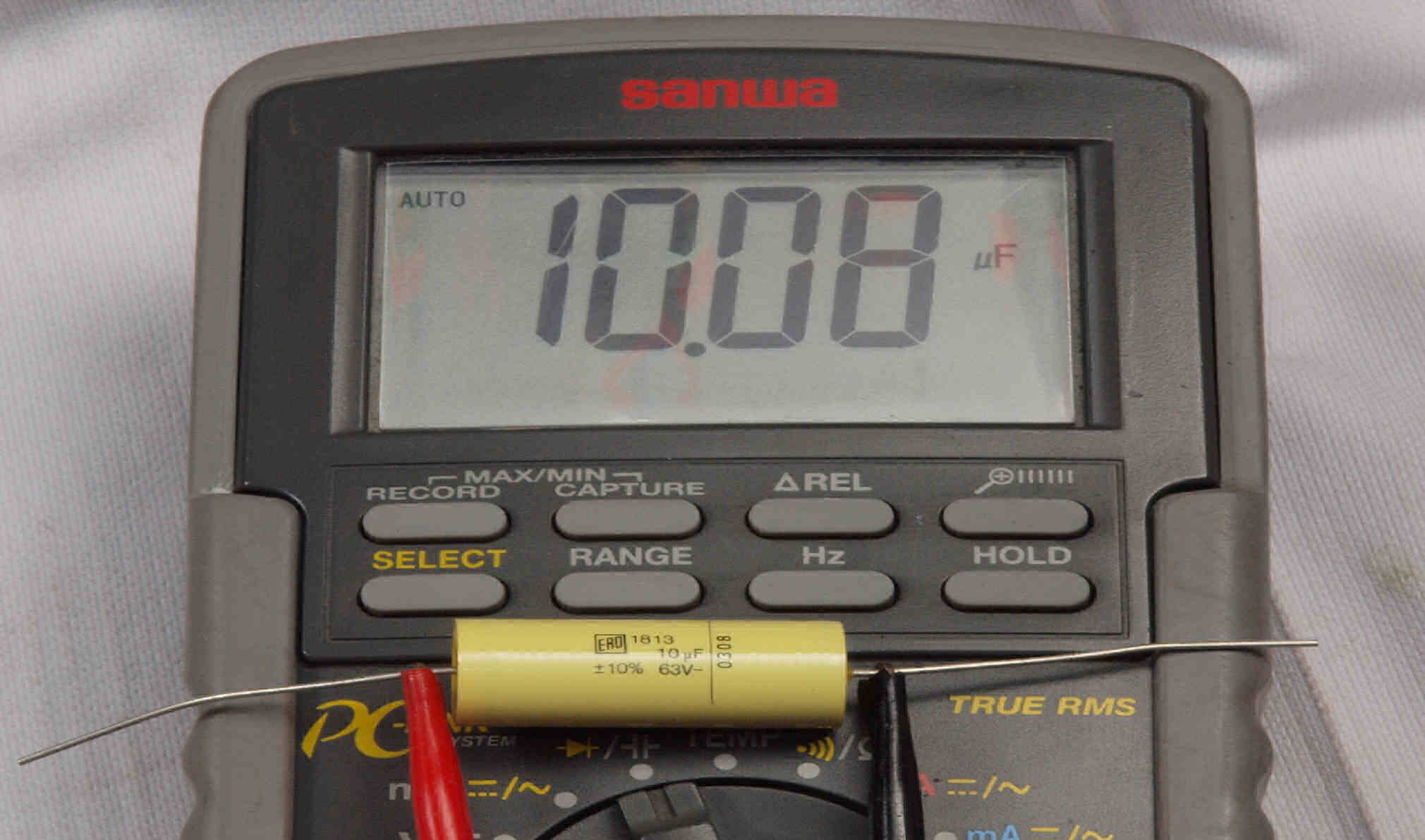 CB2. 交換した部品、 テスター点検、10μF測定。 このクラスの容量測定は、1kHz程度の交流で、
