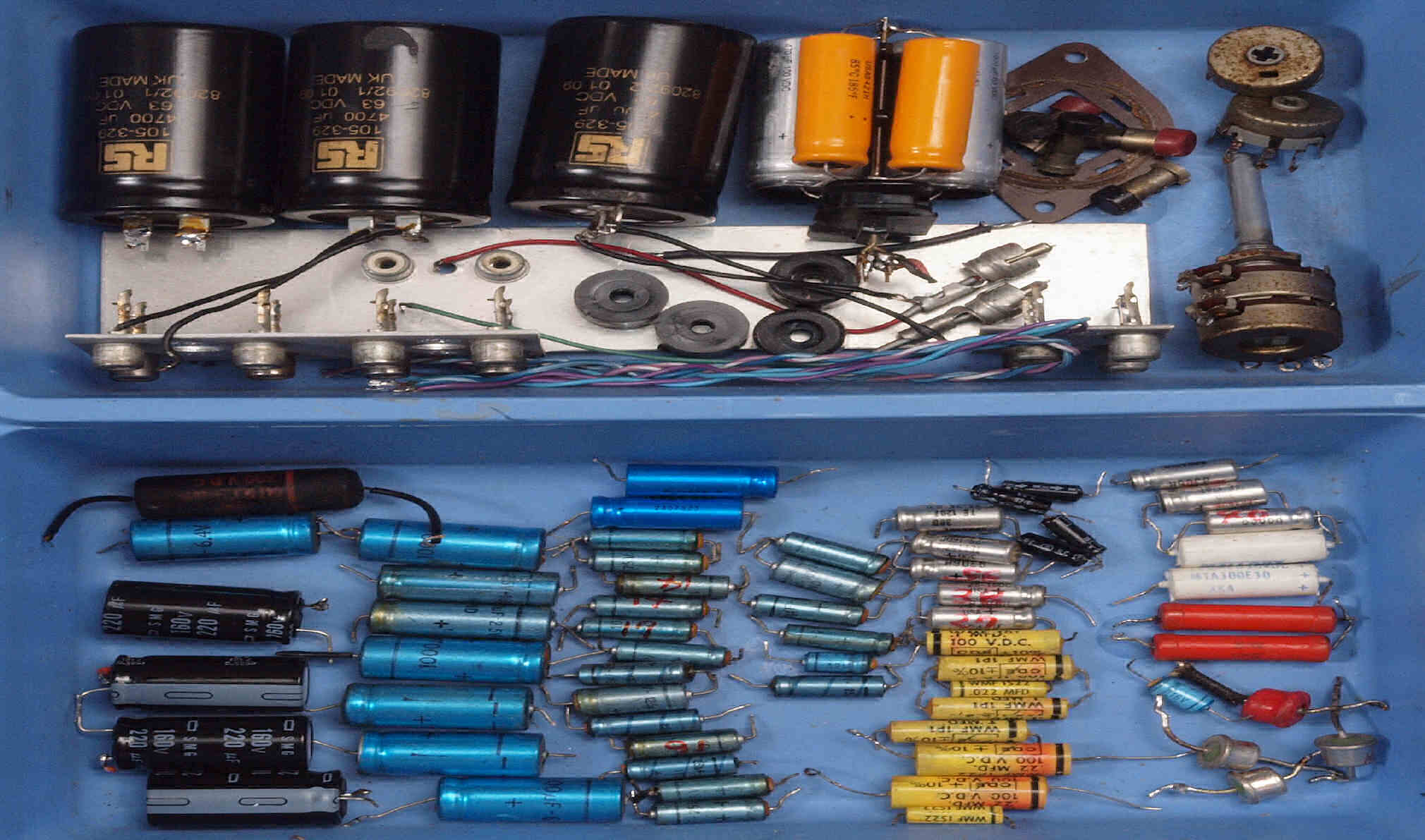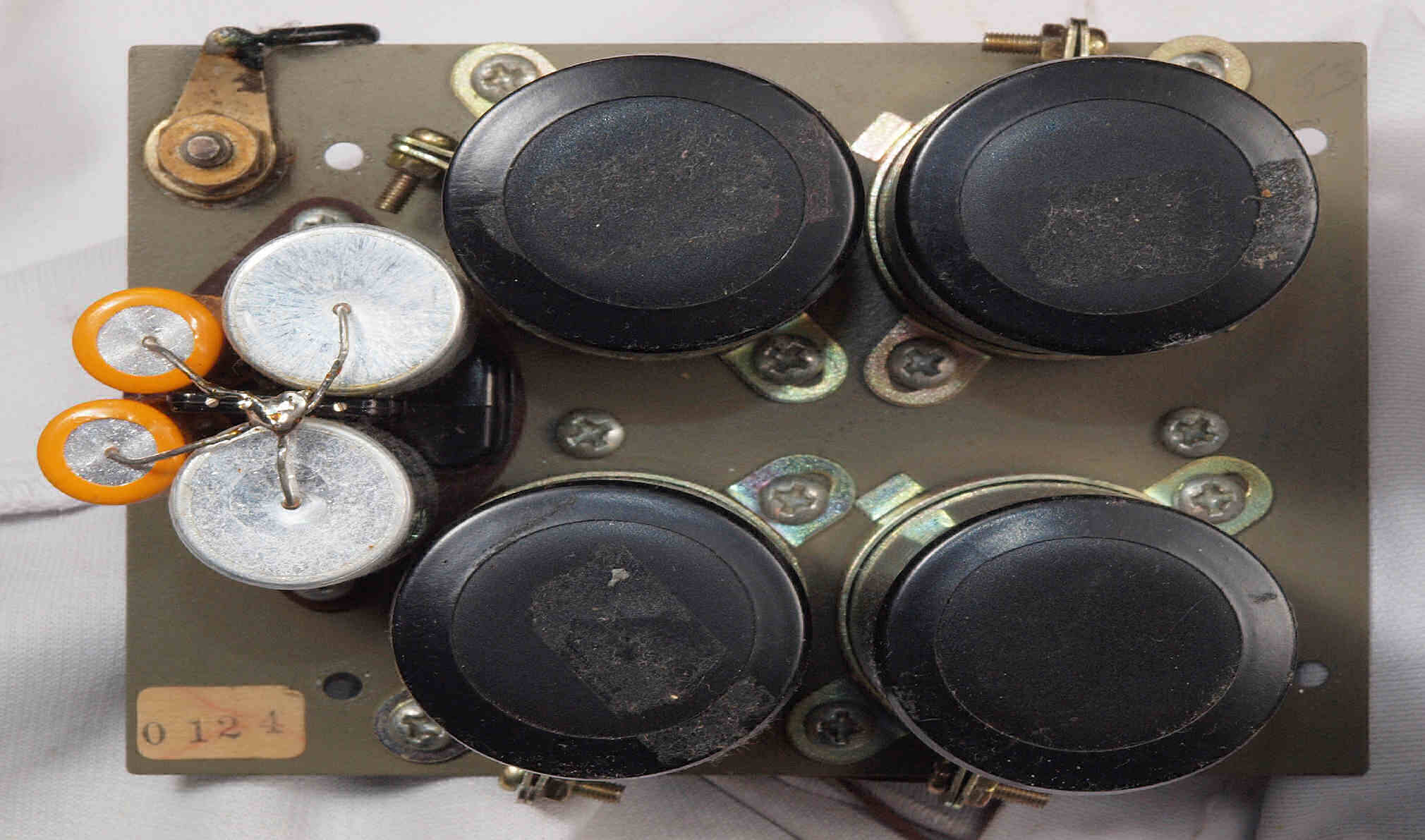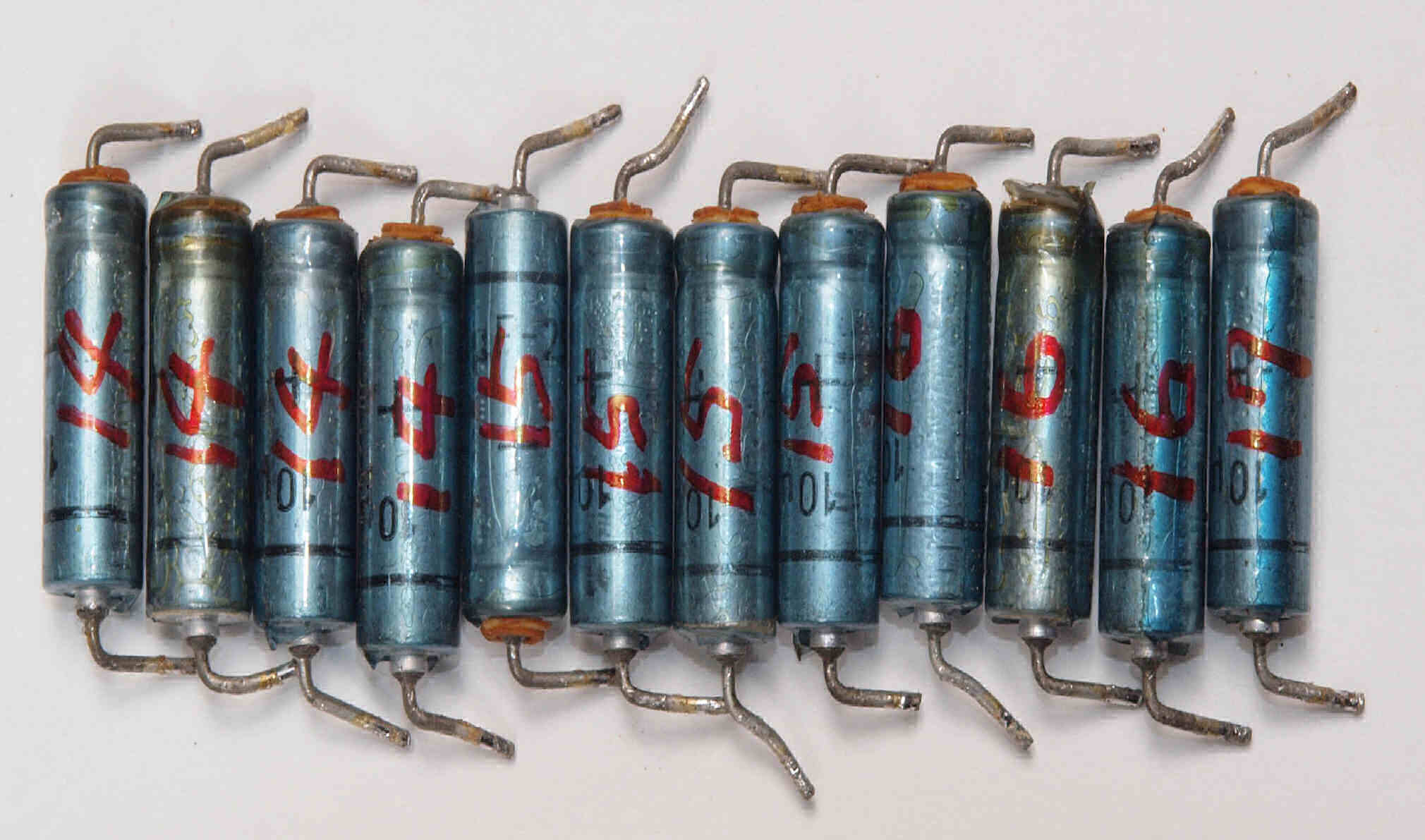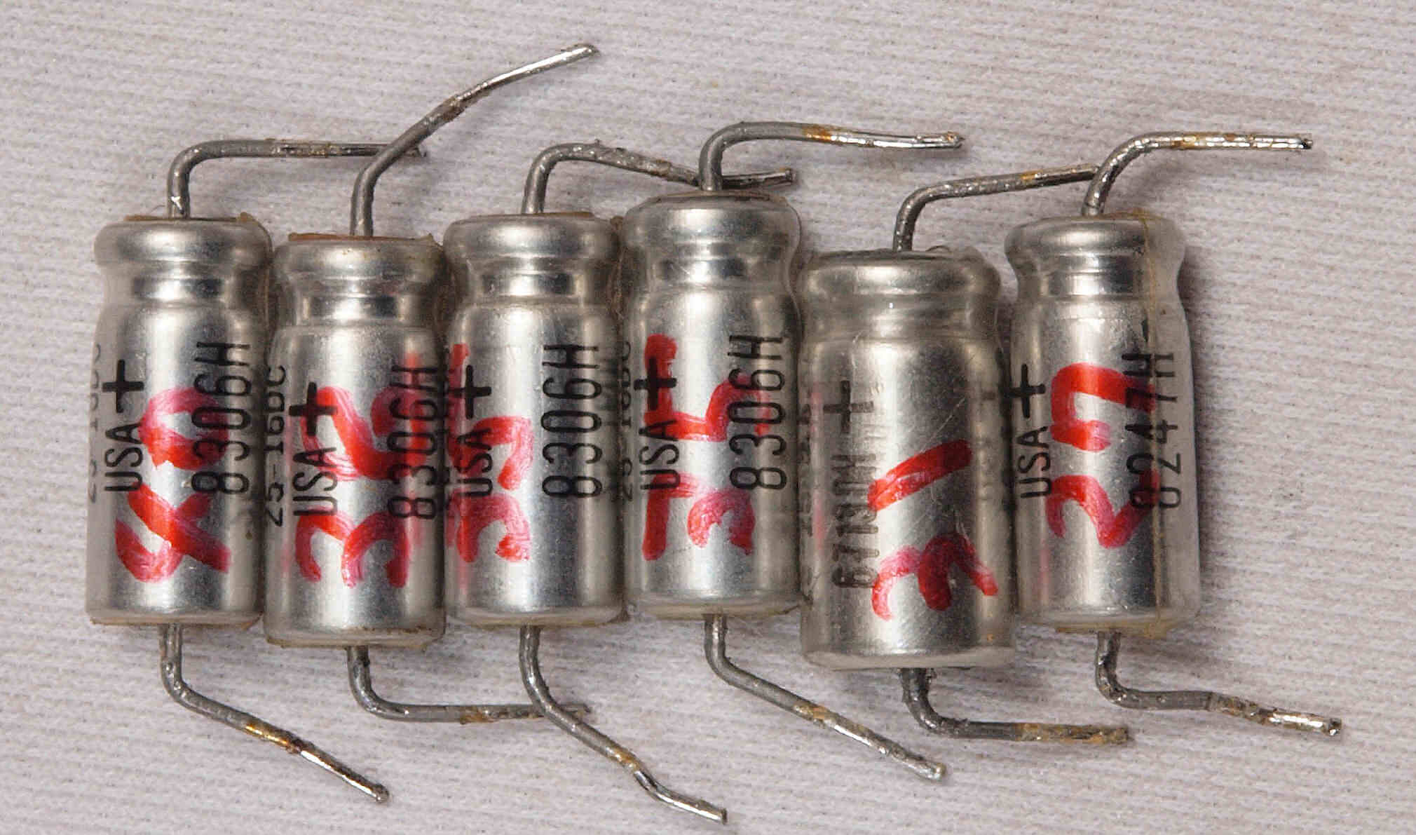 CB4. 交換した部品、 取り外した25μF測定。 左端=40μF〜右端=27μF。