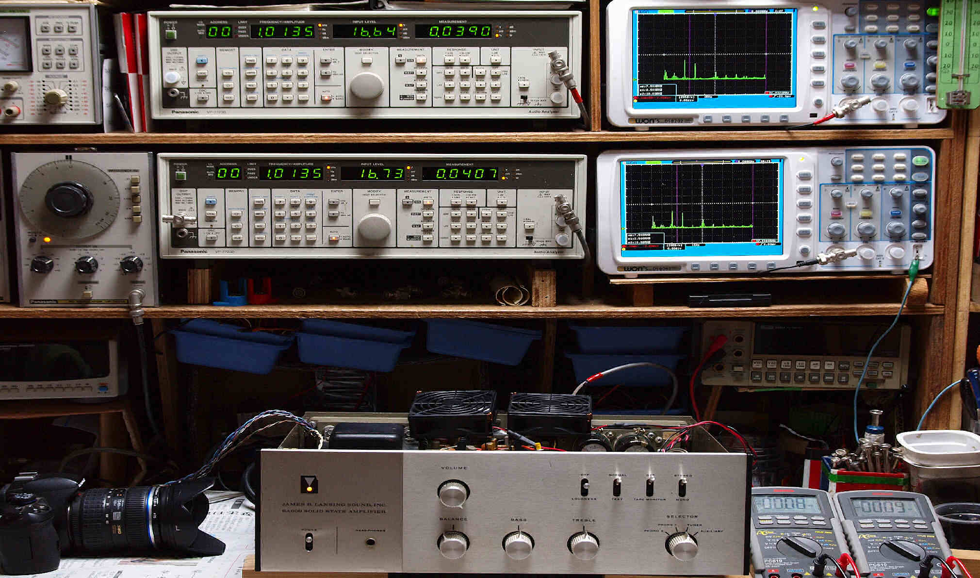下段左端 オーディオ発振器 VP−7201A より50Hz〜100kHzの信号を出し(歪み率=約0.003%)、ATT+分配器を通し、AMPに入力。