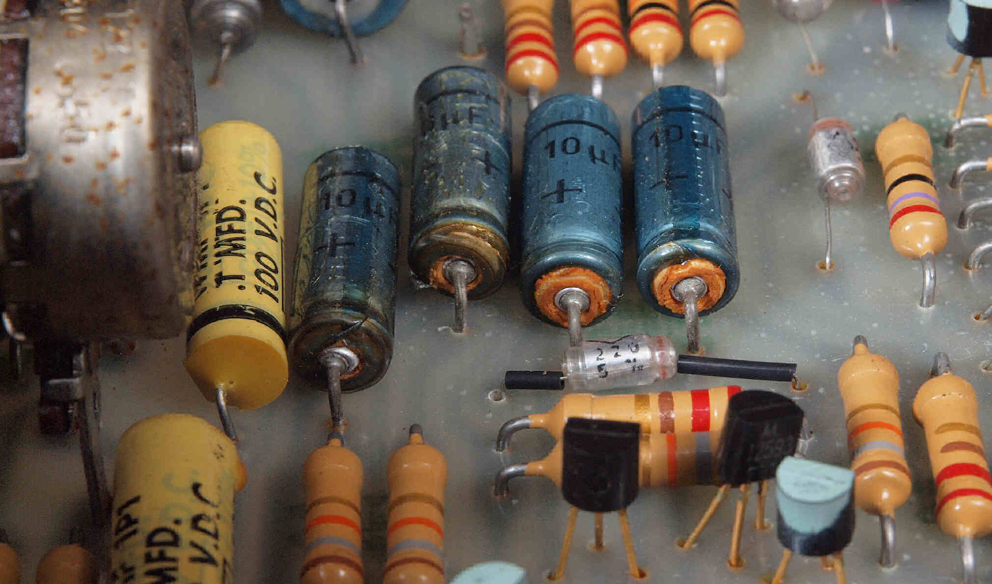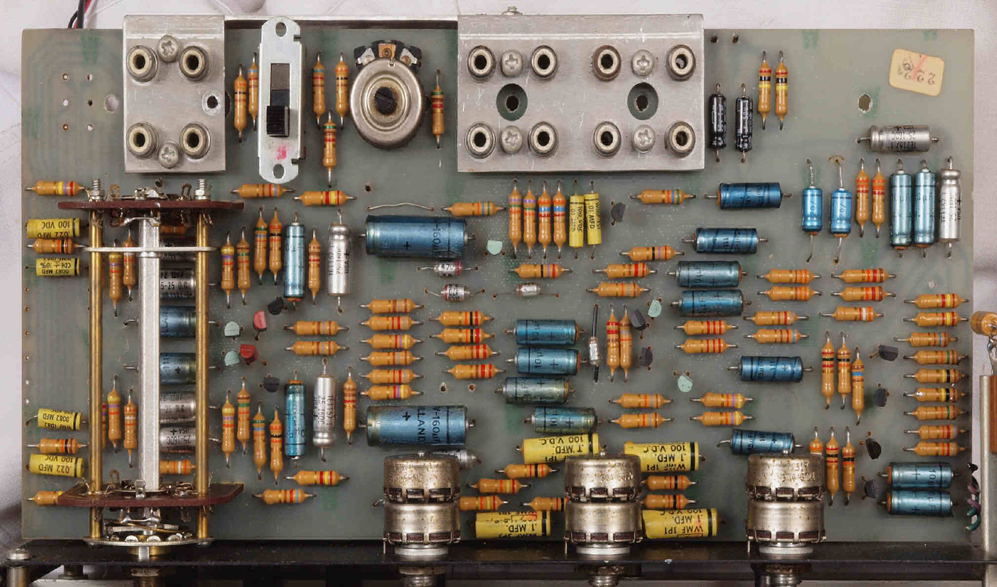 C312. 修理前 プリアンプ基板、 端子周りが膨らんできた電解コンデンサー。この後液漏れする。