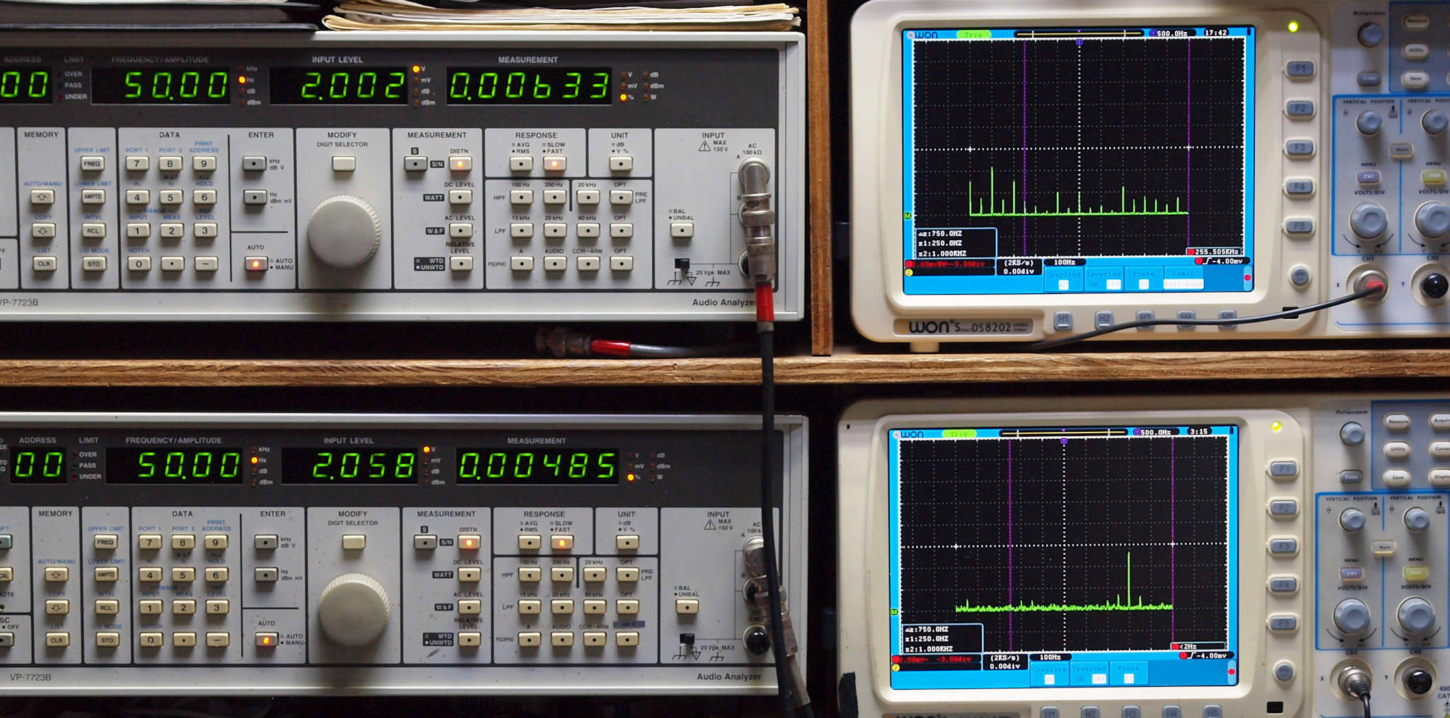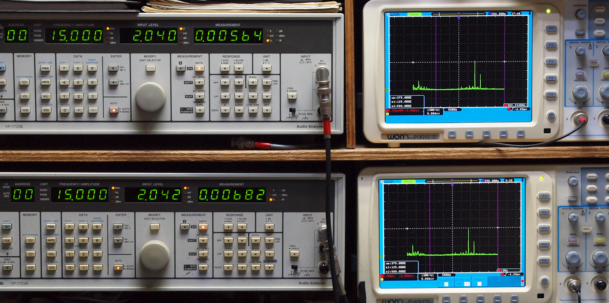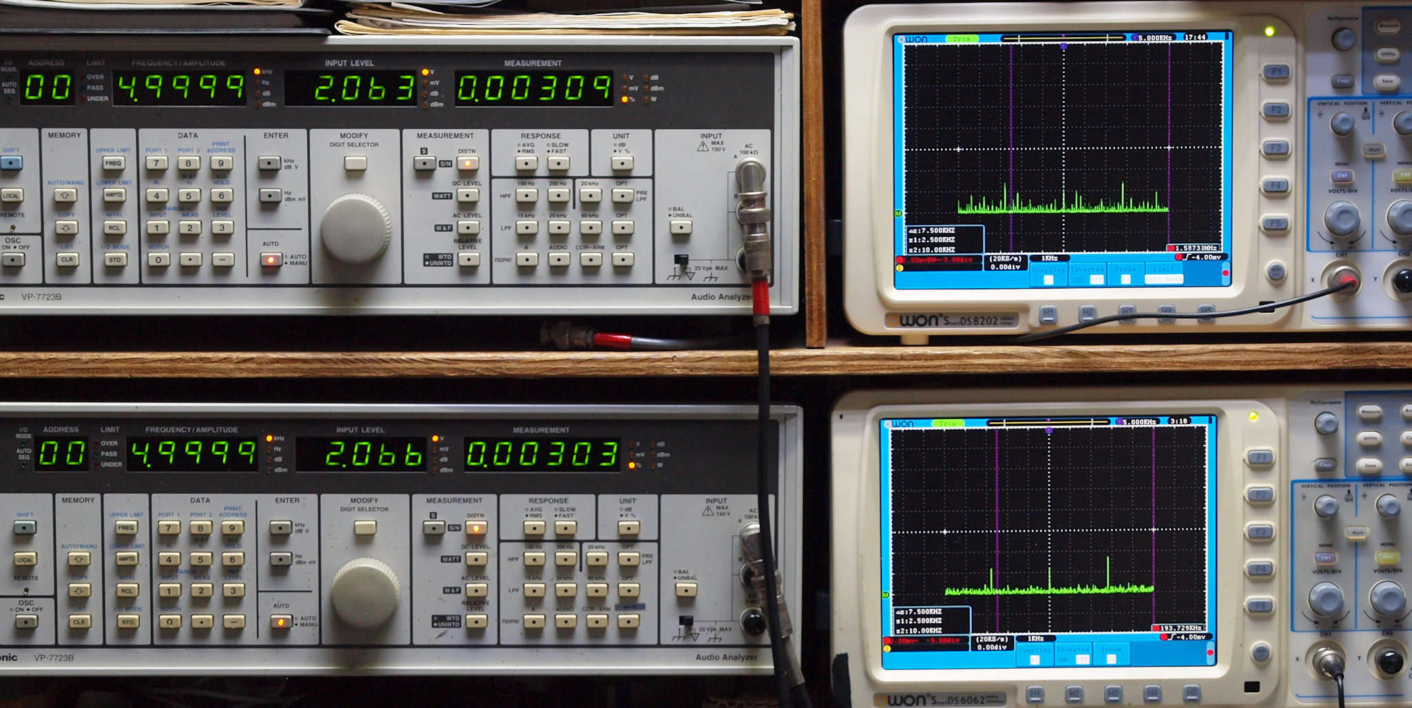 | E. CD TEST DISC 1(Technics)による調整・測定。 画像をクリックすると、大きく(横幅2050ドット)表示されます。 「見方」。 上段中 右側(XLR)出力を「Audio Analyzer Panasonic VP−7723B」により測定。 表示LED、 左端=メモリーNo、 中左=周波数測定、 中右=出力電圧測定、 右端=歪み率測定。 上段右端 VP−7723Bの基本波除去出力を「owon SDS8202(200MHZ)」で「FFT分析」表示。 下段中 左側(XLR)出力を「Audio Analyzer Panasonic VP−7723B」により測定。 表示LED、 左端=メモリーNo、 中左=周波数測定、 中右=出力電圧測定、 右端=歪み率測定。 下段右端 VP−7723Bの基本波除去出力を「owon SDS6062(200MHZ)」で「FFT分析」表示。 本体上のCDプレヤー光出力を入力、出力はRCA端子にて測定。 測定機器の仕様や整備の様子はこちら、「VP−7723B」「VP−7201A」。 FFT画面の見方はこちら。 |