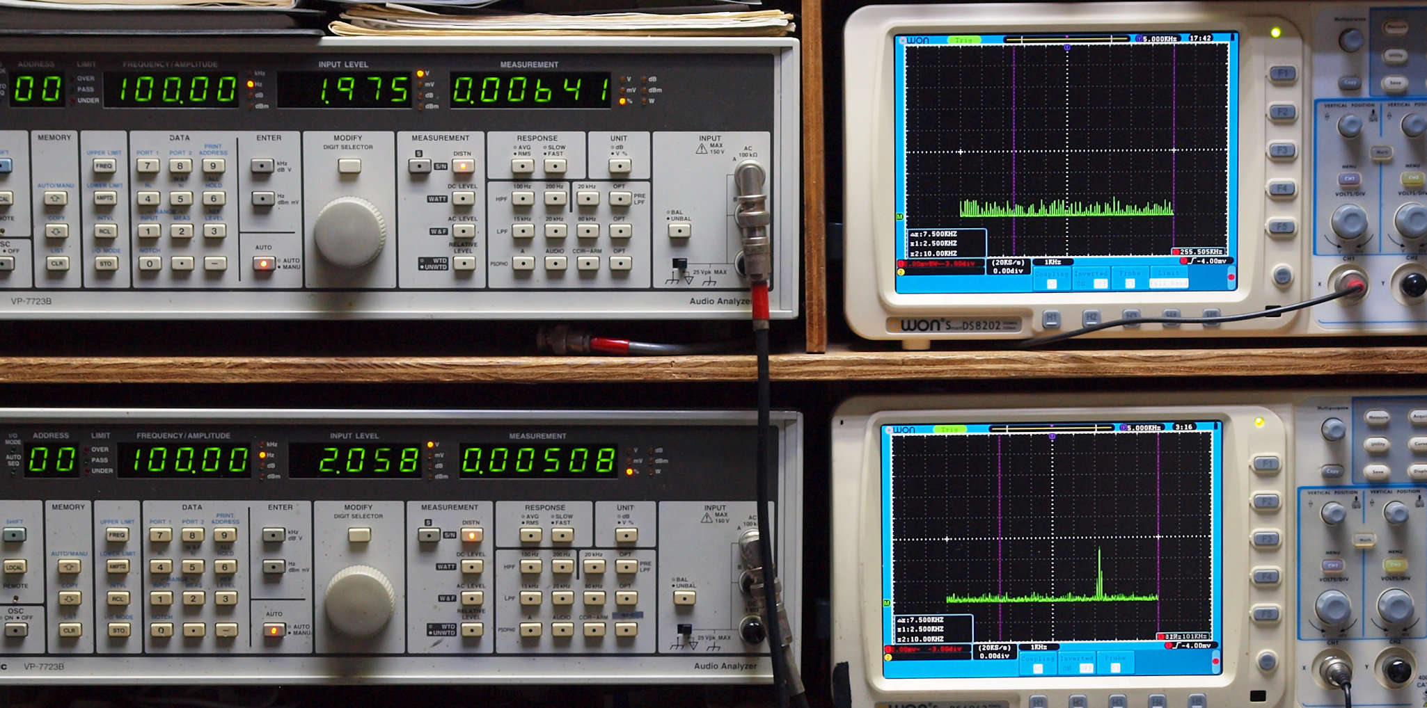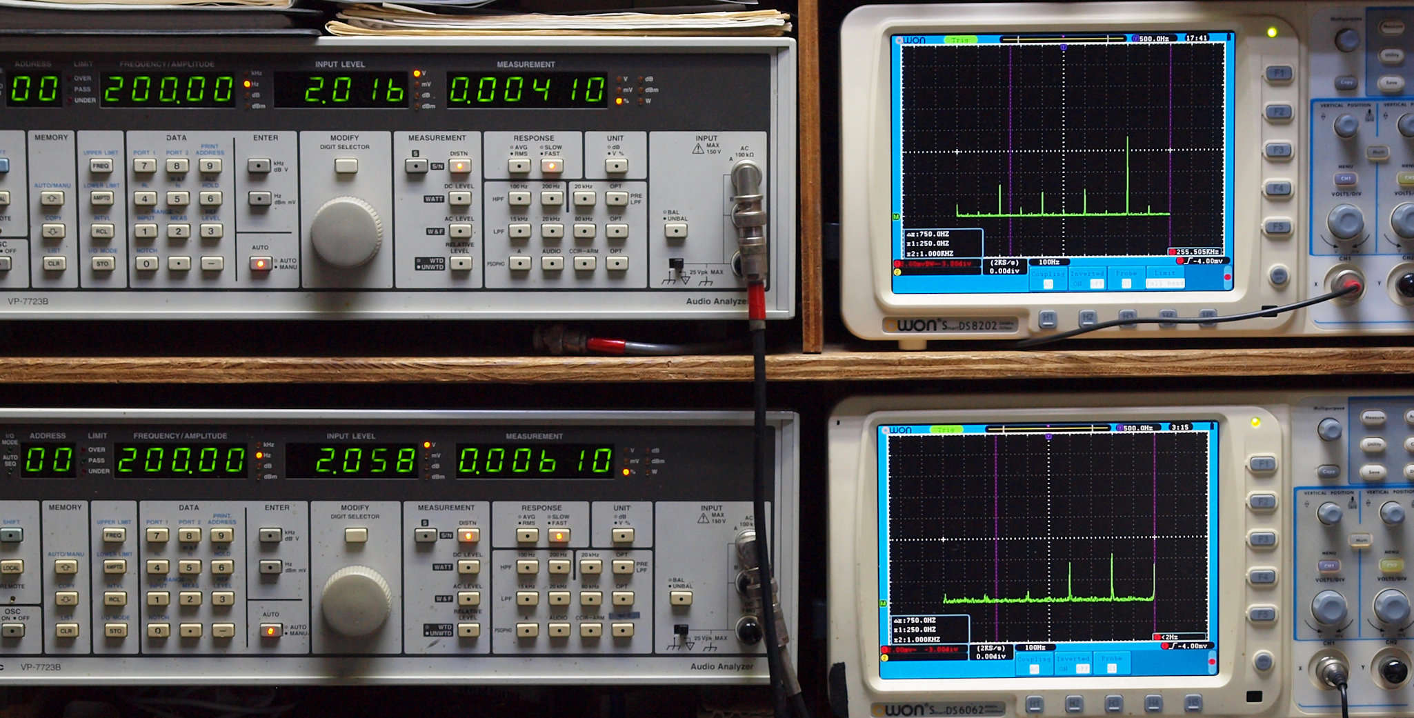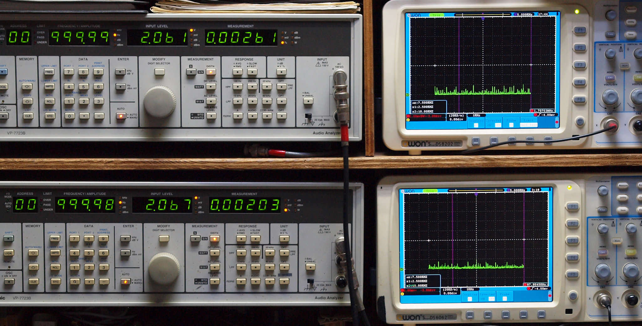 | E2. 100Hz入力、R側出力電圧2V、 0.00641%歪み。 L側出力電圧2V、 0.00508%歪み。 「FFT分析」のオシロのカーソル周波数、左=250Hz、右=1kHz。 |