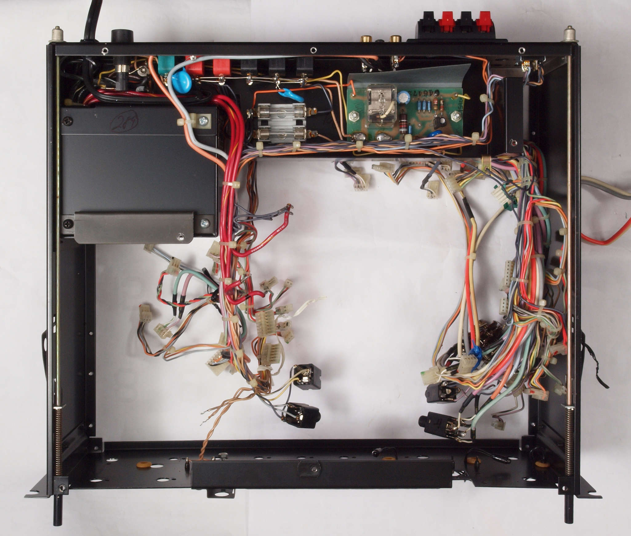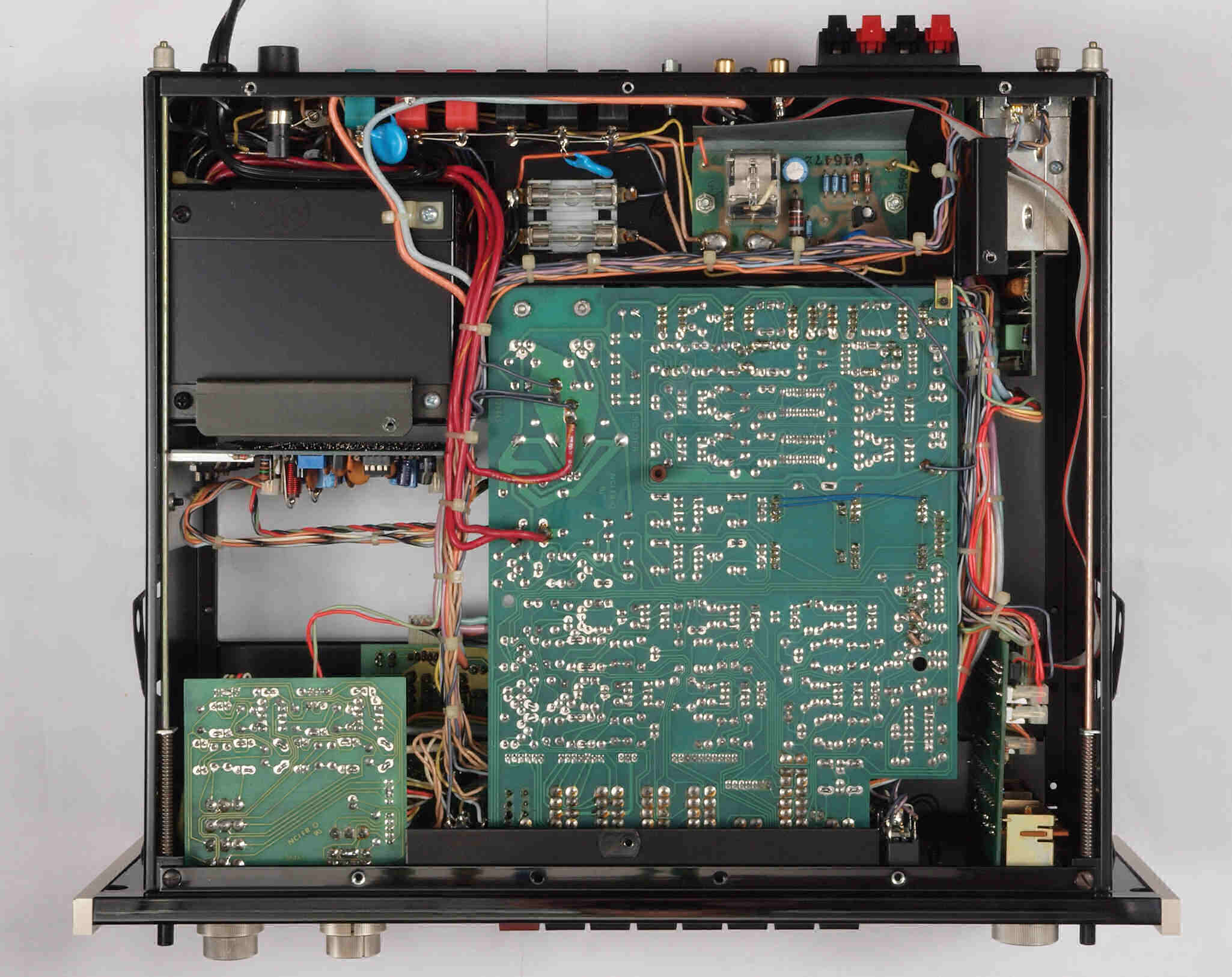 C1. 修理中 前パネル・基板を取り去り修理中、上から見る。