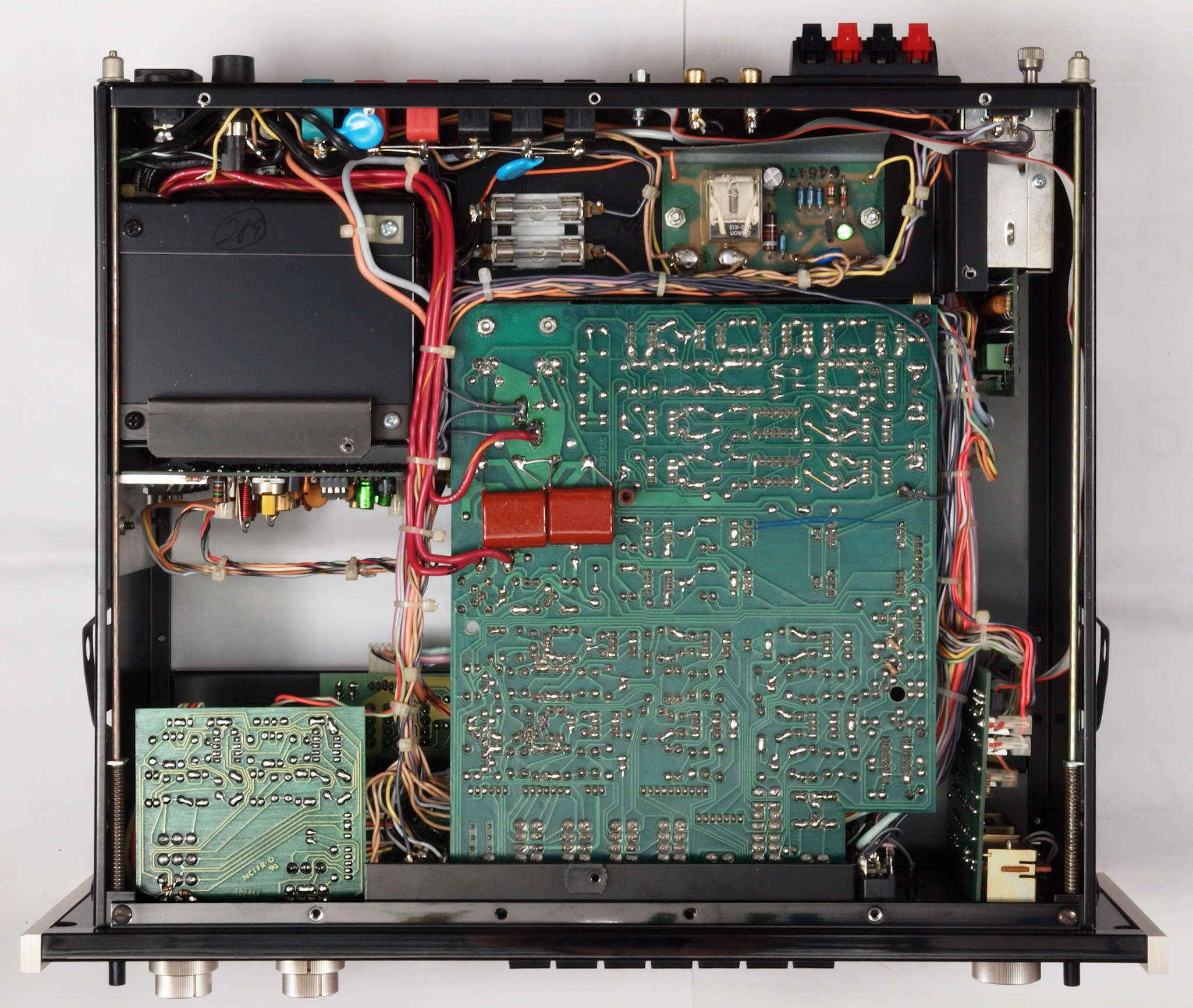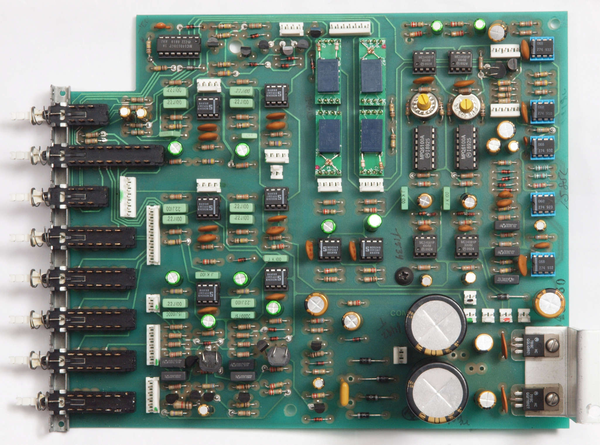 C32. 修理後 HighLevelInput TapeOutSW−右基板。 電解コンデンサー10個交換。フイルムコンデンサー11個追加。
