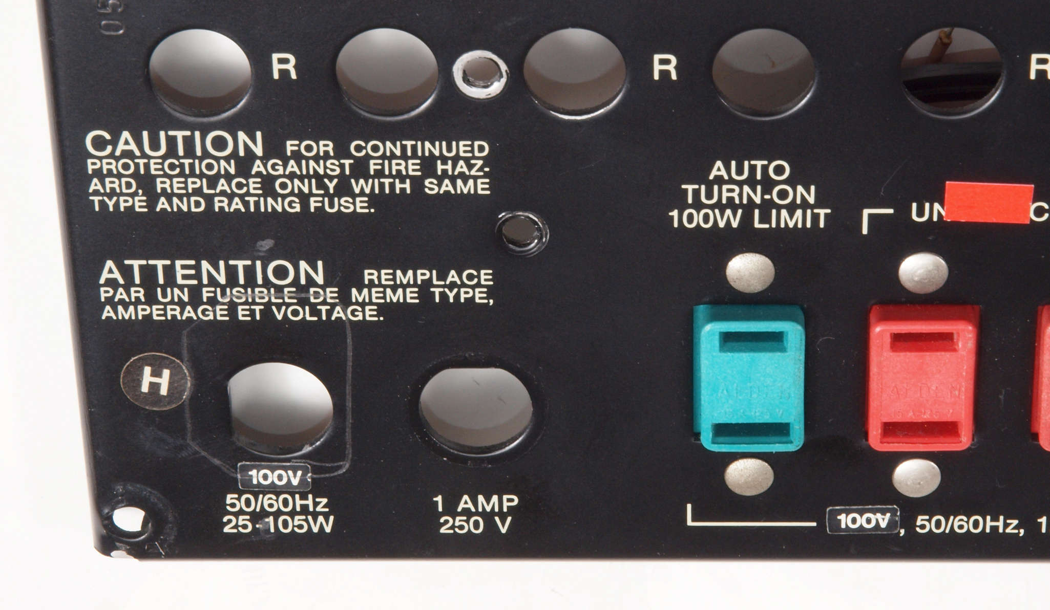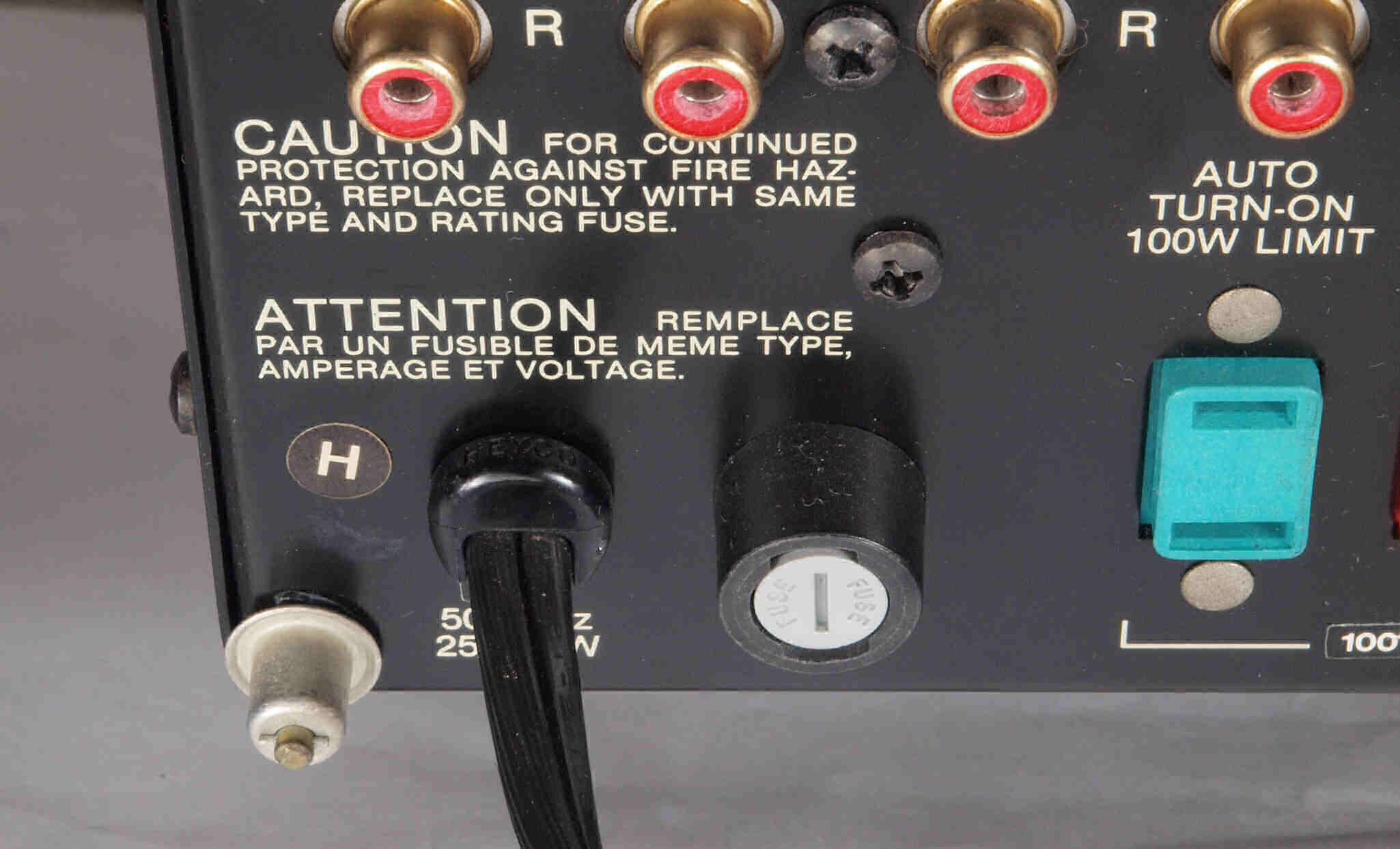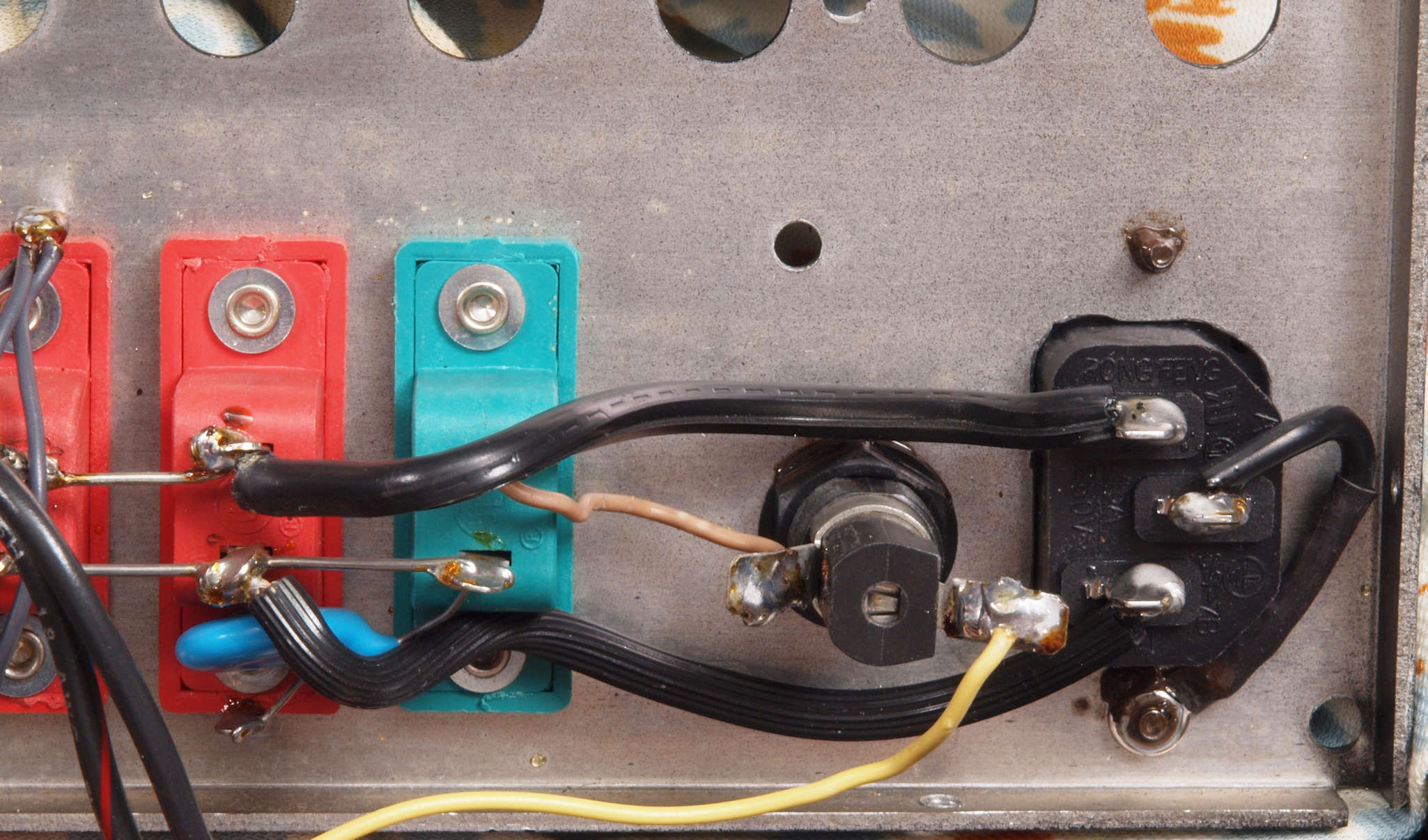 A15. 点検中 電源コード取り付け部。 3Pインレットに交換可能。木ケースのストッパが使用がやりずらいかも?