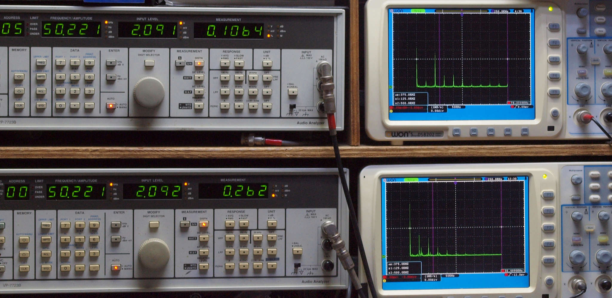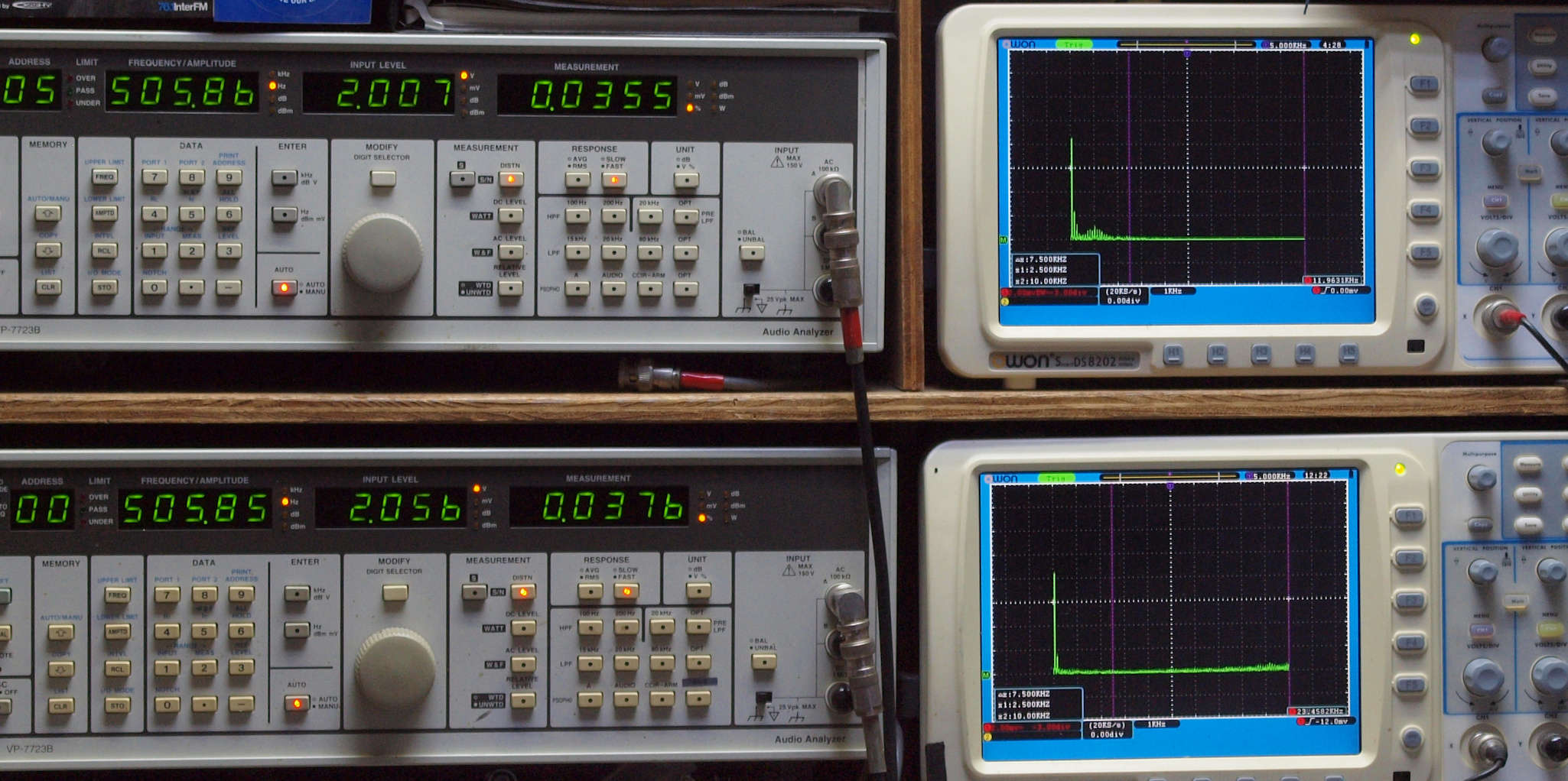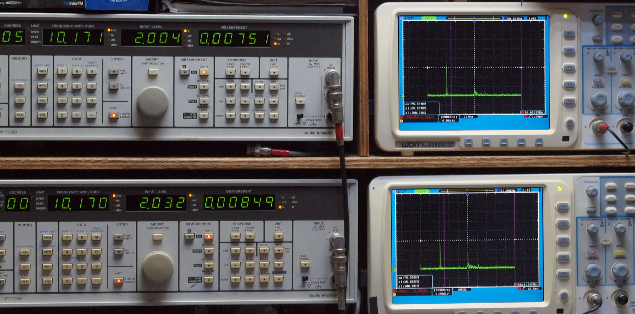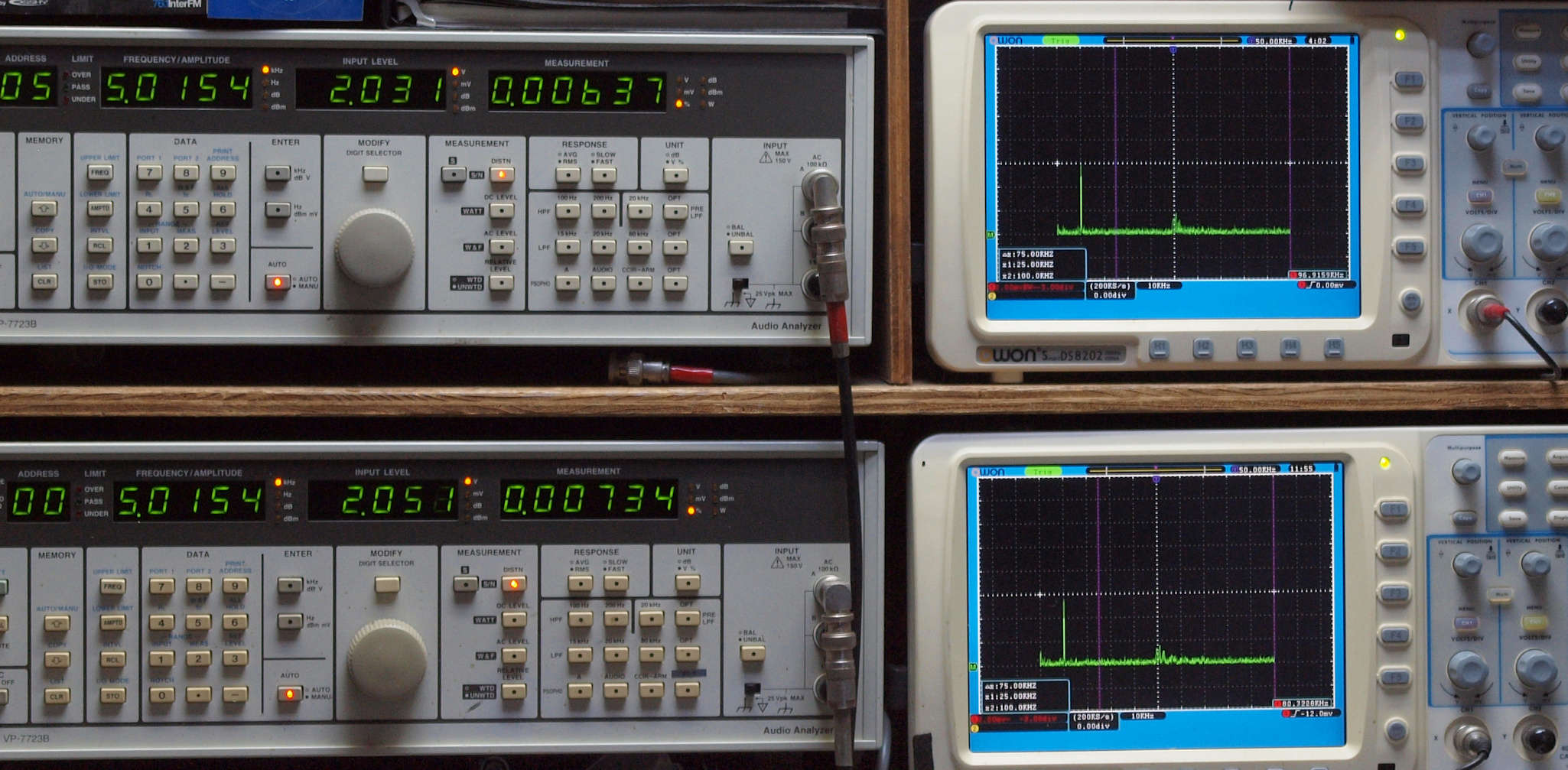 上段右端 VP−7723Bの基本波除去出力を「owon SDS8202(200MHZ)」で「FFT分析」表示。