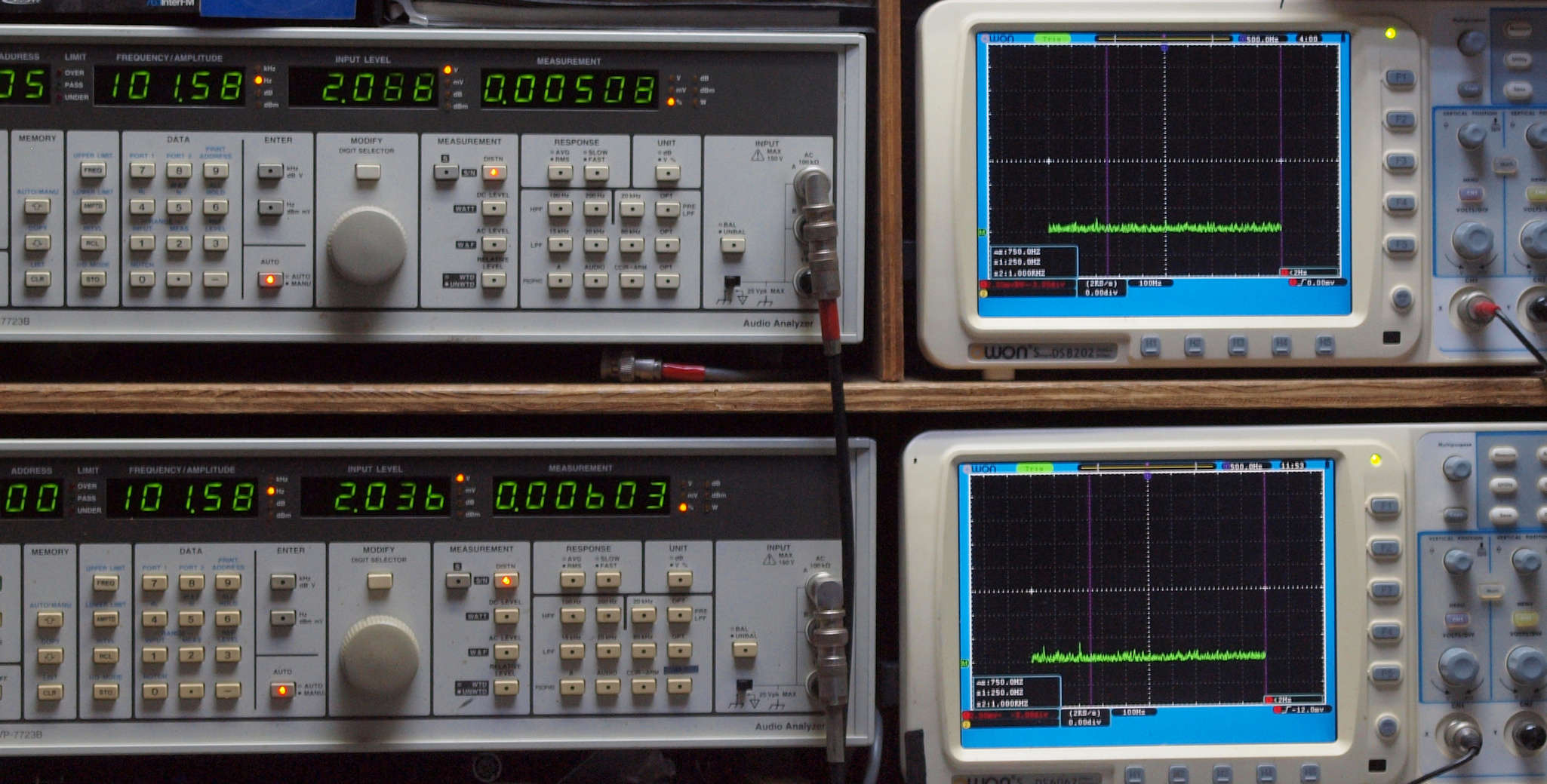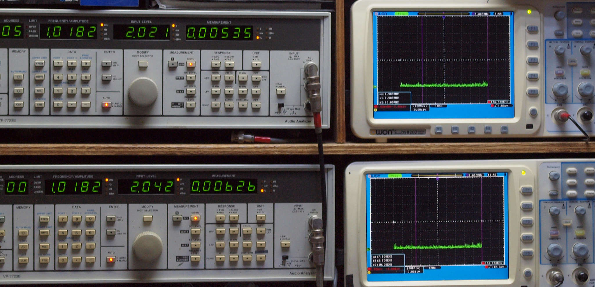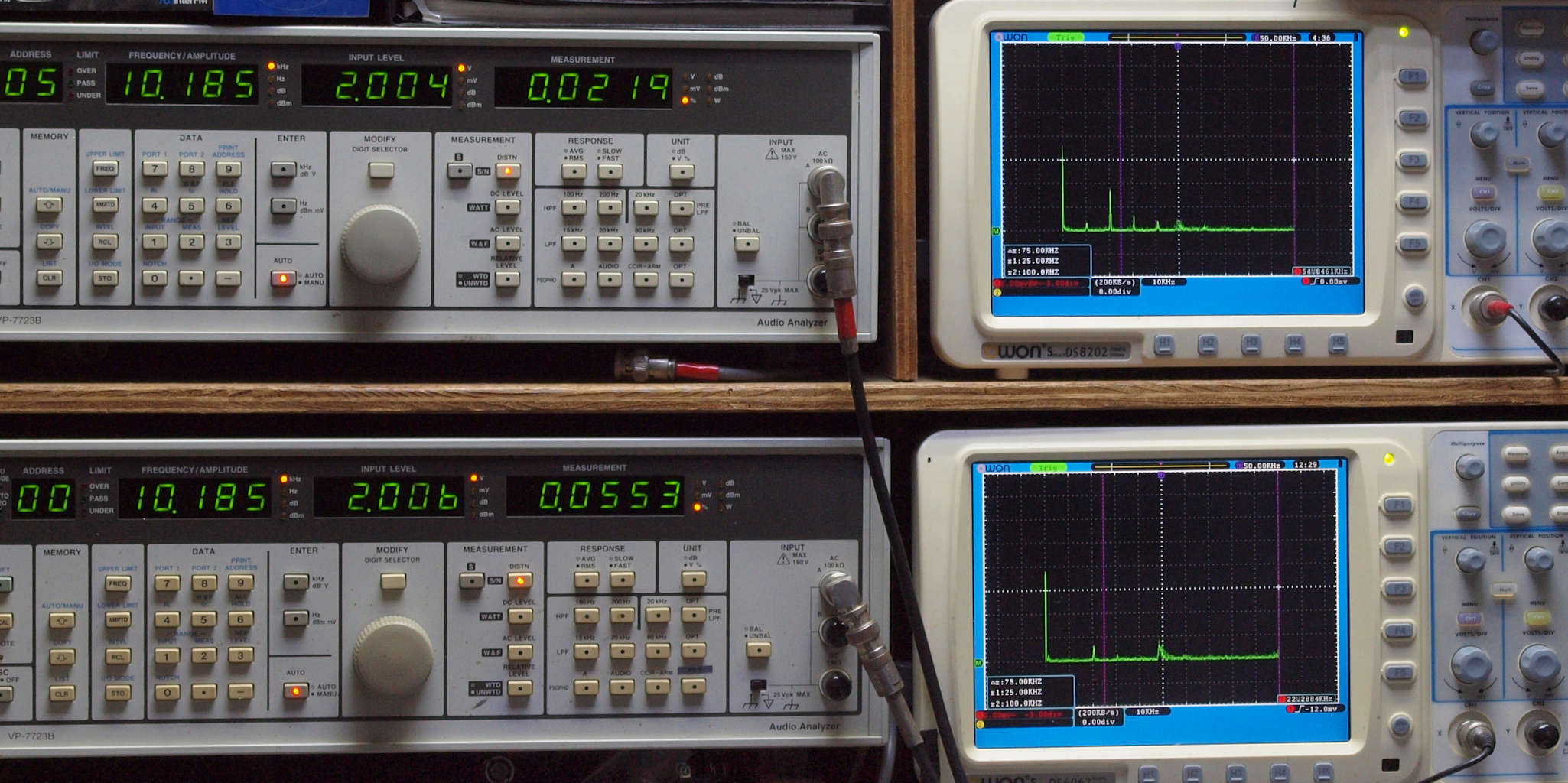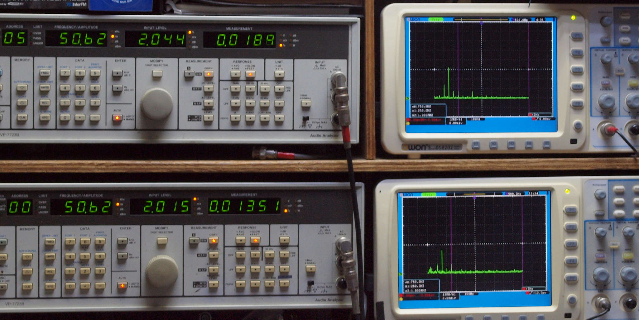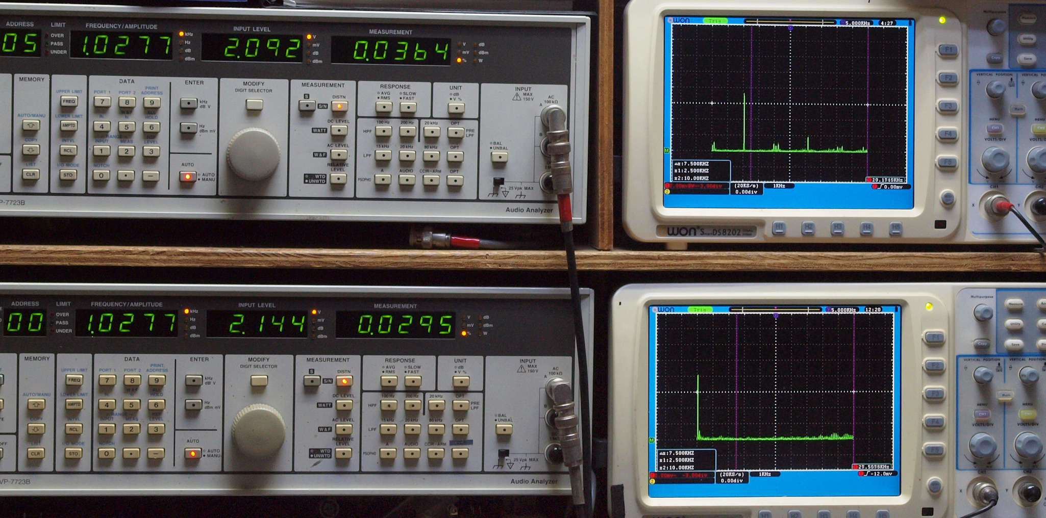 上段右端 VP−7723Bの基本波除去出力を「owon SDS8202(200MHZ)」で「FFT分析」表示。