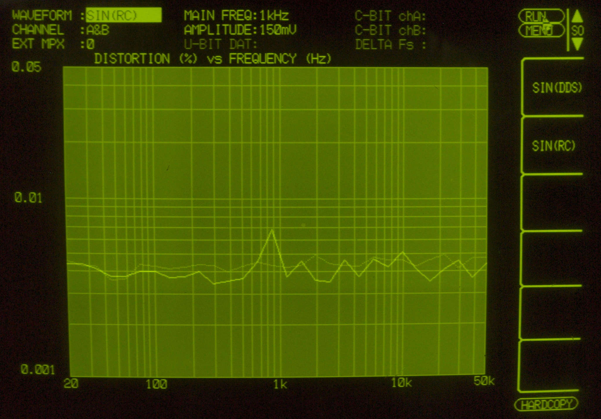 CD入力端子へ150mV一定入力 VRはmax 左出力=薄(細い)色 右出力=濃い(太い)色