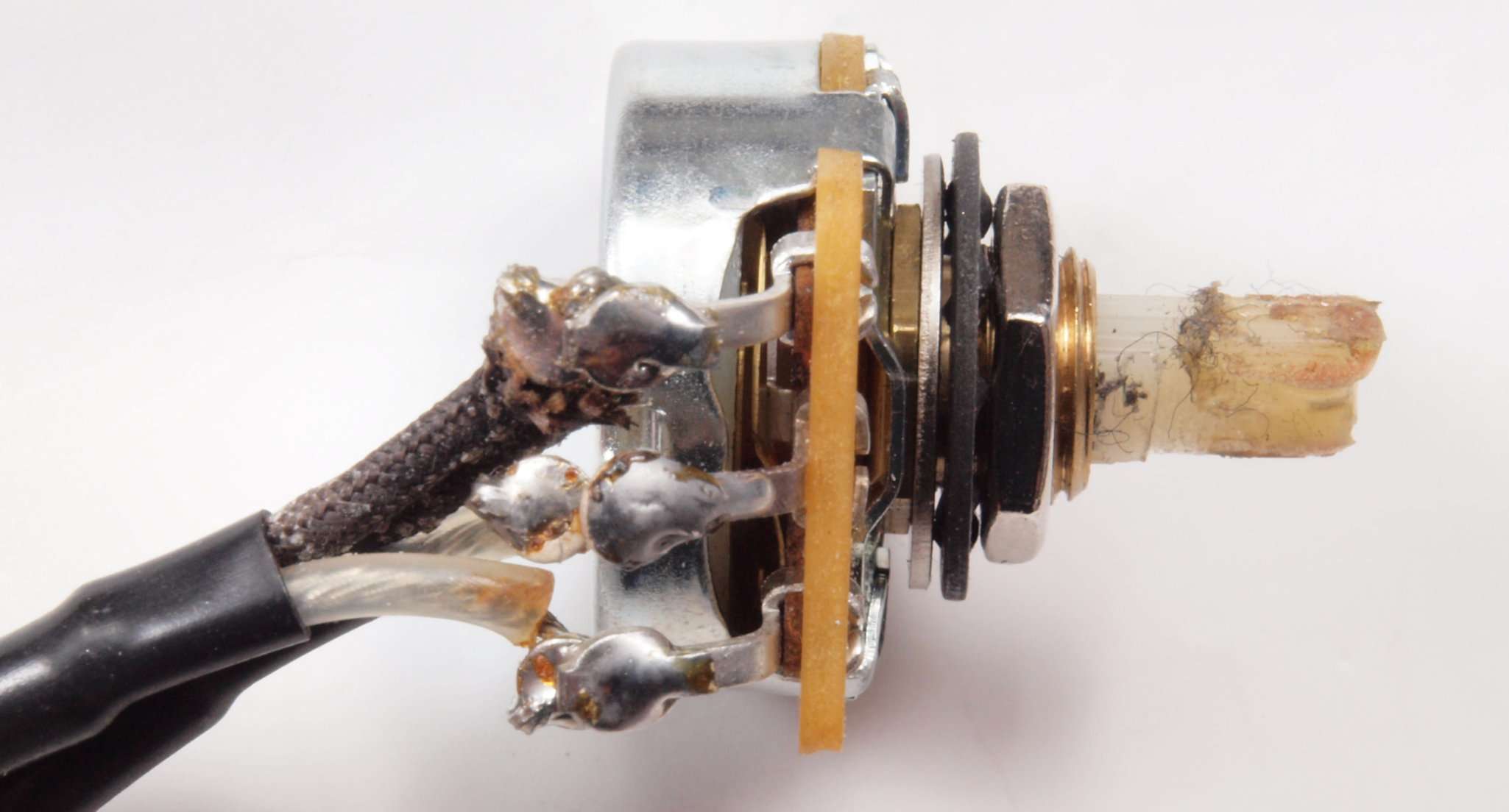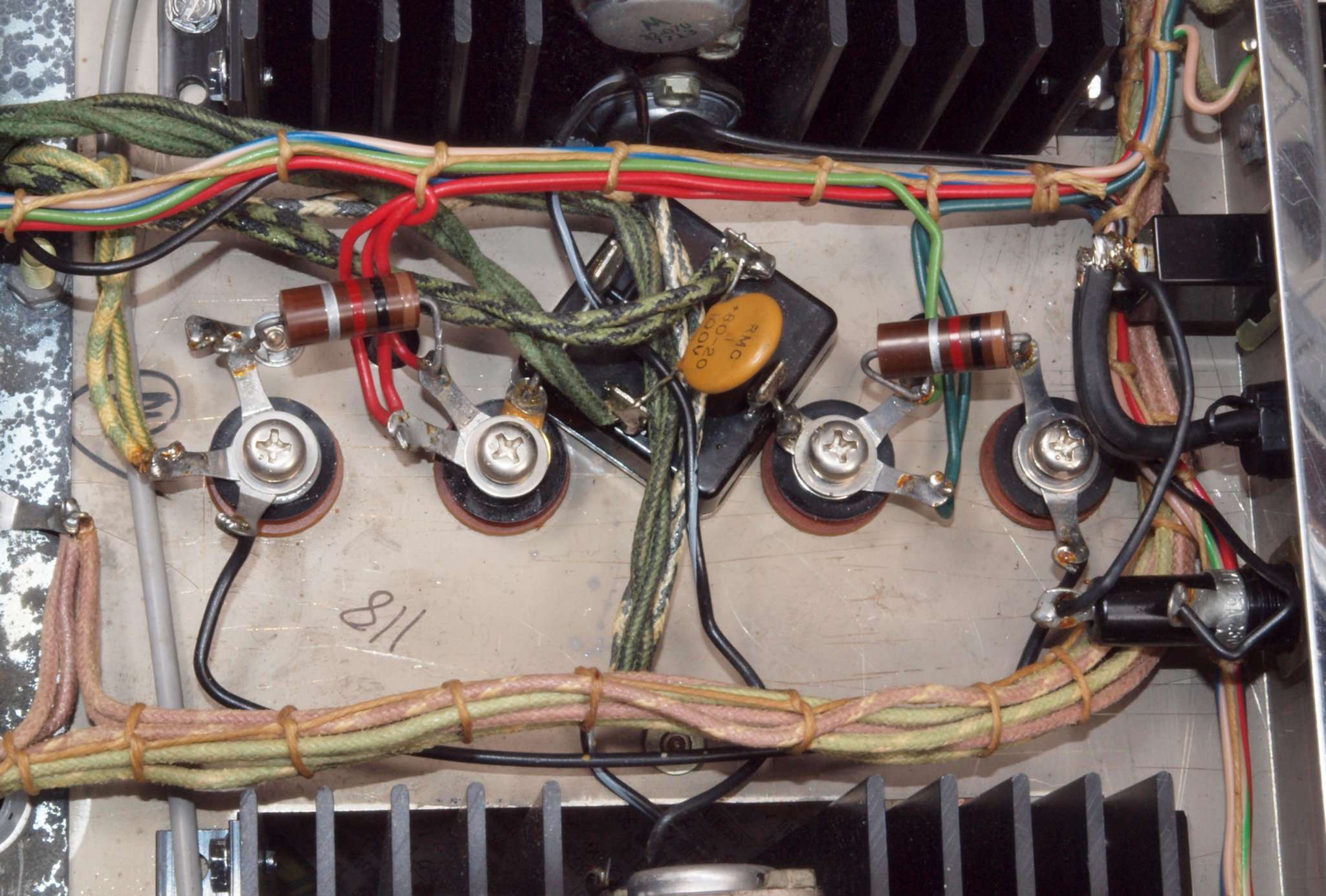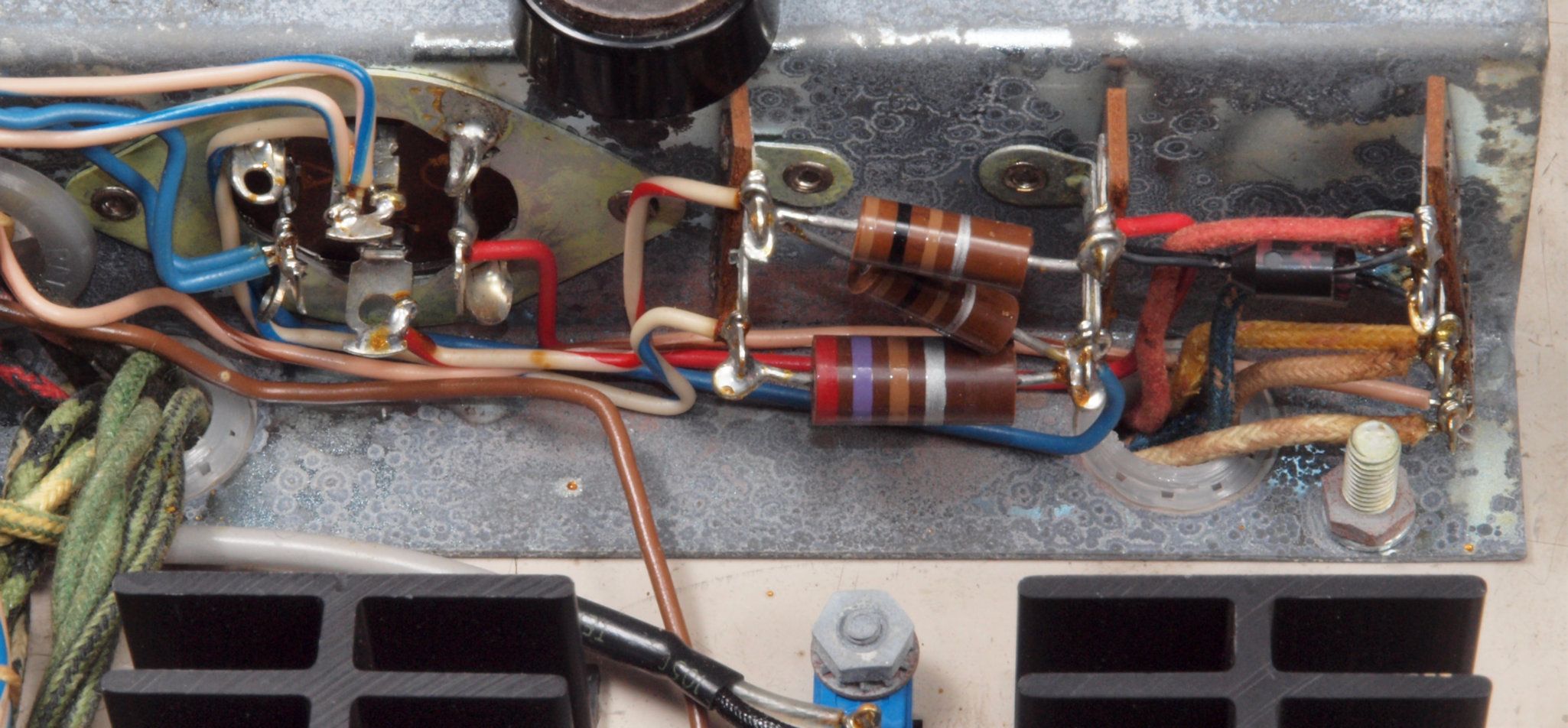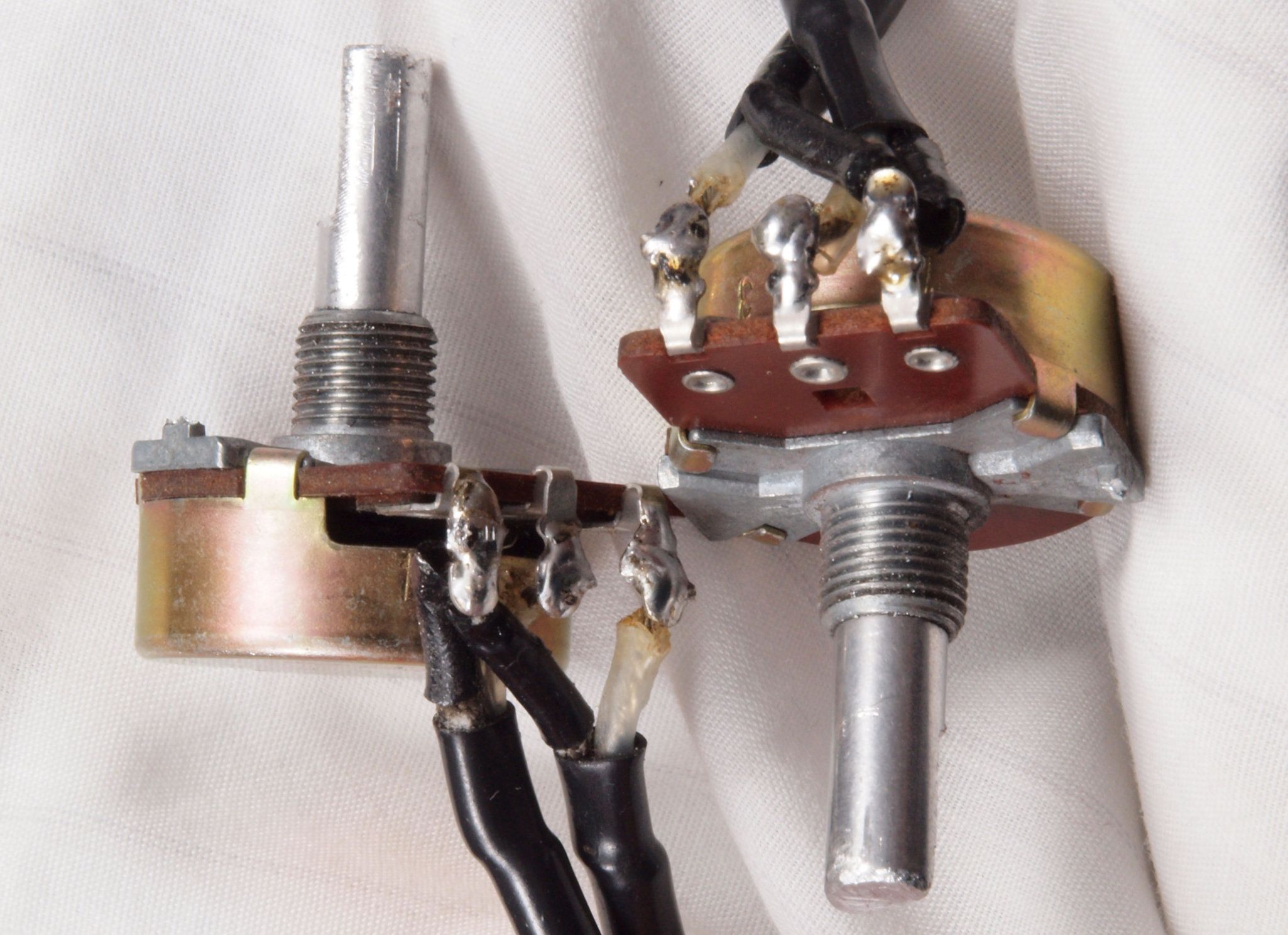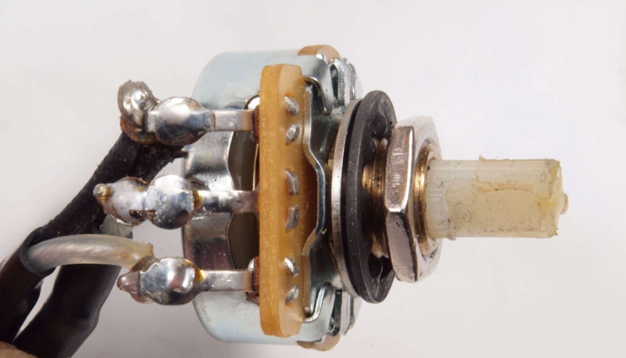 | A52. 点検中 交換されたR側入力VR、軸がプラスチック製でツマミに接着してある。前のVRの端子がそのまま。 | ||||||||||||||||||||||||||||||