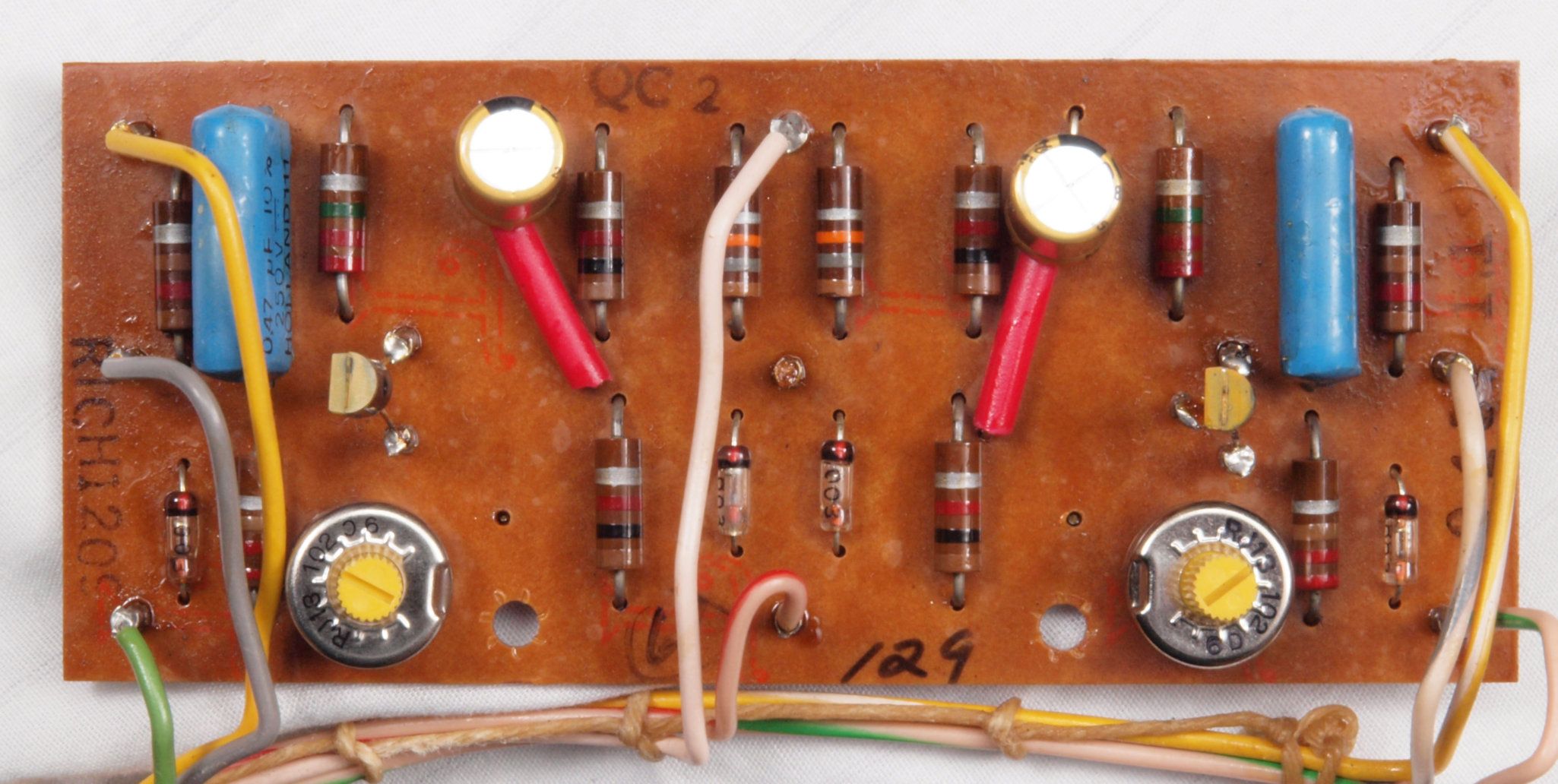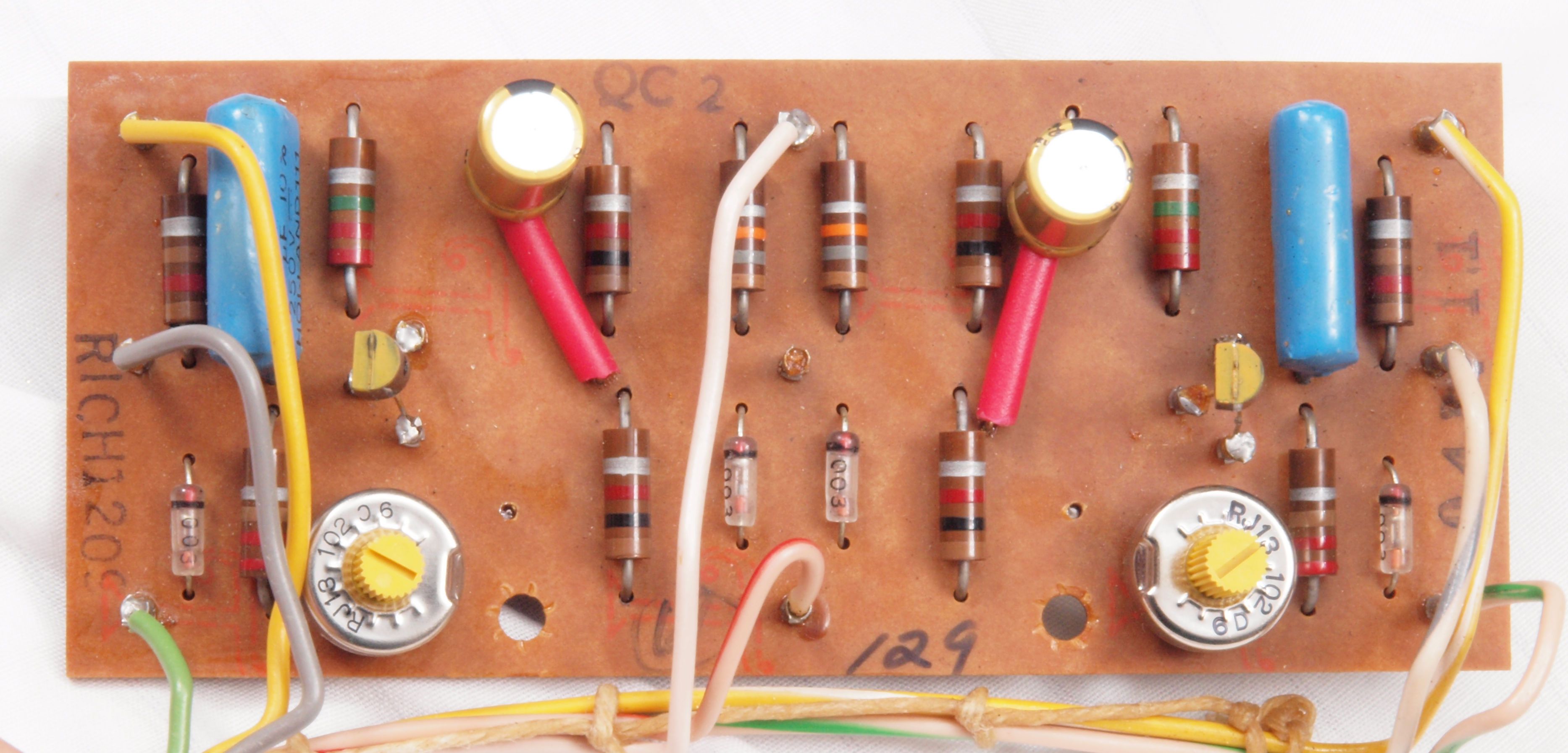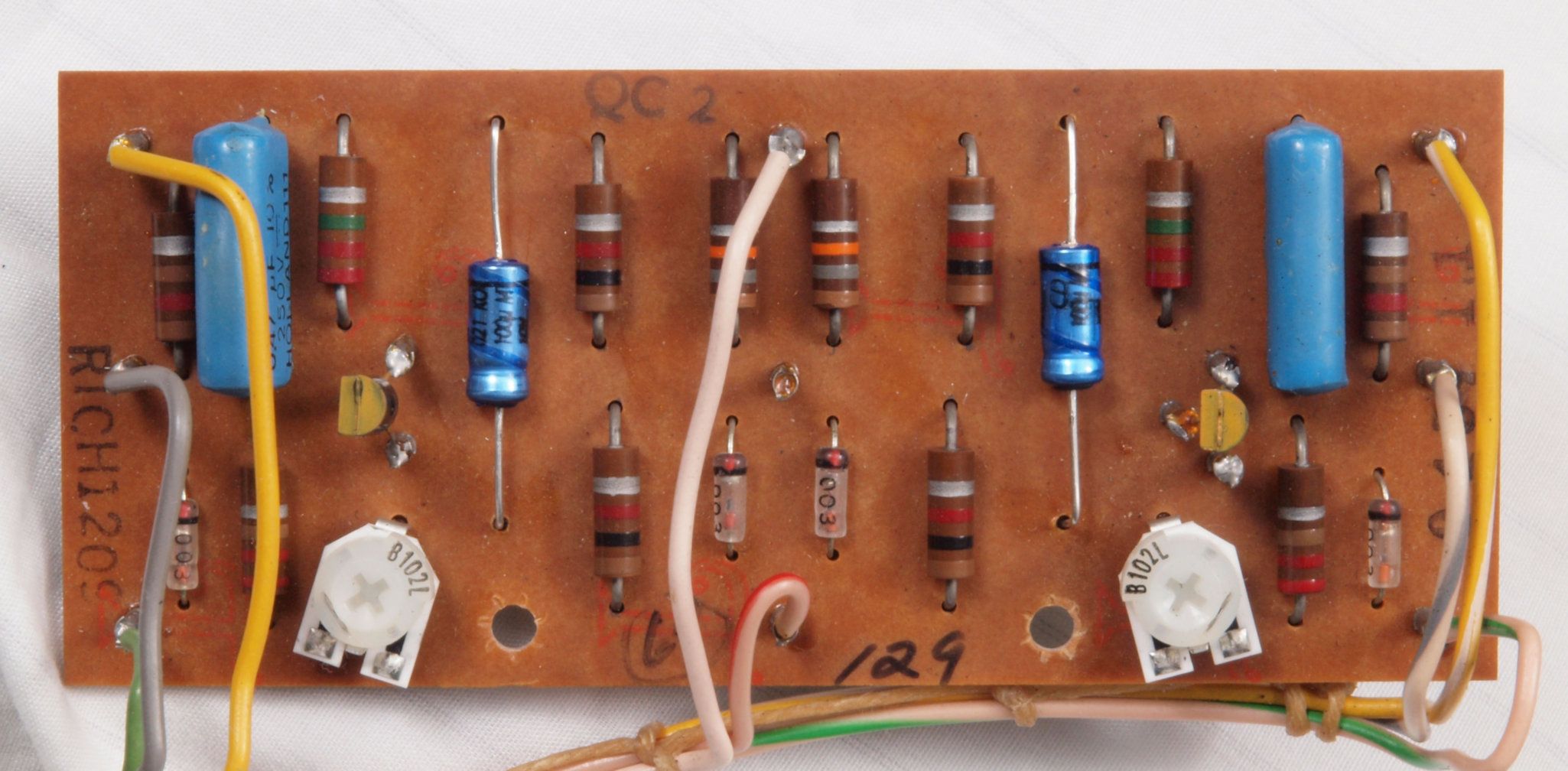 | A53. 点検中 交換されたL側入力VR、軸がプラスチック製でツマミに接着してある。前のVRの端子がそのまま。 | ||||||||||||||||||||||||||||||