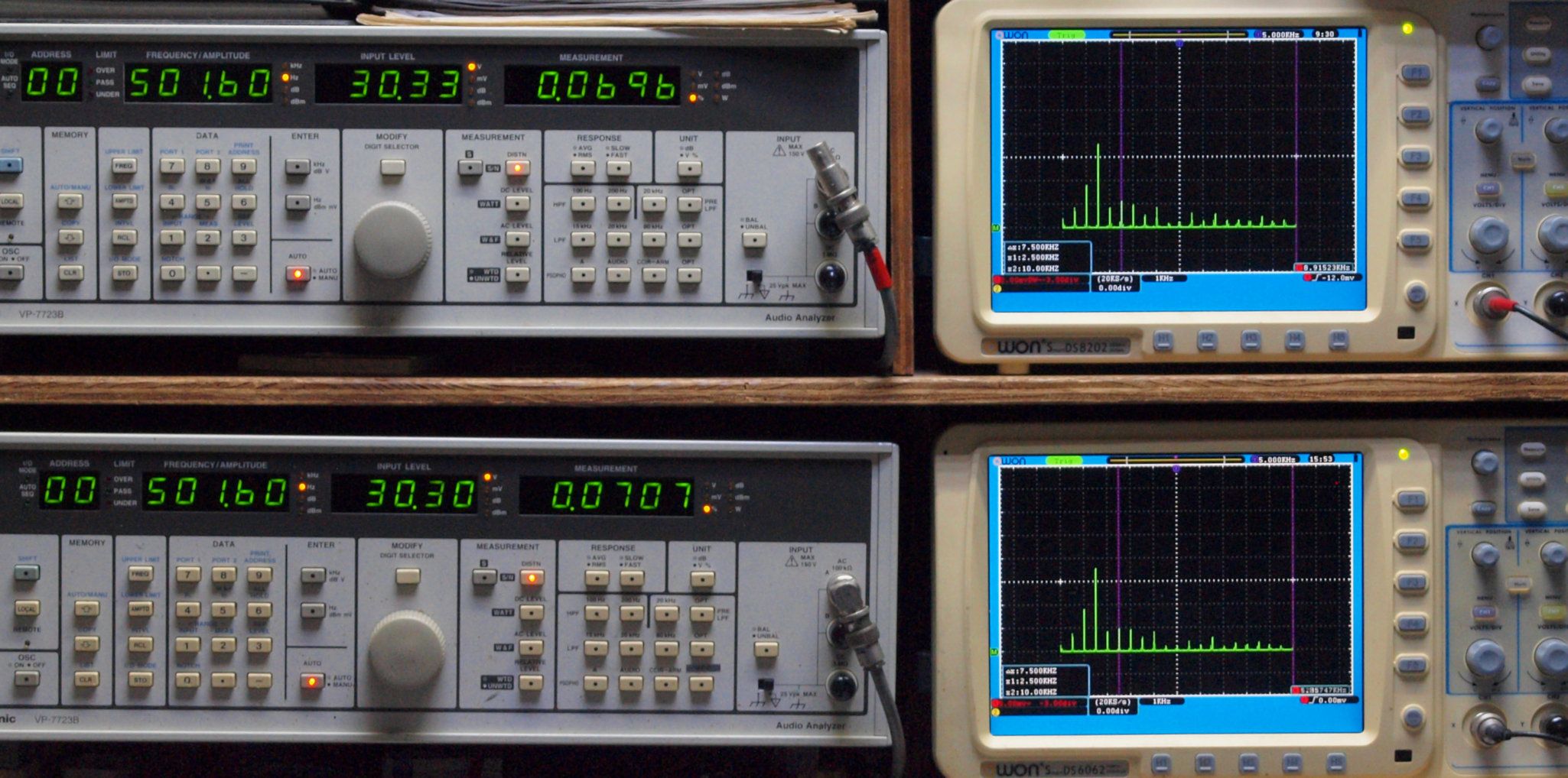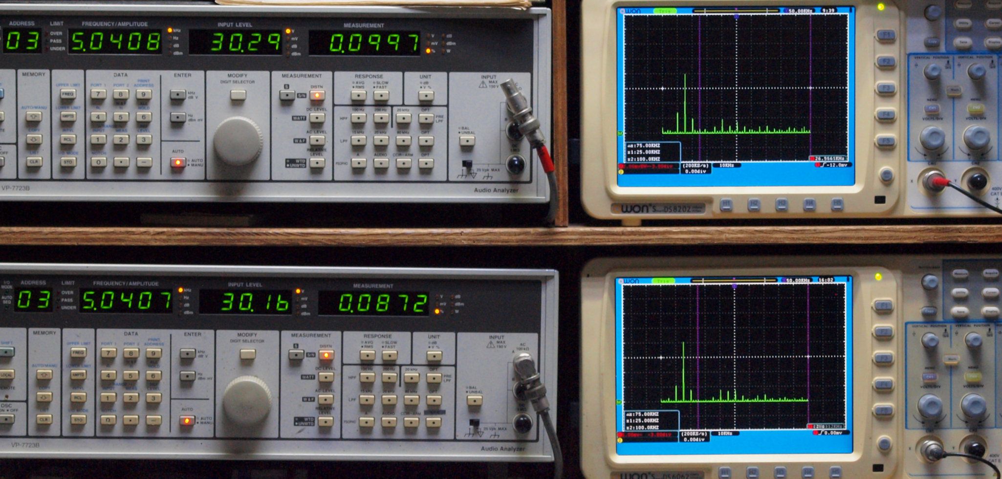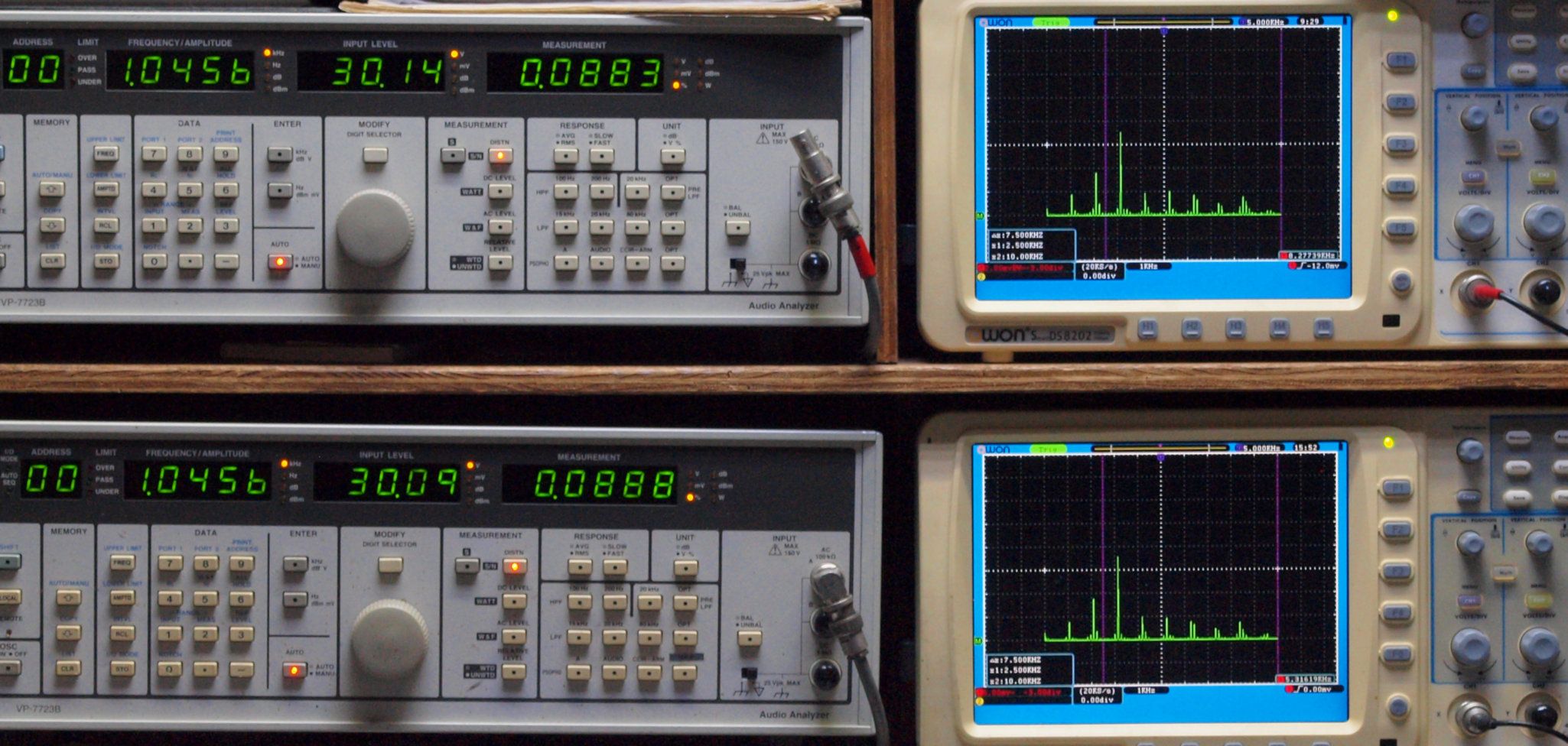 | E. 測定・調整。 画像をクリックすると、大きく(横幅2050ドット)表示されます。 E0. 出力・歪み率測定・調整 「見方」。 上段中 右側SP出力を「Audio Analyzer Panasonic VP−7723B」により測定。 表示LED、 左端=メモリーNo、 中左=周波数測定、 中右=出力電圧測定、 右端=歪み率測定。 上段右端 VP−7723Bの基本波除去出力を「owon SDS8202(200MHZ)」で「FFT分析」表示。 下段中 左側SP出力を「Audio Analyzer Panasonic VP−7723B」により測定。 表示LED、 左端=メモリーNo、 中左=周波数測定、 中右=出力電圧測定、 右端=歪み率測定。 下段右端 VP−7723Bの基本波除去出力を「owon SDS6062(200MHZ)」で「FFT分析」表示。 下段左端 オーディオ発振器 VP−7201A より50Hz〜100kHzの信号を出し(歪み率=約0.003%)、ATT+分配器を通し、AMPに入力。 よって、ダイアル設定出力レベルより低くなります。測定機器の仕様や整備の様子はこちら、「VP−7723B」「VP−7201A」。 FFT画面の見方はこちら。 |