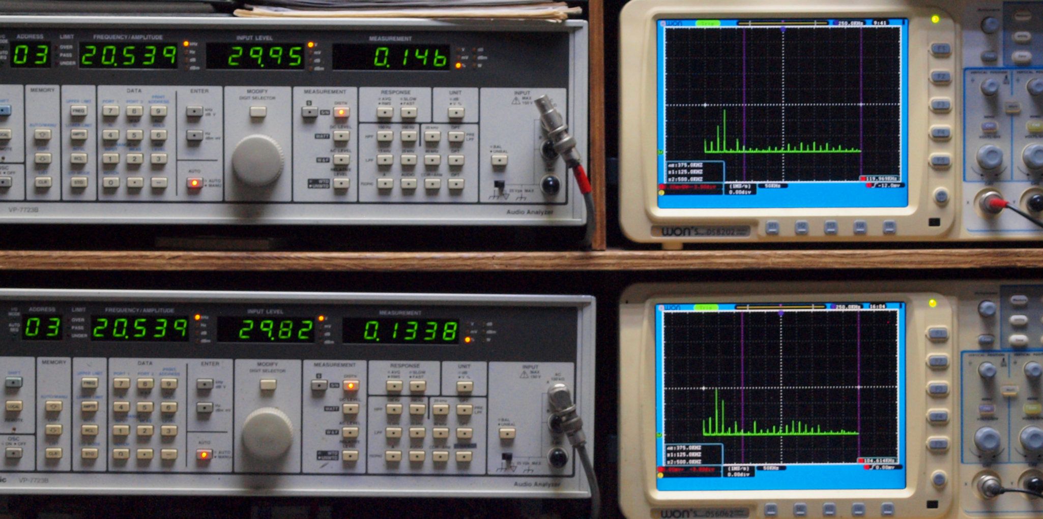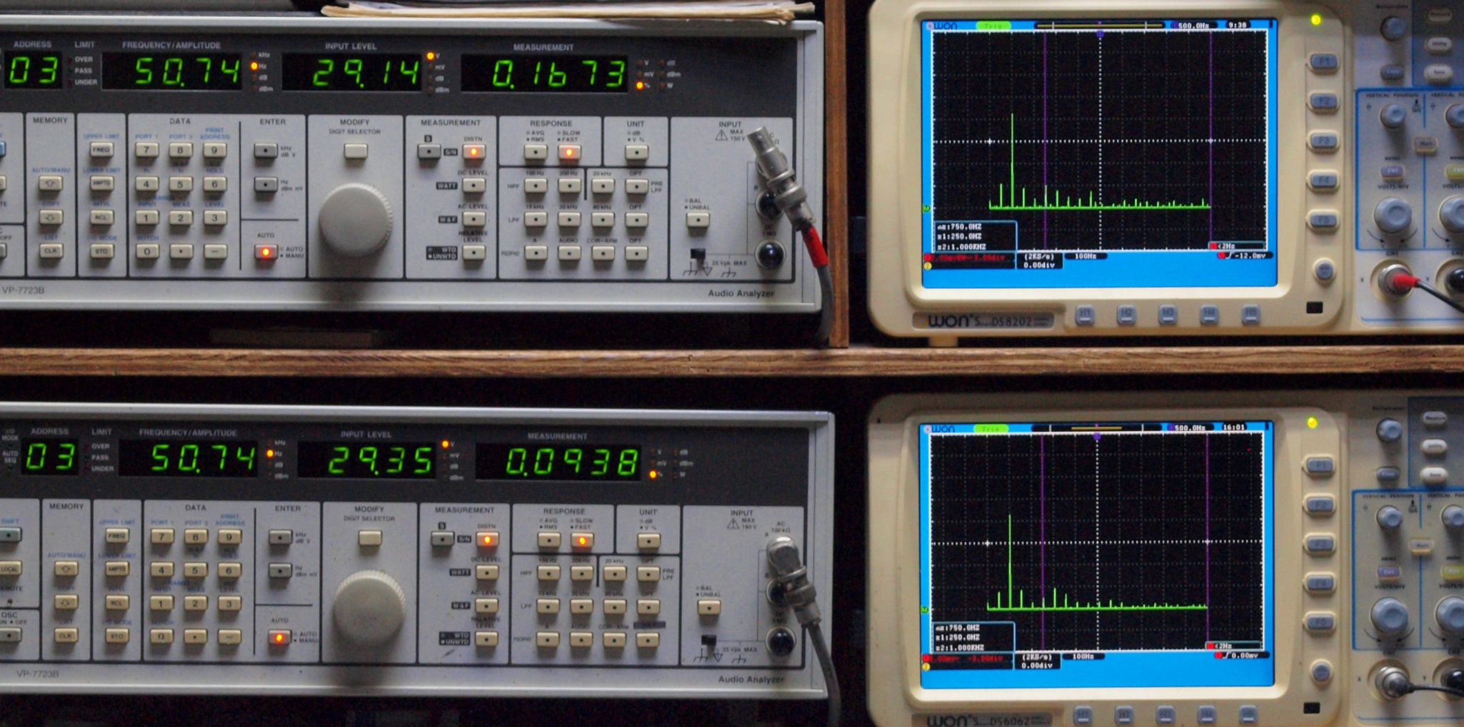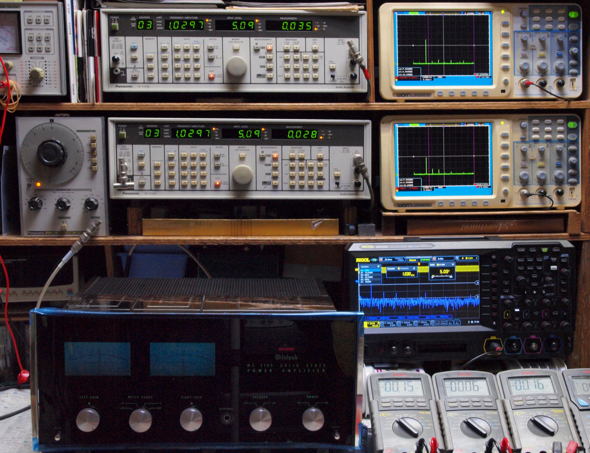 | E. 測定・調整。 画像をクリックすると、大きく(横幅2050ドット)表示されます。 E0. 出力・歪み率測定・調整 「見方」。 上段中 右側SP出力を「Audio Analyzer Panasonic VP−7723B」により測定。 表示LED、 左端=メモリーNo、 中左=周波数測定、 中右=出力電圧測定、 右端=歪み率測定。 上段右端 VP−7723Bの基本波除去出力を「owon SDS8202(200MHZ)」で「FFT分析」表示。 下段中 左側SP出力を「Audio Analyzer Panasonic VP−7723B」により測定。 表示LED、 左端=メモリーNo、 中左=周波数測定、 中右=出力電圧測定、 右端=歪み率測定。 下段右端 VP−7723Bの基本波除去出力を「owon SDS6062(200MHZ)」で「FFT分析」表示。 下段左端 オーディオ発振器 VP−7201A より50Hz〜100kHzの信号を出し(歪み率=約0.003%)、ATT+分配器を通し、AMPに入力。 よって、ダイアル設定出力レベルより低くなります。測定機器の仕様や整備の様子はこちら、「VP−7723B」「VP−7201A」。 FFT画面の見方はこちら。 |