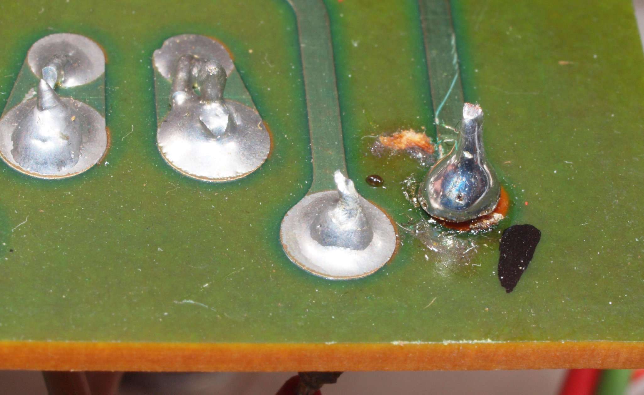 | C34. 修理前 プリAMP裏。前回の電解コンデンサー交換で銅箔剥離が生じている。 | ||||||||||||||||||||||||||||||