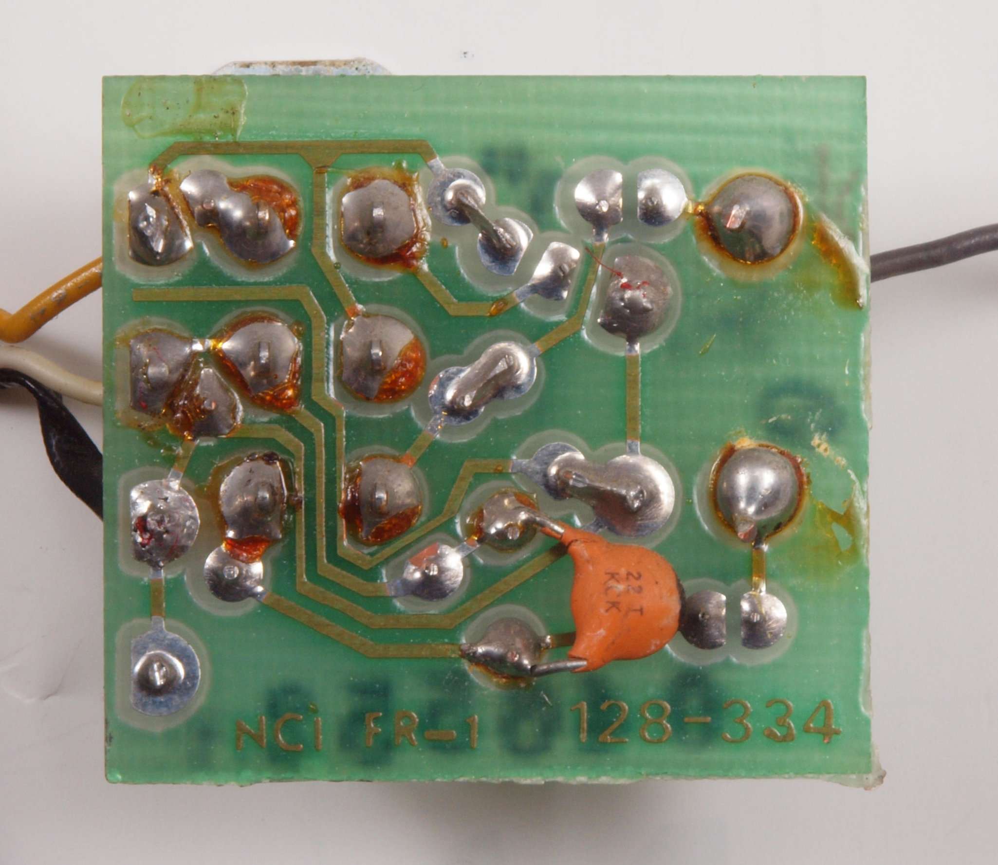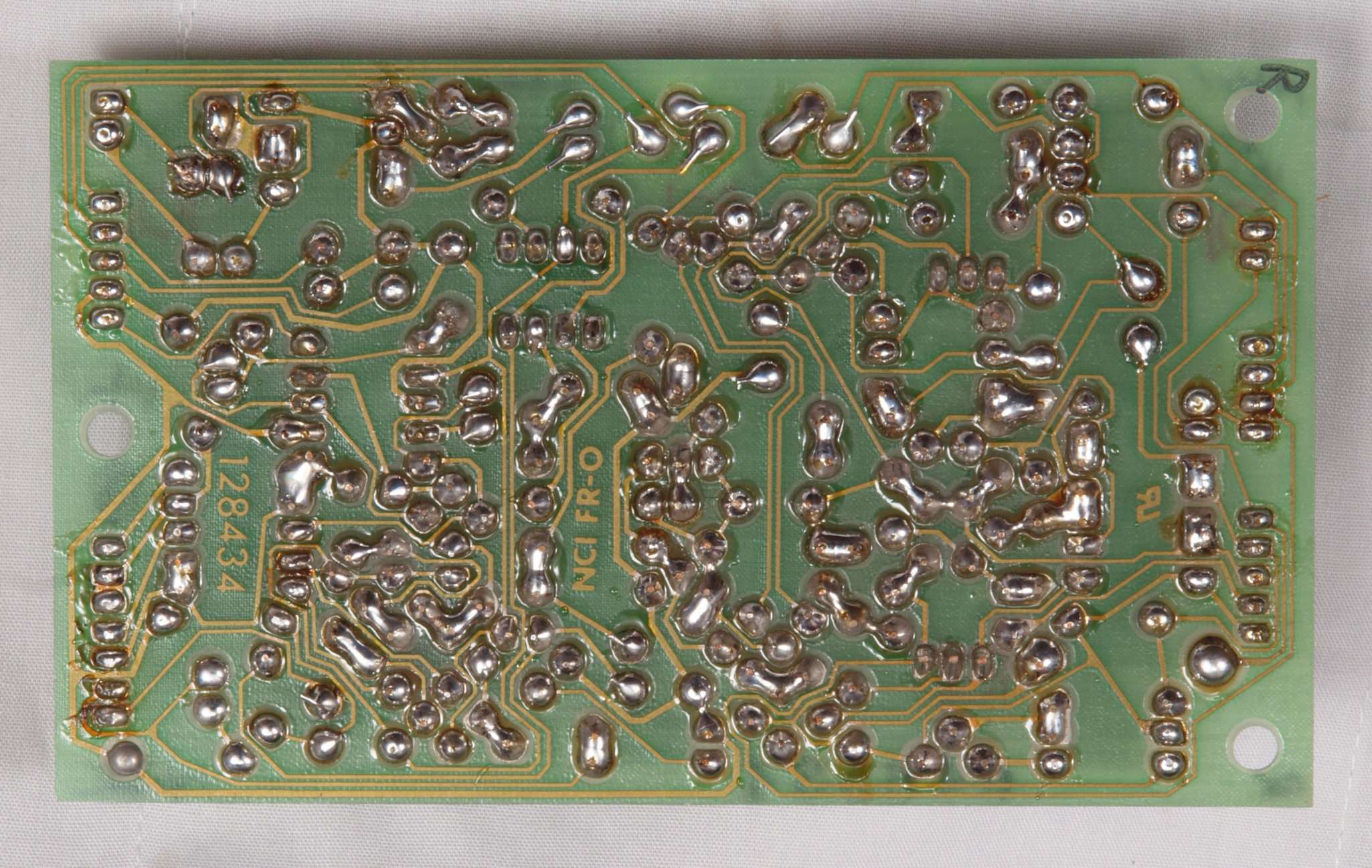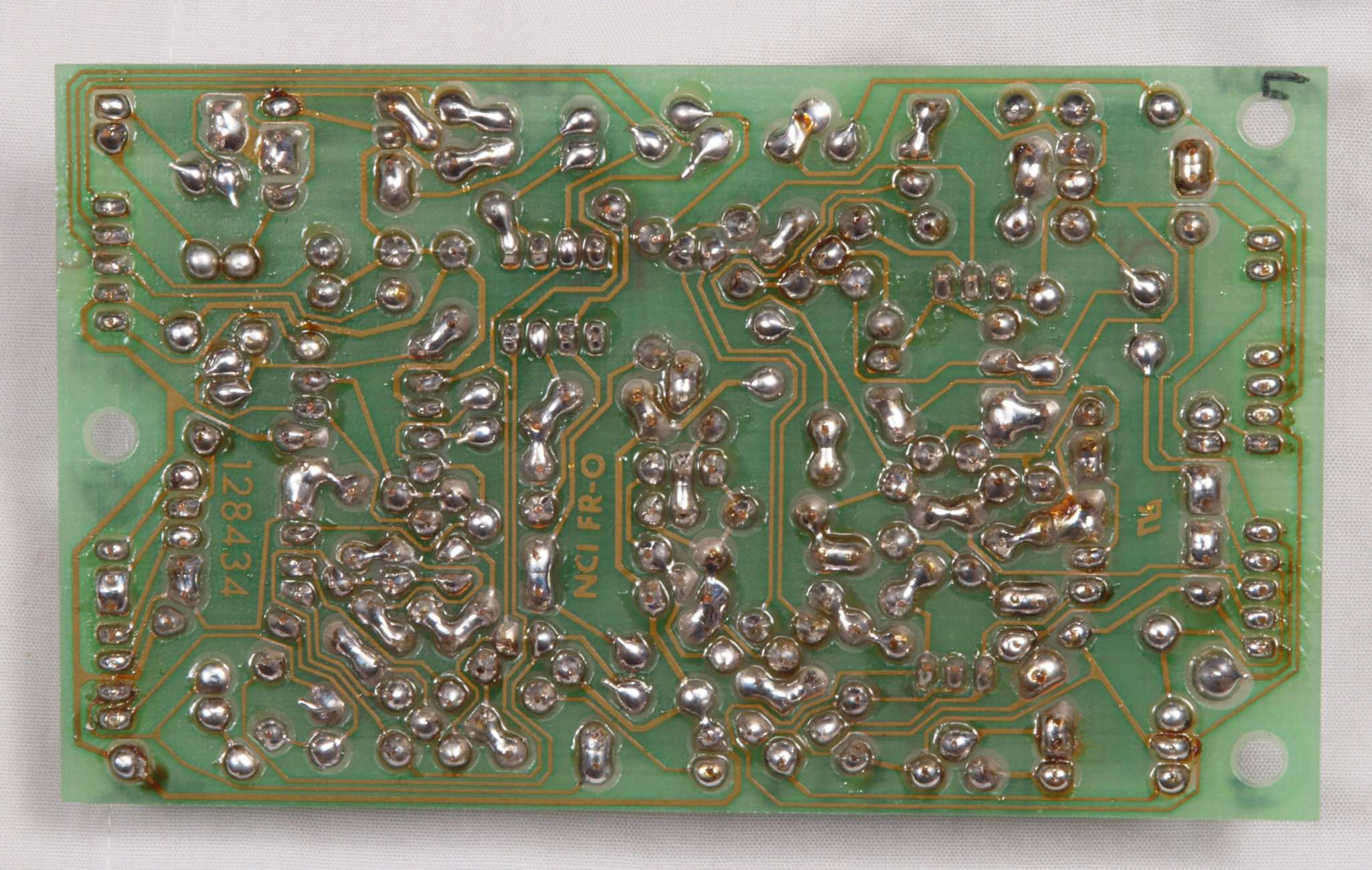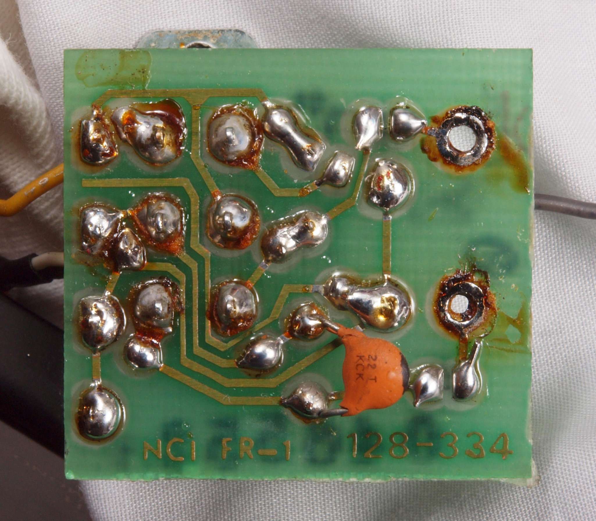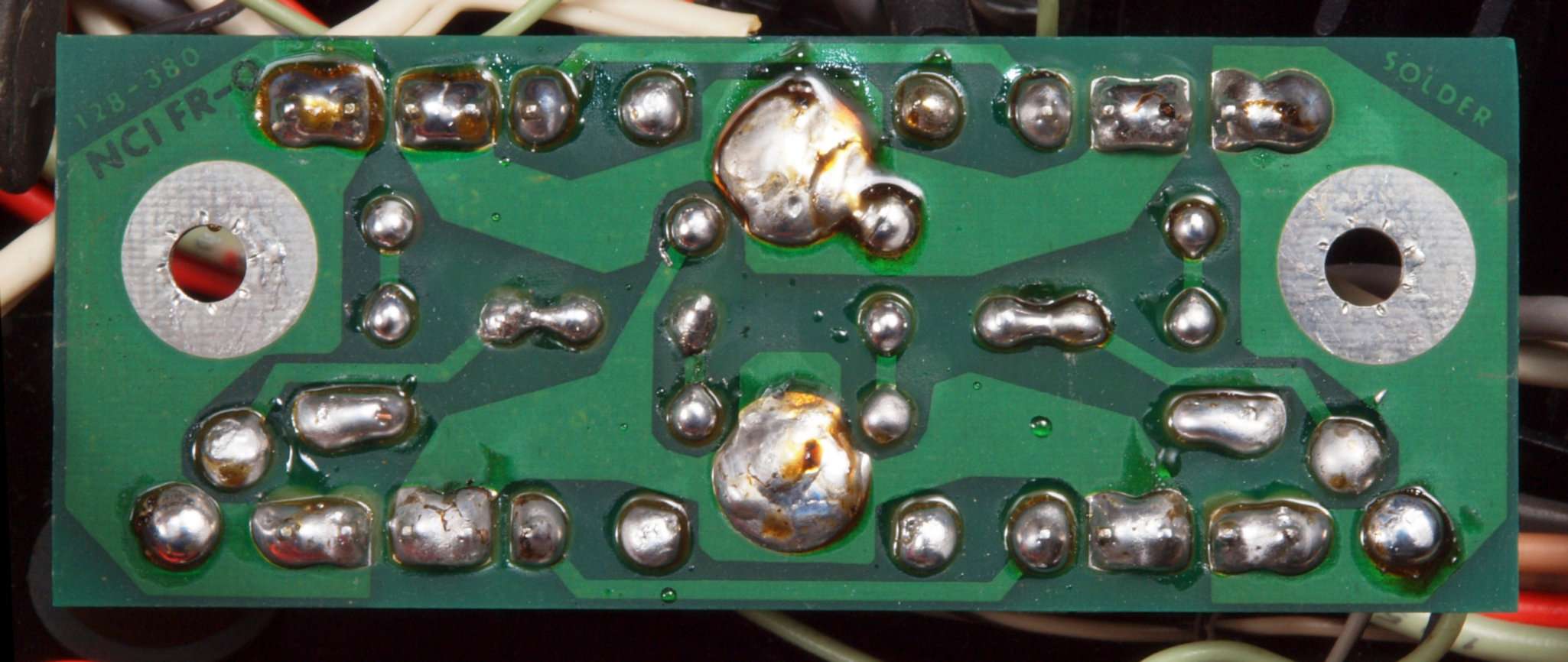 | CB4. 修理前 ブロック電解コンデンサー・ジョイント基板裏。ドブ付け半田方式。 | ||||||||||||||||||||||||||||||||||