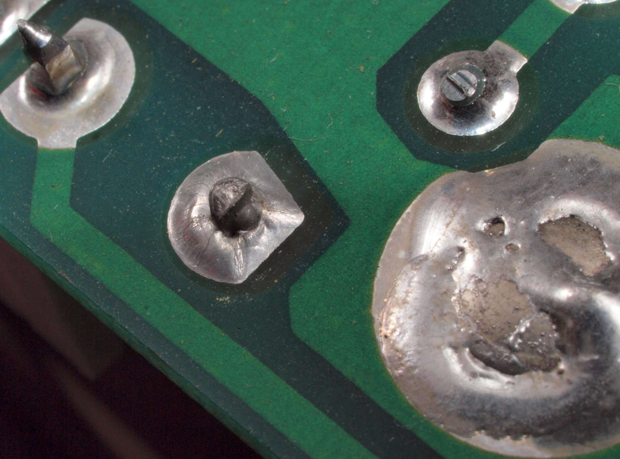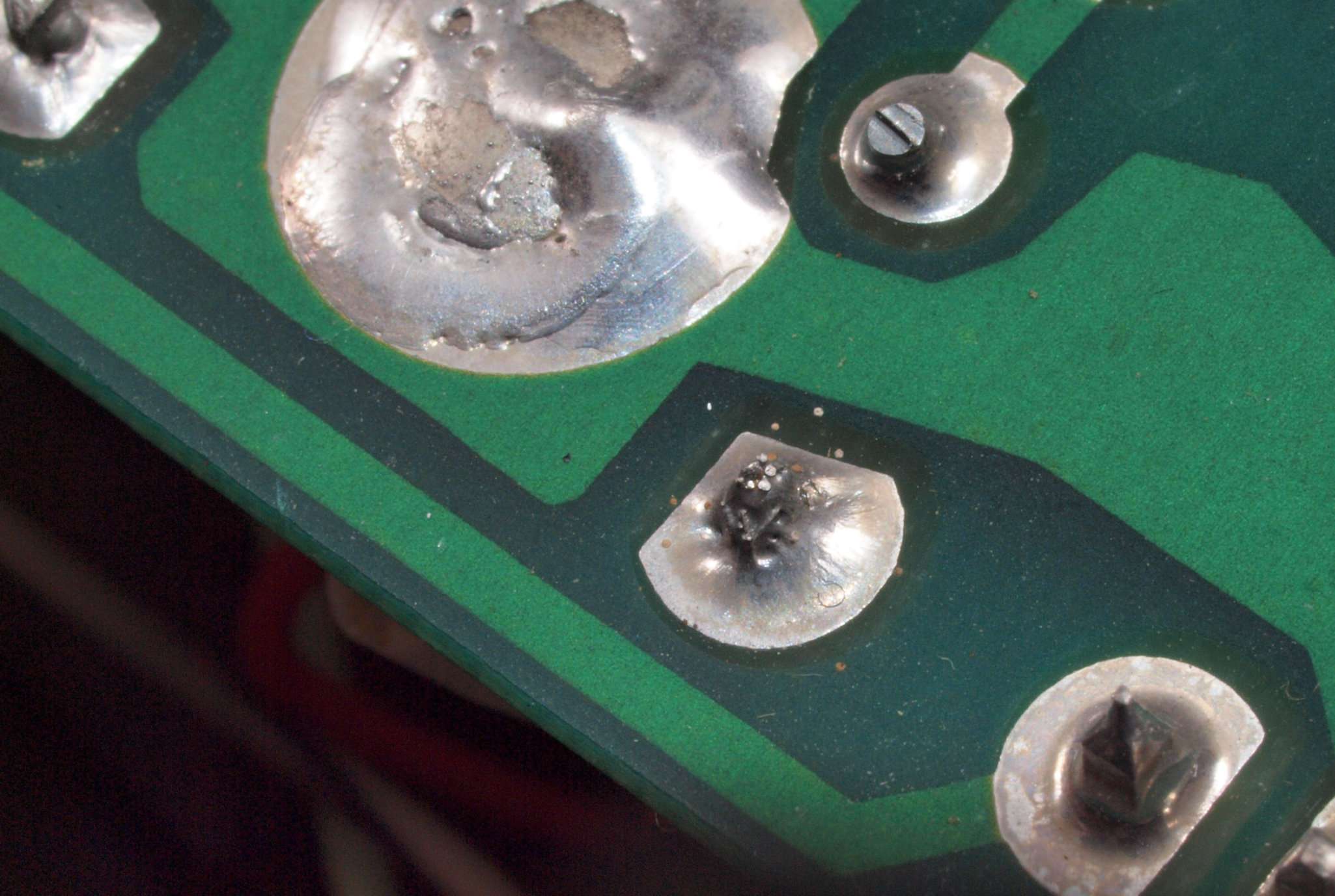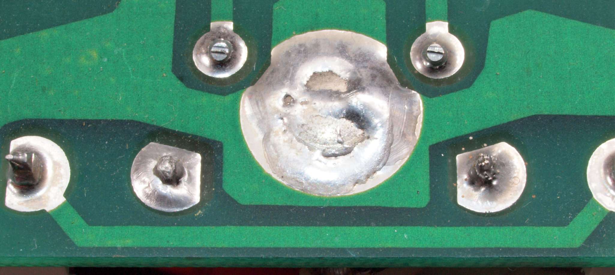 | CB42. 修理中 ブロック電解コンデンサー・ジョイント基板裏。半田不良ケ所、拡大。 | ||||||||||||||||||||||||||||||||||