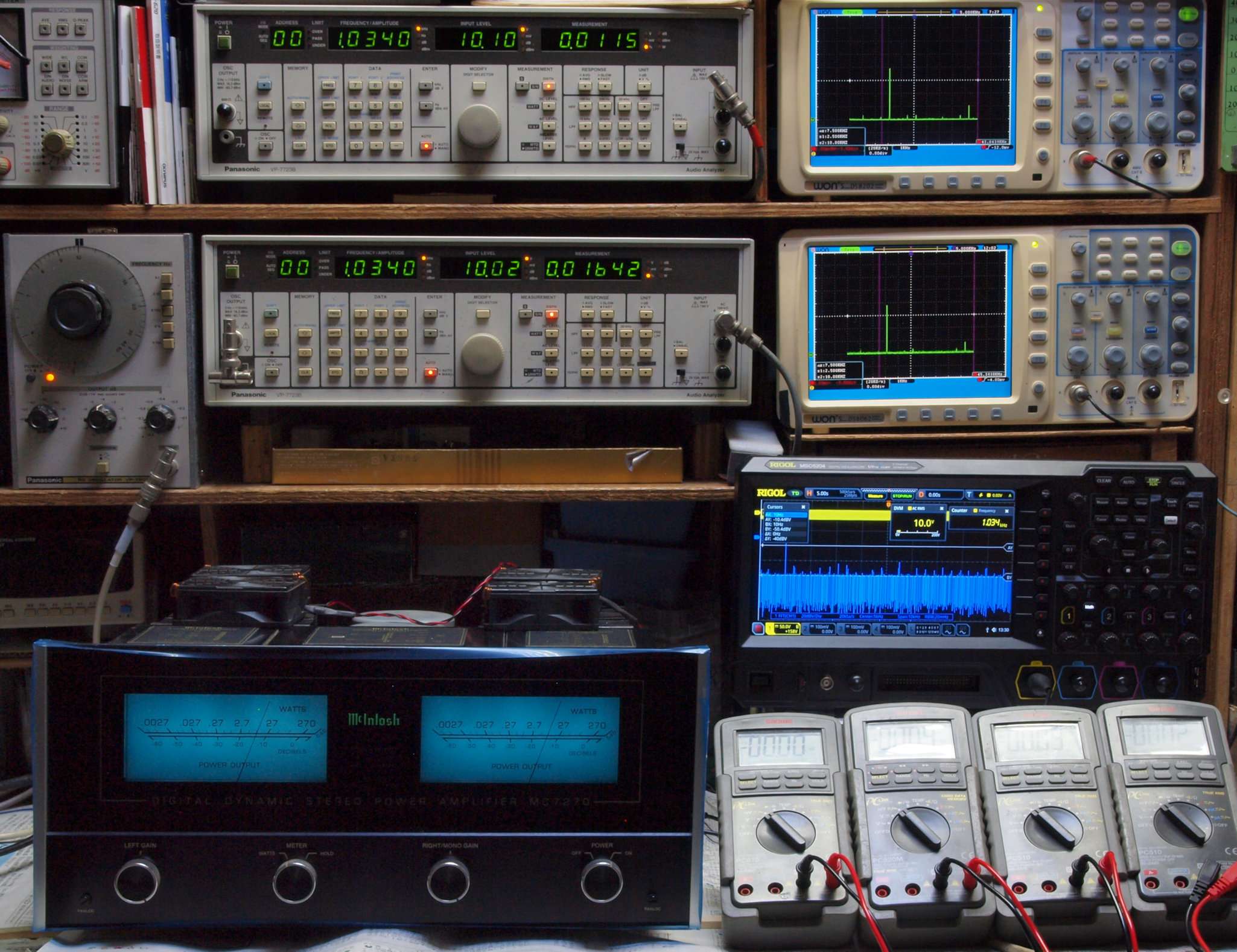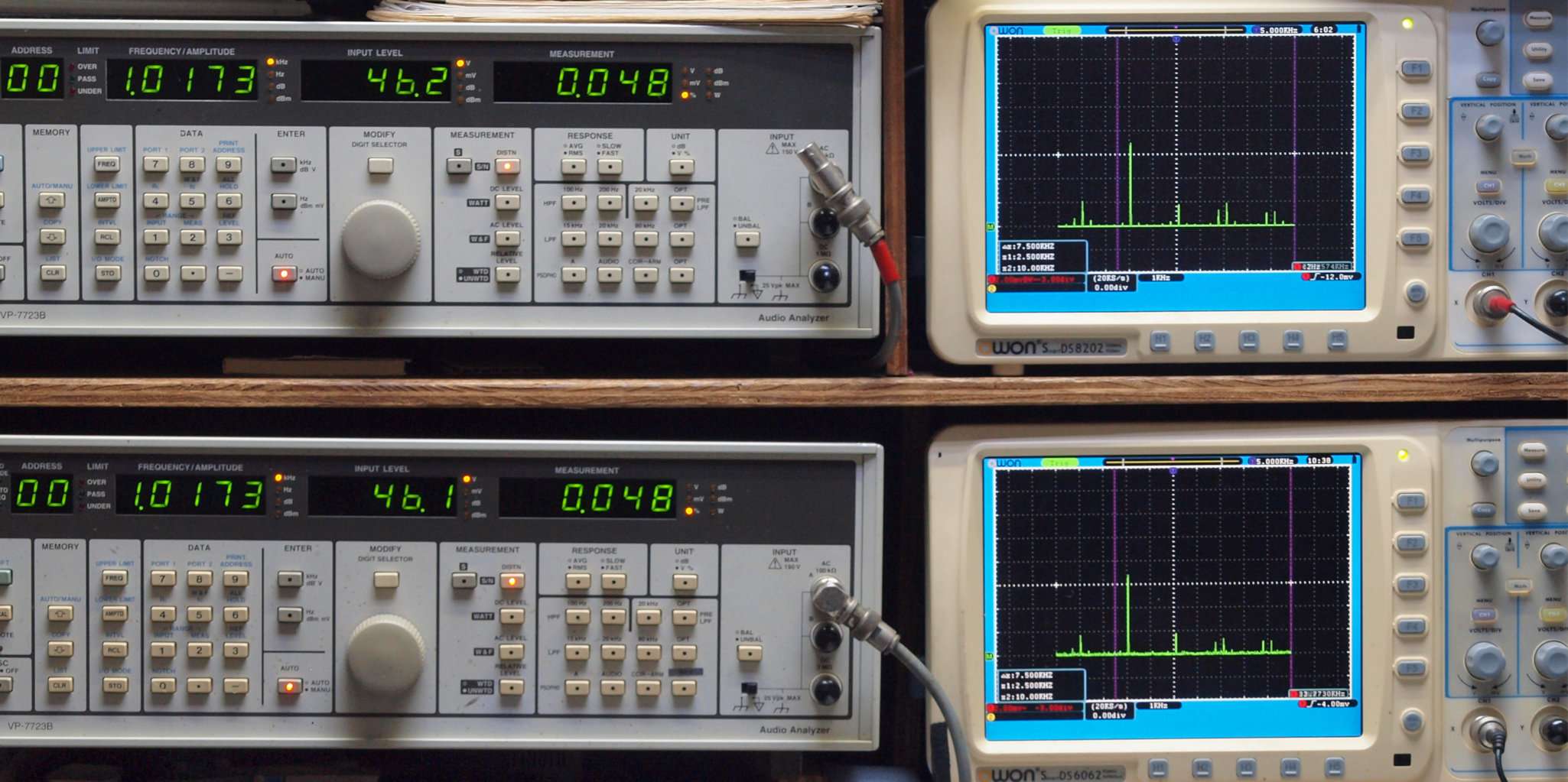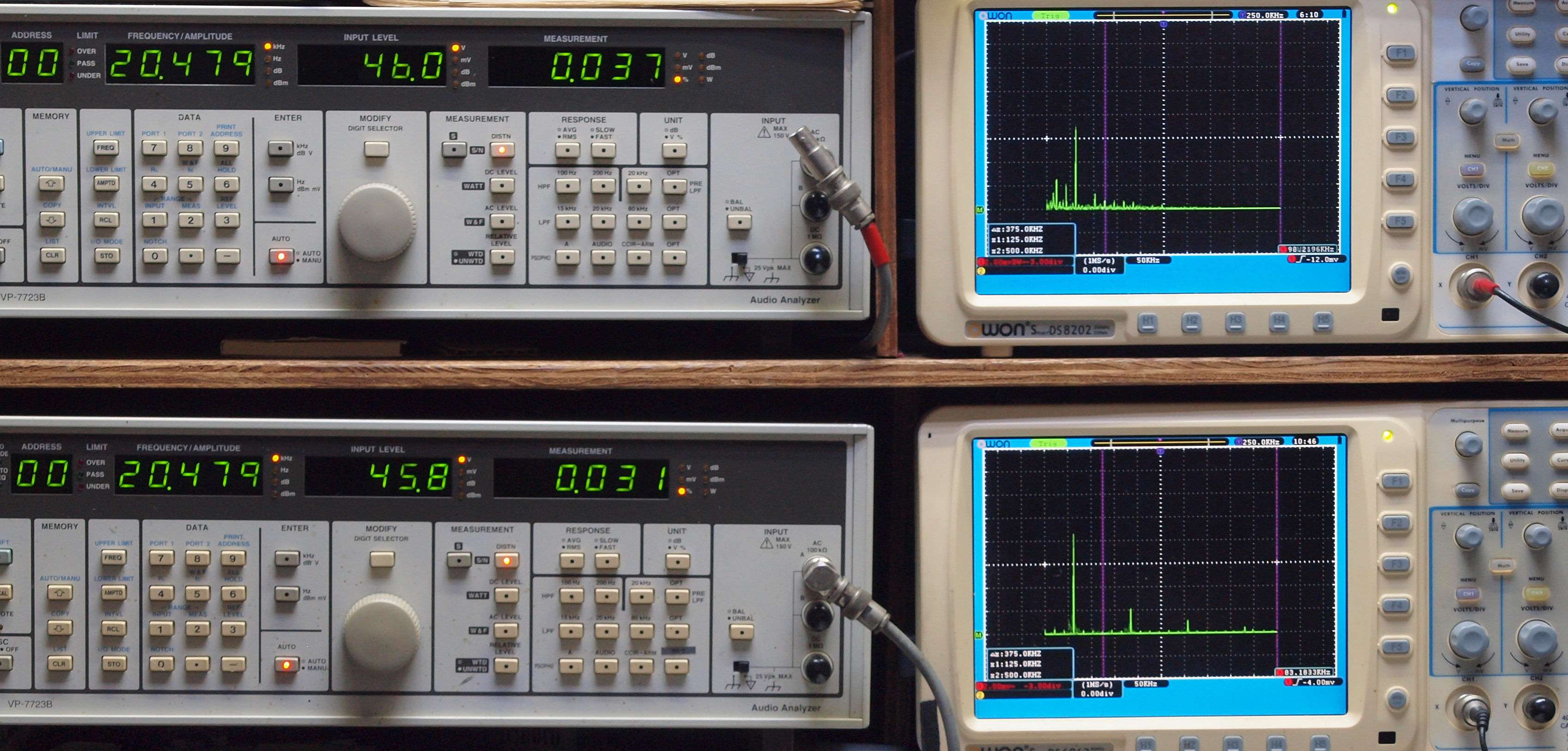 | E. 測定・調整。 画像をクリックすると、大きく(横幅2050ドット)表示されます。 E1. 出力・歪み率測定・調整 「見方」。 上段中 右側SP出力を「Audio Analyzer Panasonic VP−7723B」により測定。 表示LED、 左端=メモリーNo、 中左=周波数測定、 中右=出力電圧測定、 右端=歪み率測定。 上段右端 VP−7723Bの基本波除去出力を「owon SDS8202(200MHZ)」で「FFT分析」表示。 下段中 左側SP出力を「Audio Analyzer Panasonic VP−7723B」により測定。 表示LED、 左端=メモリーNo、 中左=周波数測定、 中右=出力電圧測定、 右端=歪み率測定。 下段右端 VP−7723Bの基本波除去出力を「owon SDS6062(200MHZ)」で「FFT分析」表示。 下段左端 オーディオ発振器 VP−7201A より50Hz〜100kHzの信号を出し(歪み率=約0.003%)、ATT+分配器を通し、AMPに入力。 よって、ダイアル設定出力レベルより低くなります。測定機器の仕様や整備の様子はこちら、「VP−7723B」「VP−7201A」。 FFT画面の見方はこちら。 |