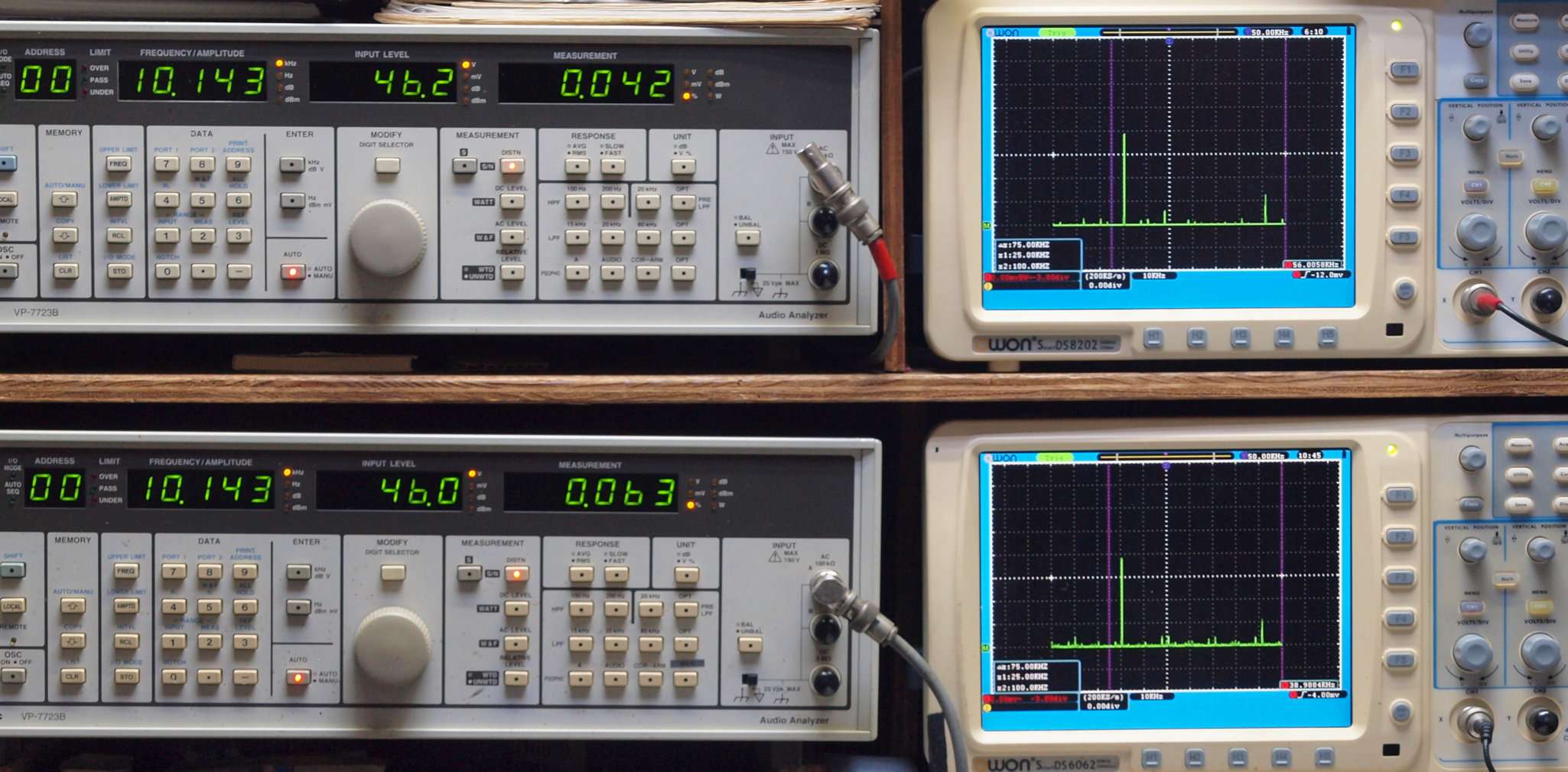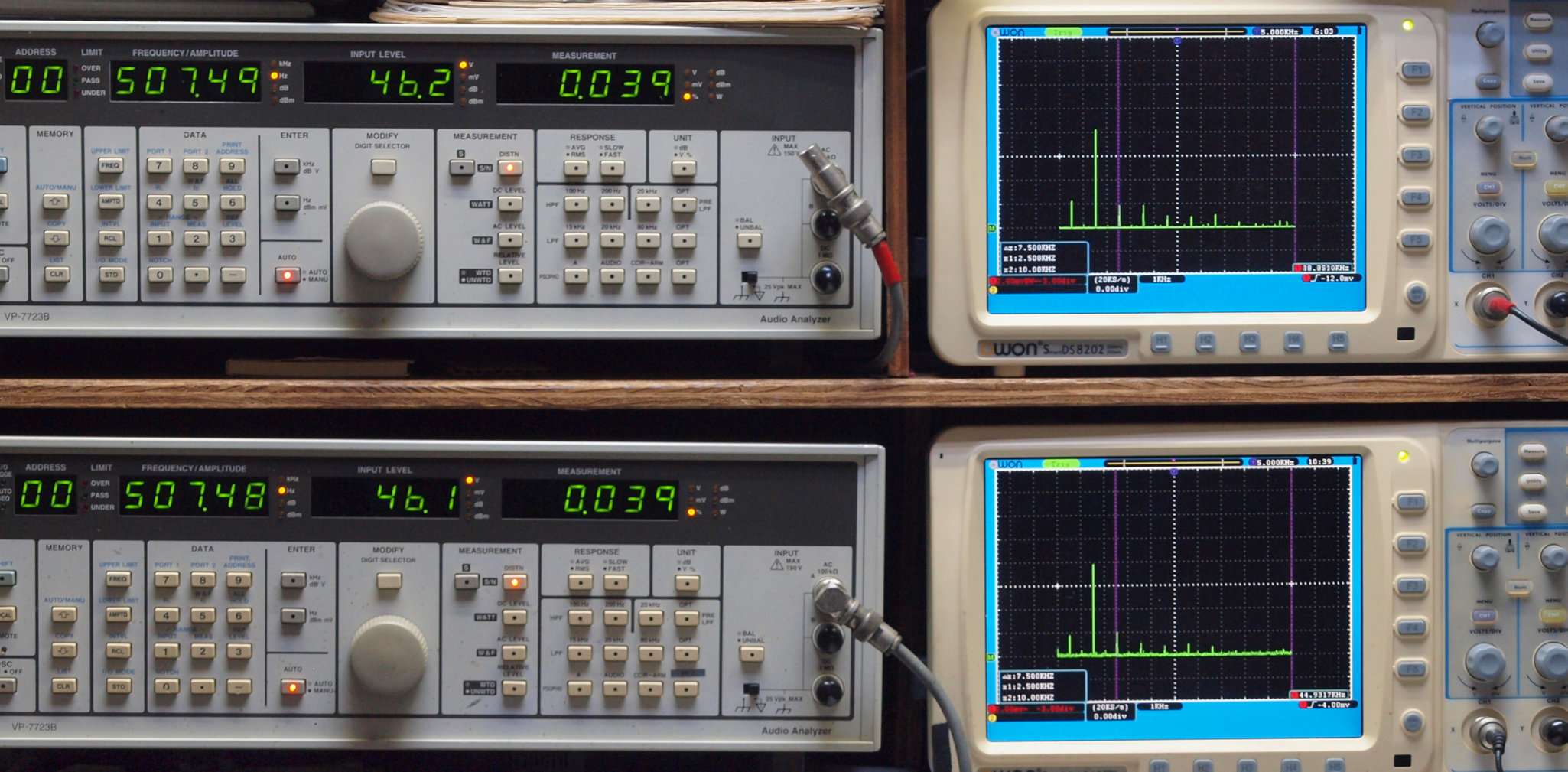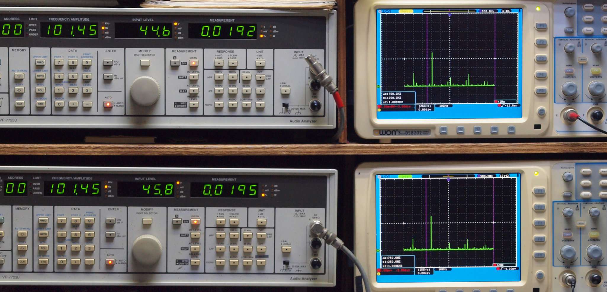 | E. 測定・調整。 画像をクリックすると、大きく(横幅2050ドット)表示されます。 E1. 出力・歪み率測定・調整 「見方」。 上段中 右側SP出力を「Audio Analyzer Panasonic VP−7723B」により測定。 表示LED、 左端=メモリーNo、 中左=周波数測定、 中右=出力電圧測定、 右端=歪み率測定。 上段右端 VP−7723Bの基本波除去出力を「owon SDS8202(200MHZ)」で「FFT分析」表示。 下段中 左側SP出力を「Audio Analyzer Panasonic VP−7723B」により測定。 表示LED、 左端=メモリーNo、 中左=周波数測定、 中右=出力電圧測定、 右端=歪み率測定。 下段右端 VP−7723Bの基本波除去出力を「owon SDS6062(200MHZ)」で「FFT分析」表示。 下段左端 オーディオ発振器 VP−7201A より50Hz〜100kHzの信号を出し(歪み率=約0.003%)、ATT+分配器を通し、AMPに入力。 よって、ダイアル設定出力レベルより低くなります。測定機器の仕様や整備の様子はこちら、「VP−7723B」「VP−7201A」。 FFT画面の見方はこちら。 |