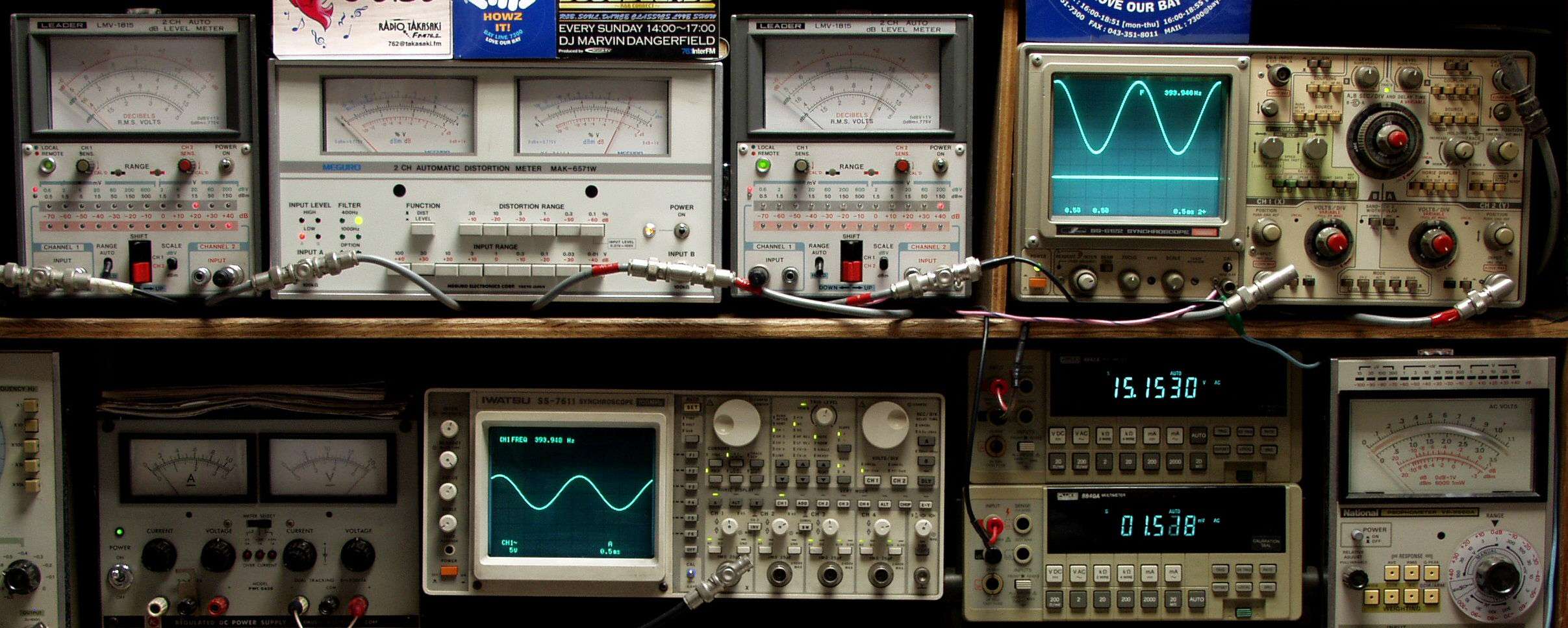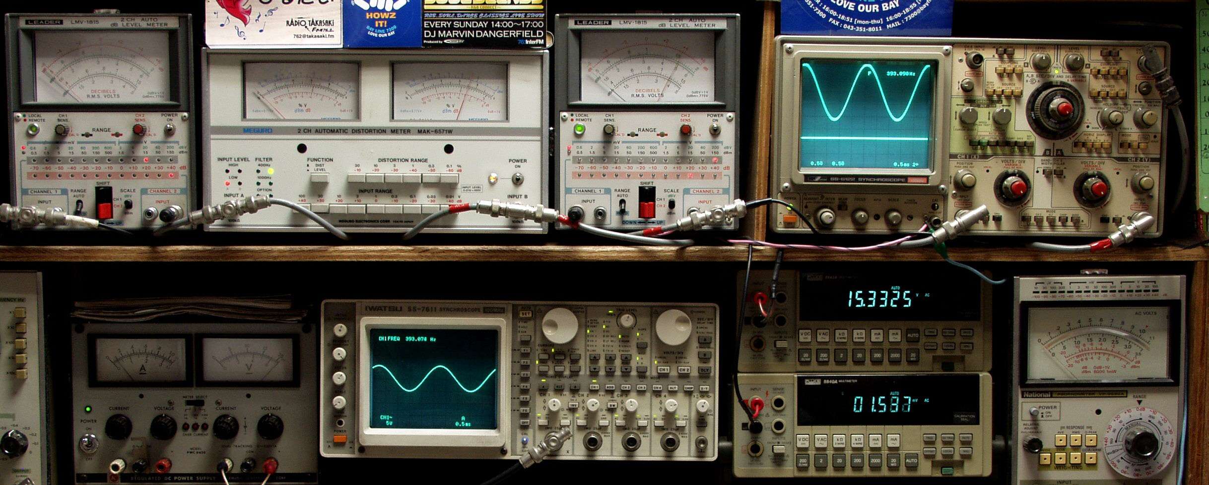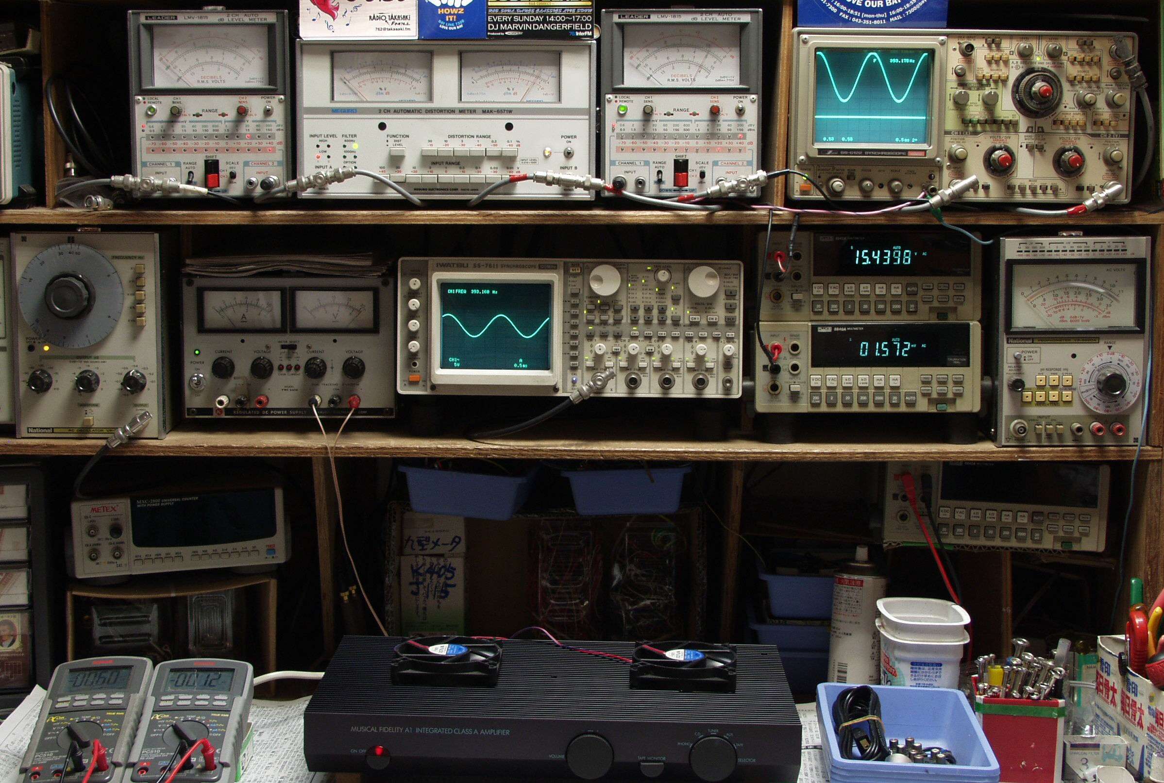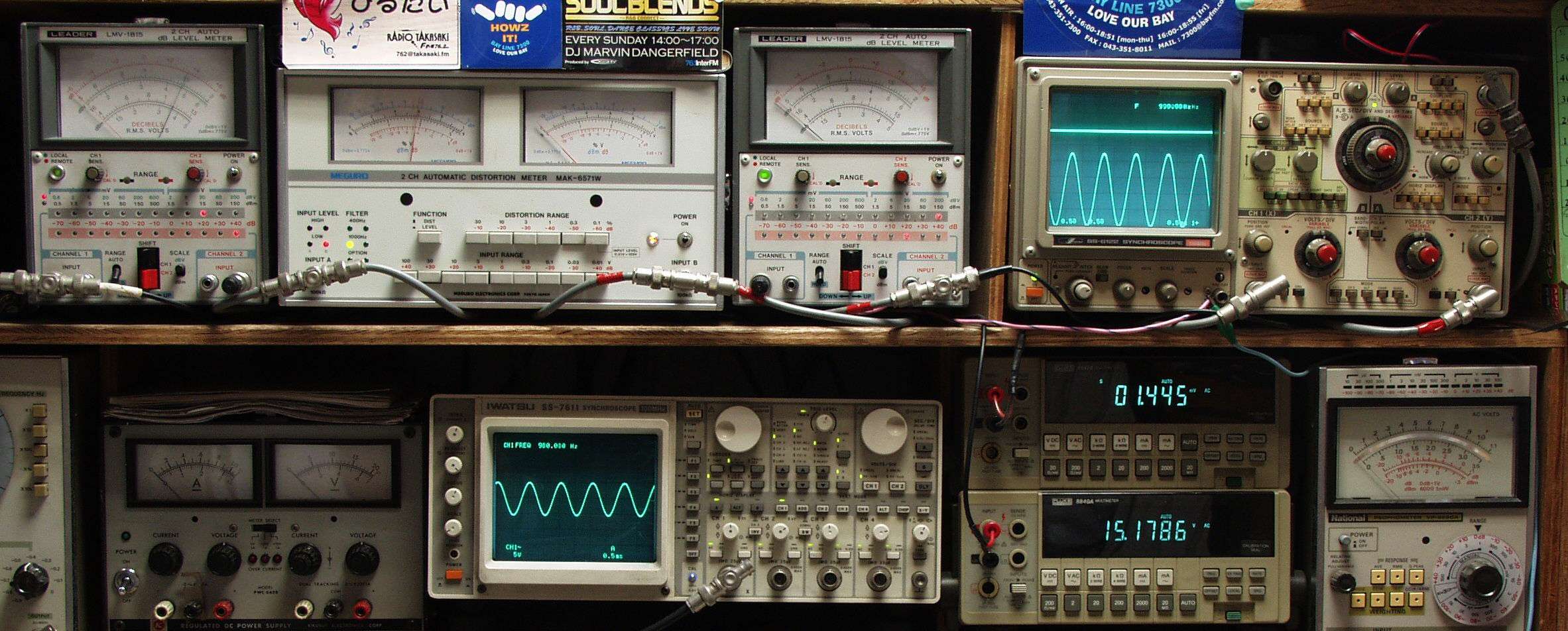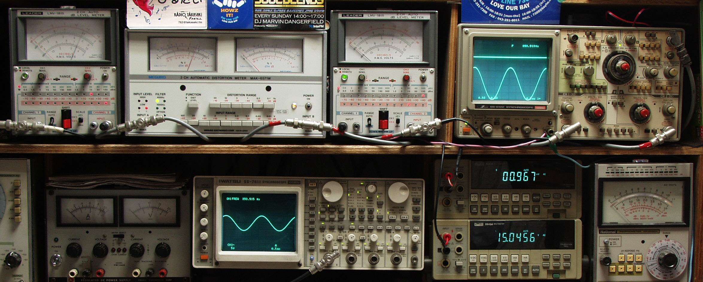 上段中左 歪み率計=出力の歪み率測定 左メータ=L出力、右メータ=R出力.