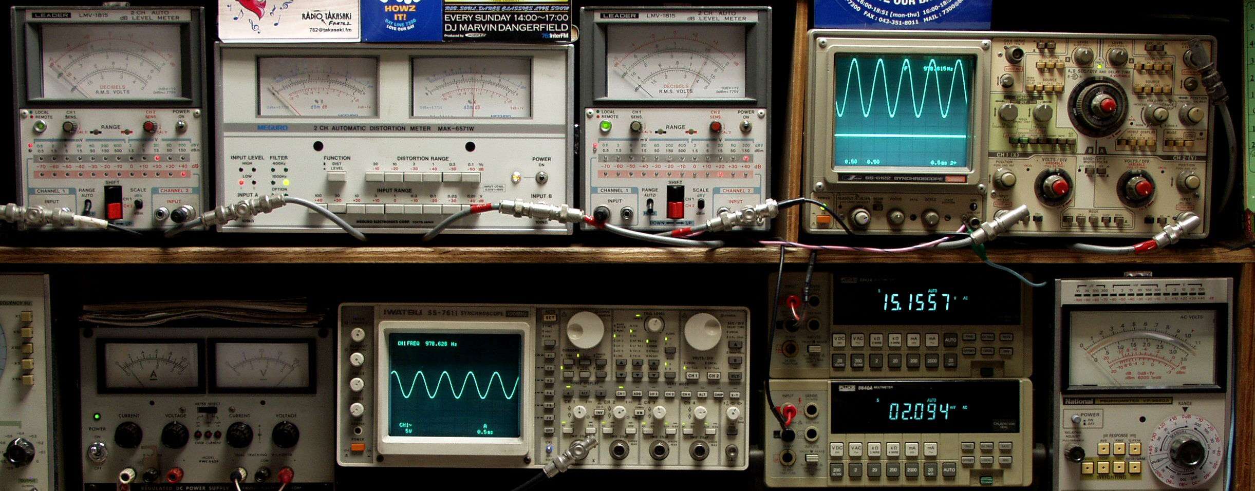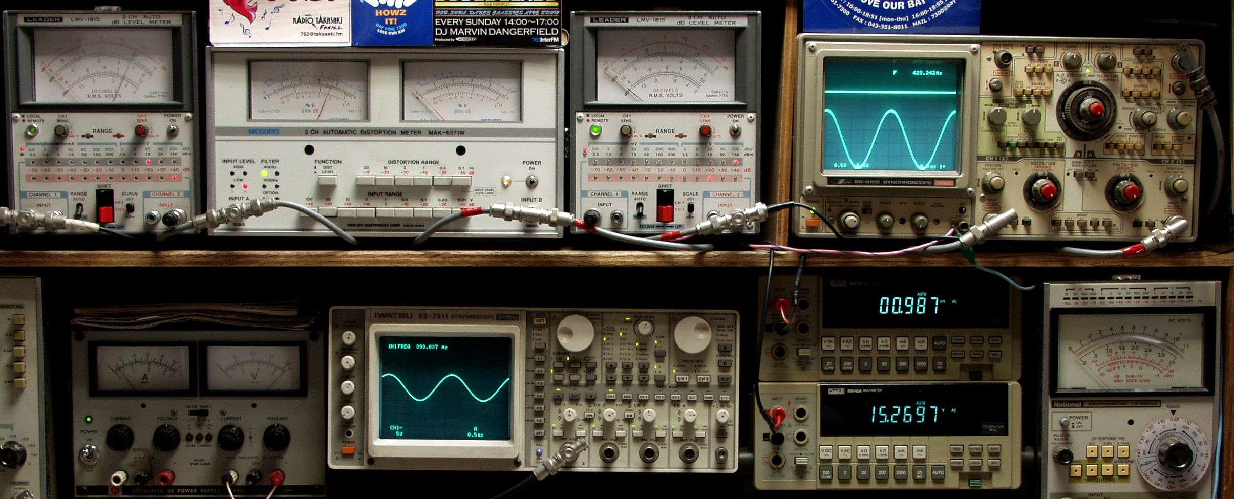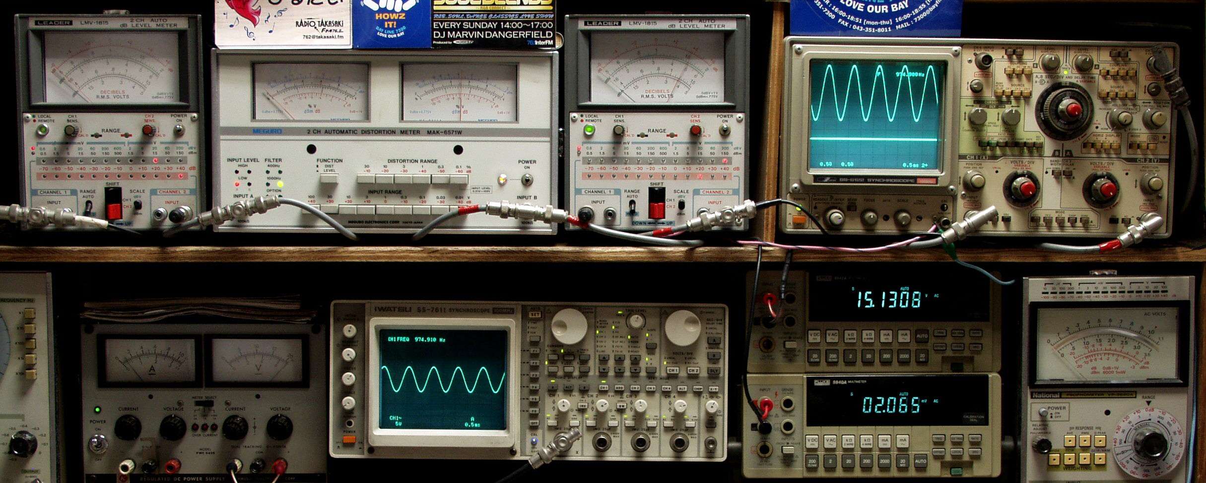 下段左端 オーディオ発振器より400HZ・1KHZの信号を出し(歪み率=約0.003%)これをAMPに入力し、出力を測定.
