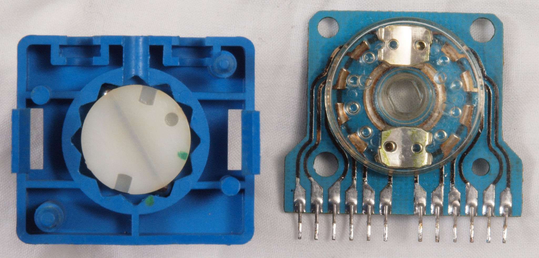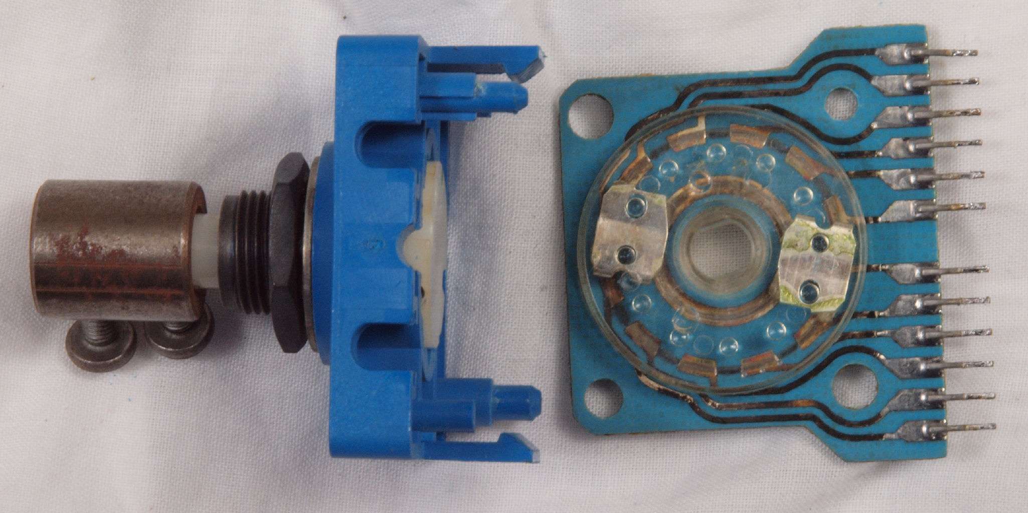 CA4. 修理(清掃)中 入力切換SW分解・清掃。 接点復活材の多用で左側のメカ部分にグリスが無。