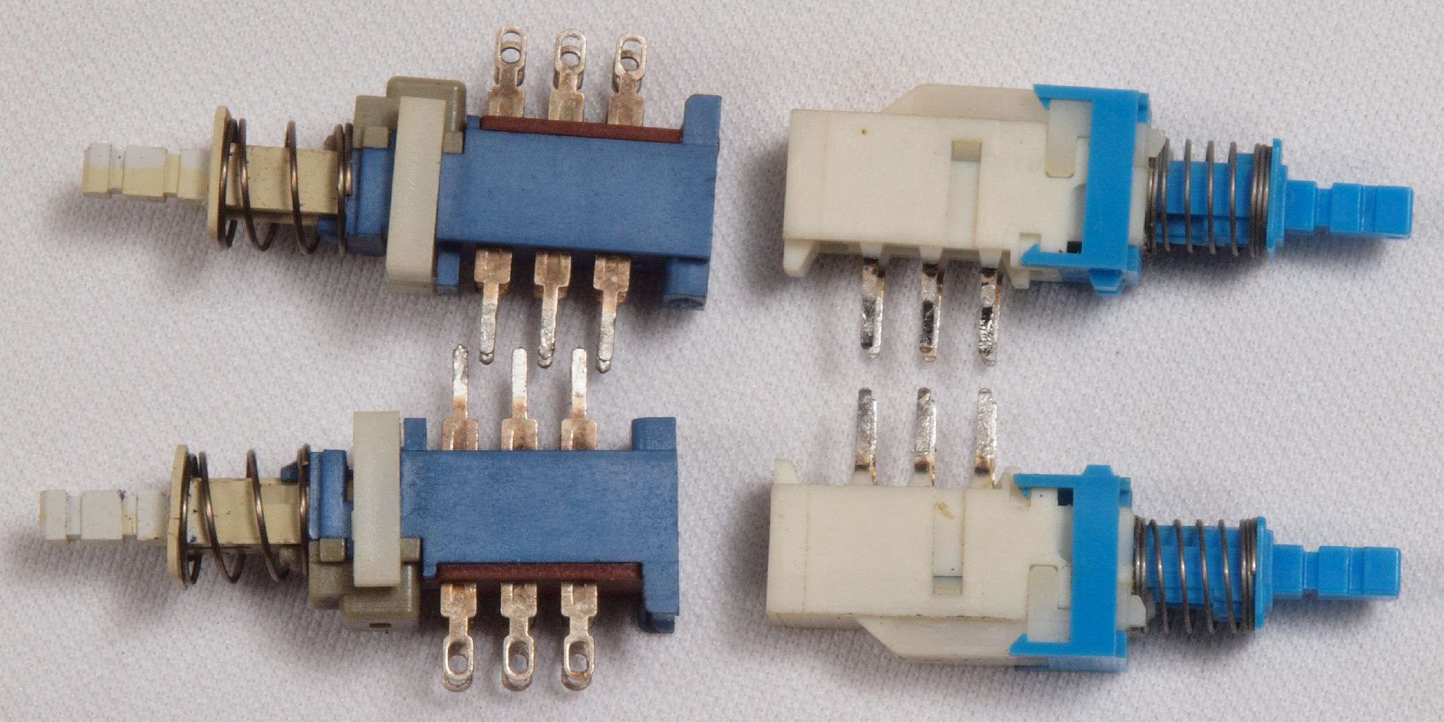 CD2. 交換部品、押しボタン切り換えSW。 接点容量の大きいのに交換する。 左=交換品、右=着いていた物。