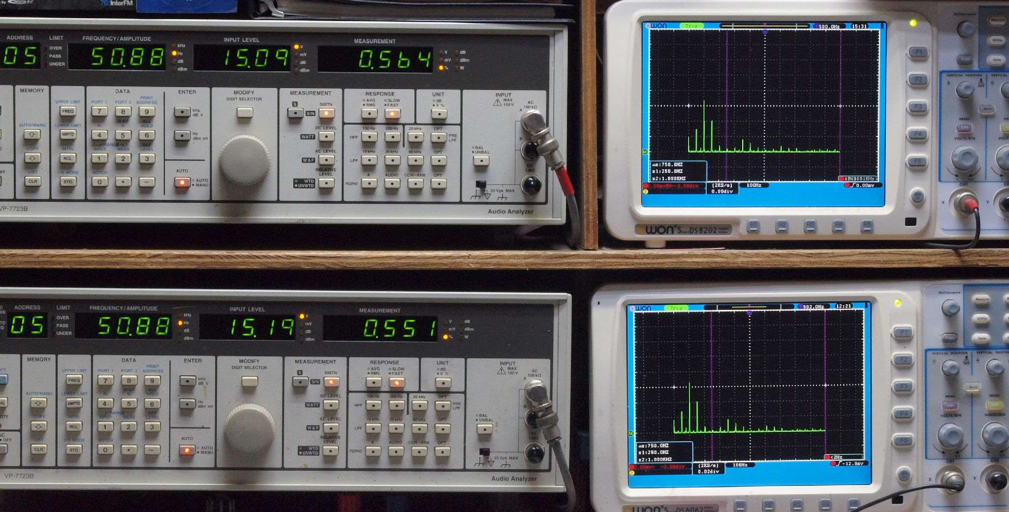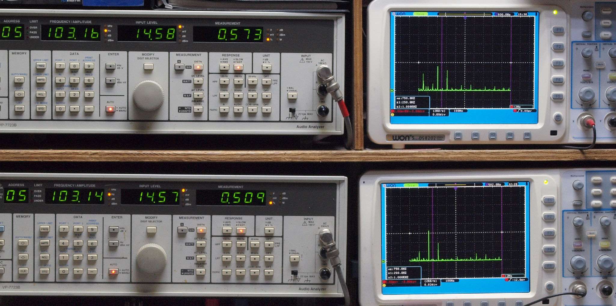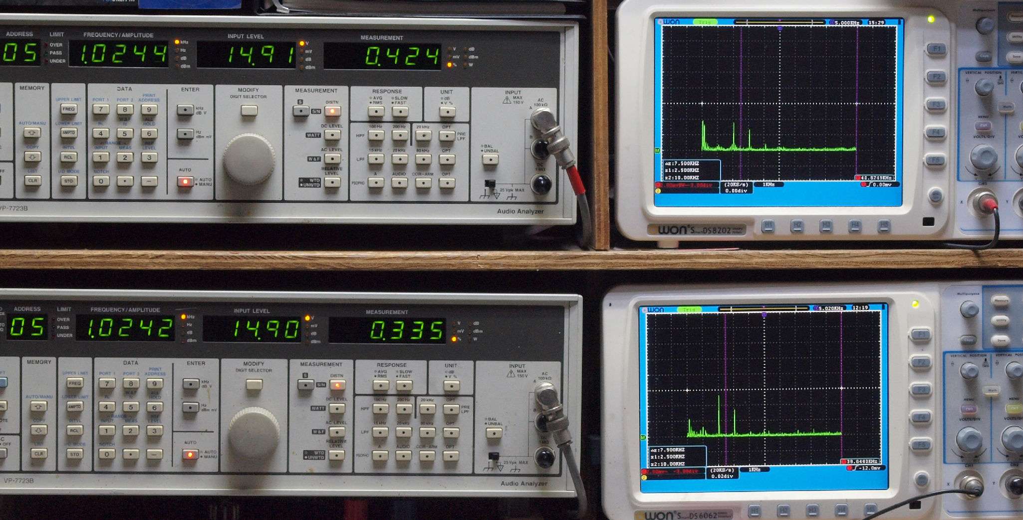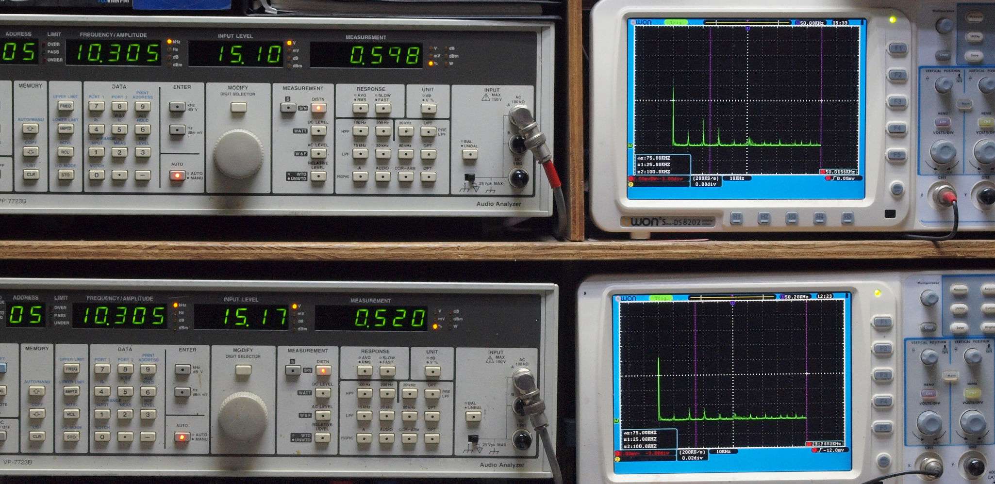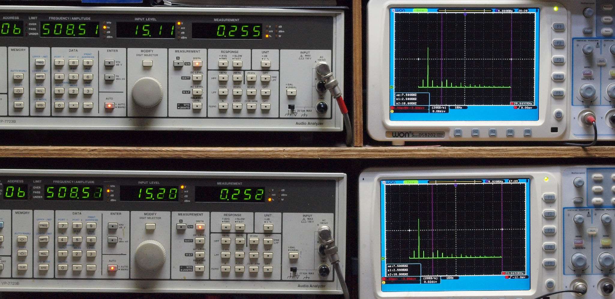 よって、ダイアル設定出力レベルより低くなります。測定機器の仕様や整備の様子はこちら、「VP−7723B」「VP−7201A」。 FFT画面の見方はこちら。
