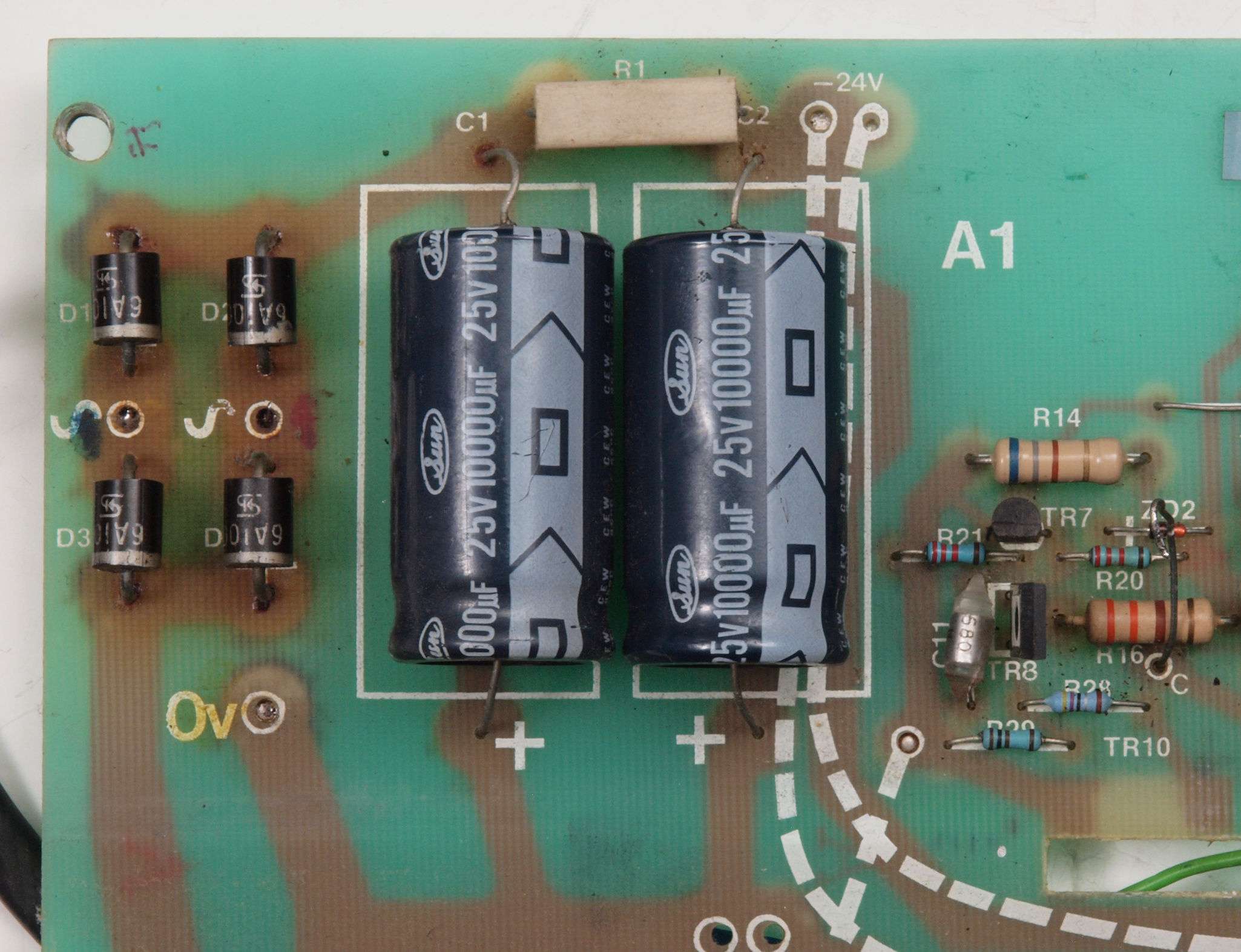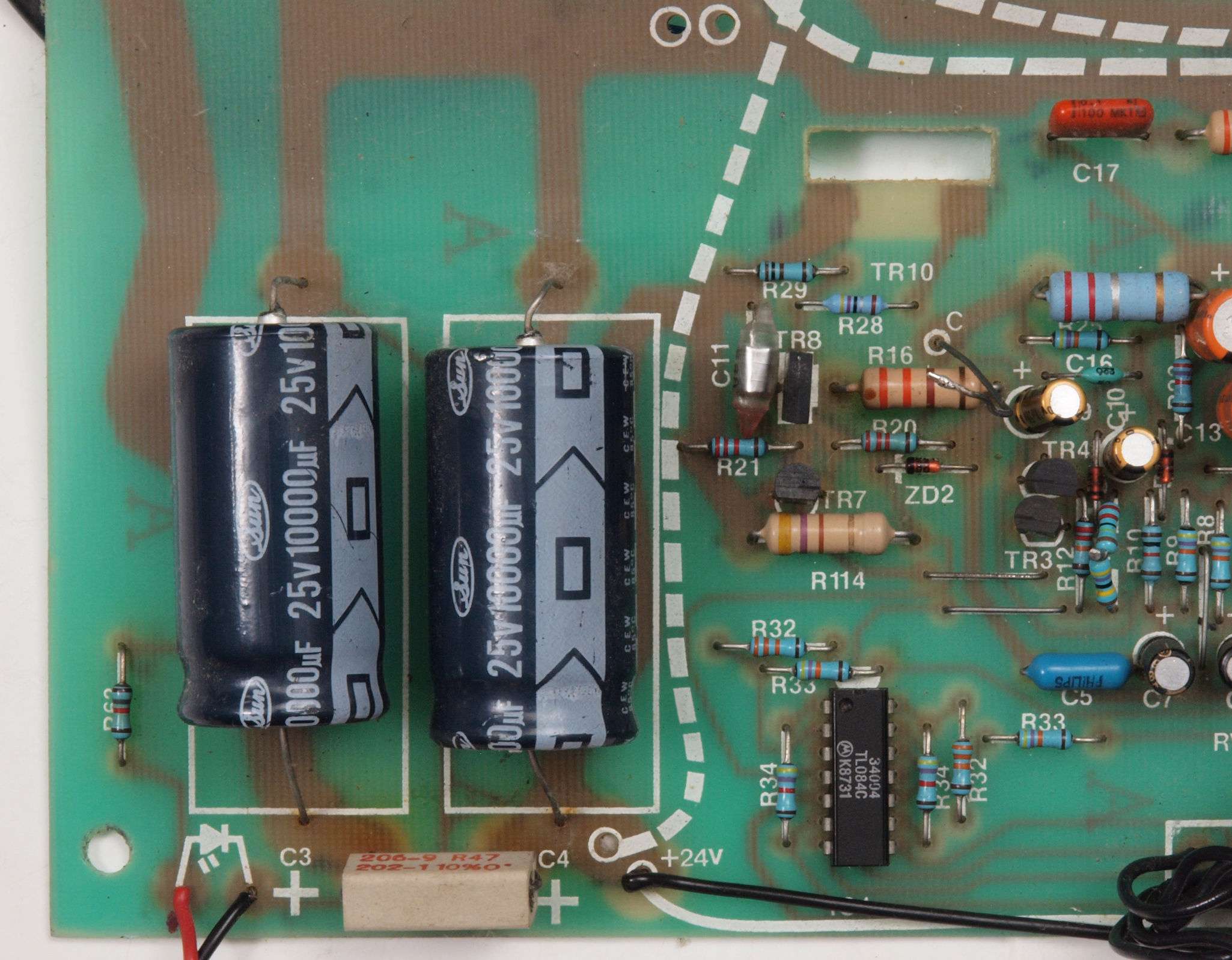 C92. 修理後 +側電源基板。 電解コンデンサーは10000μから15000μへ増量交換。