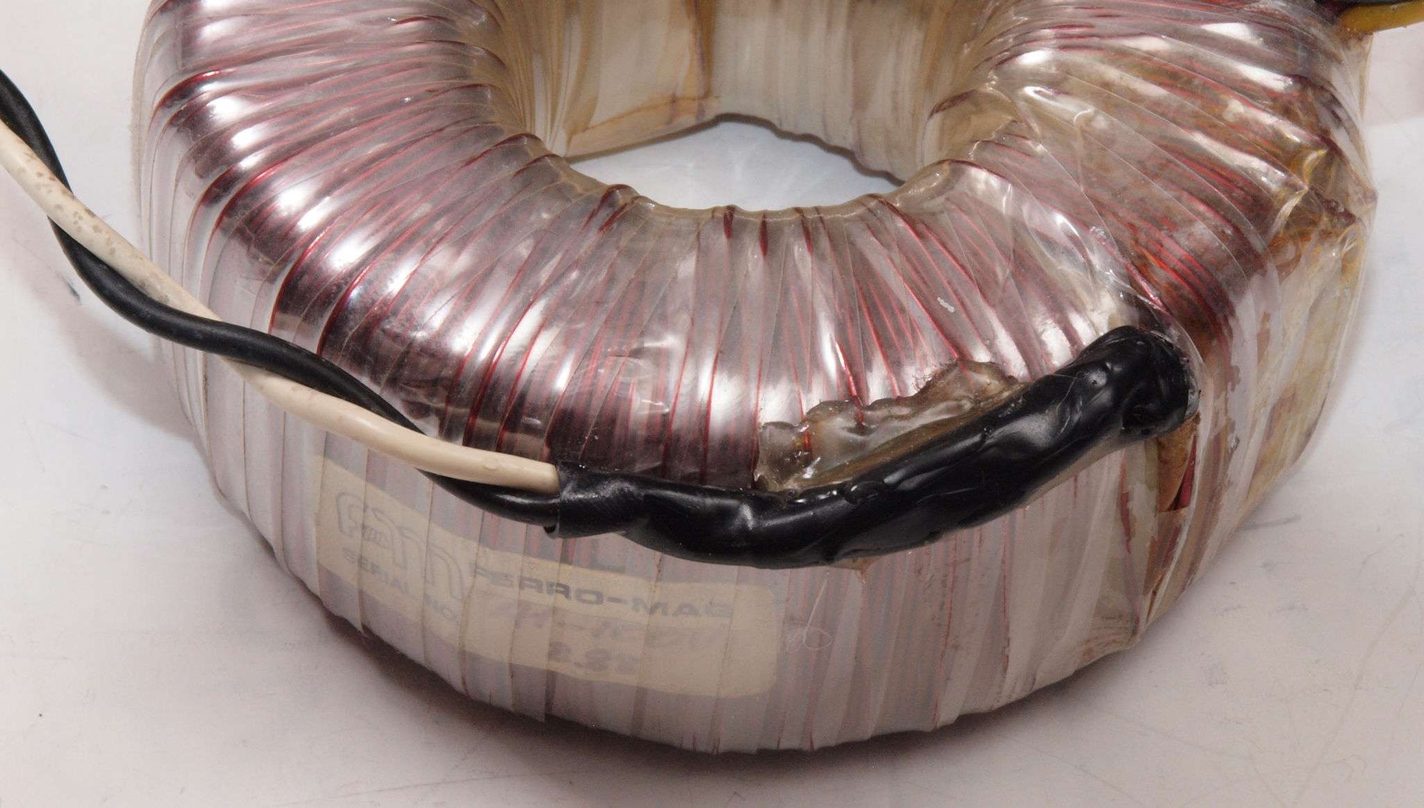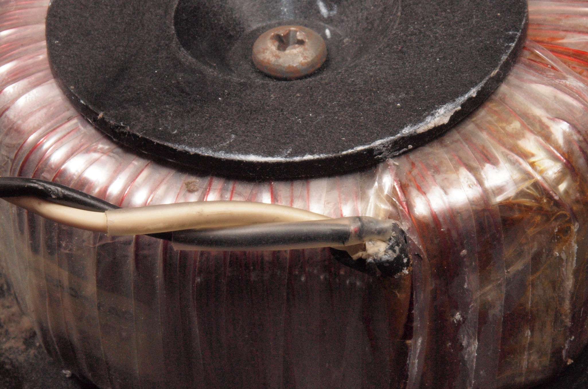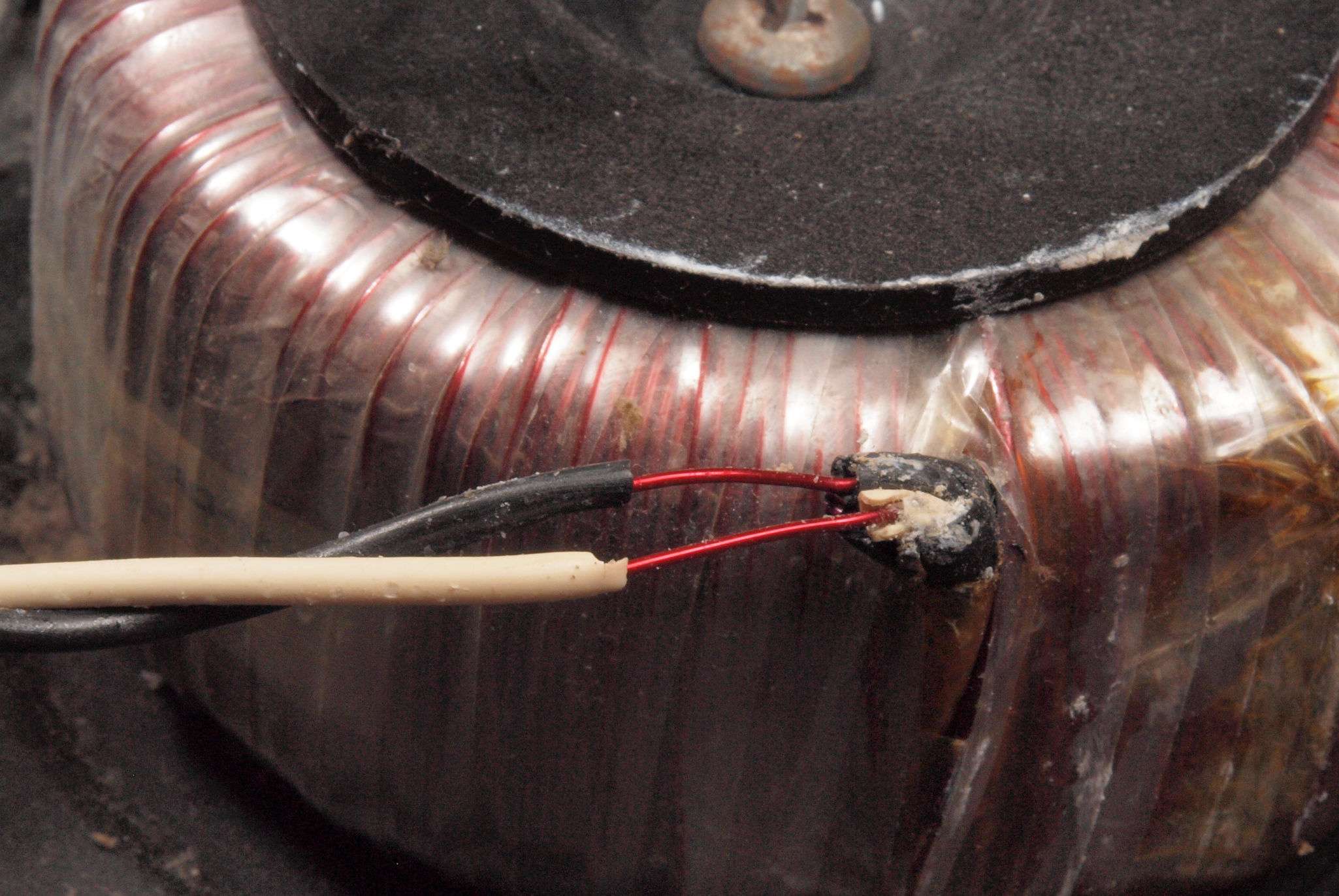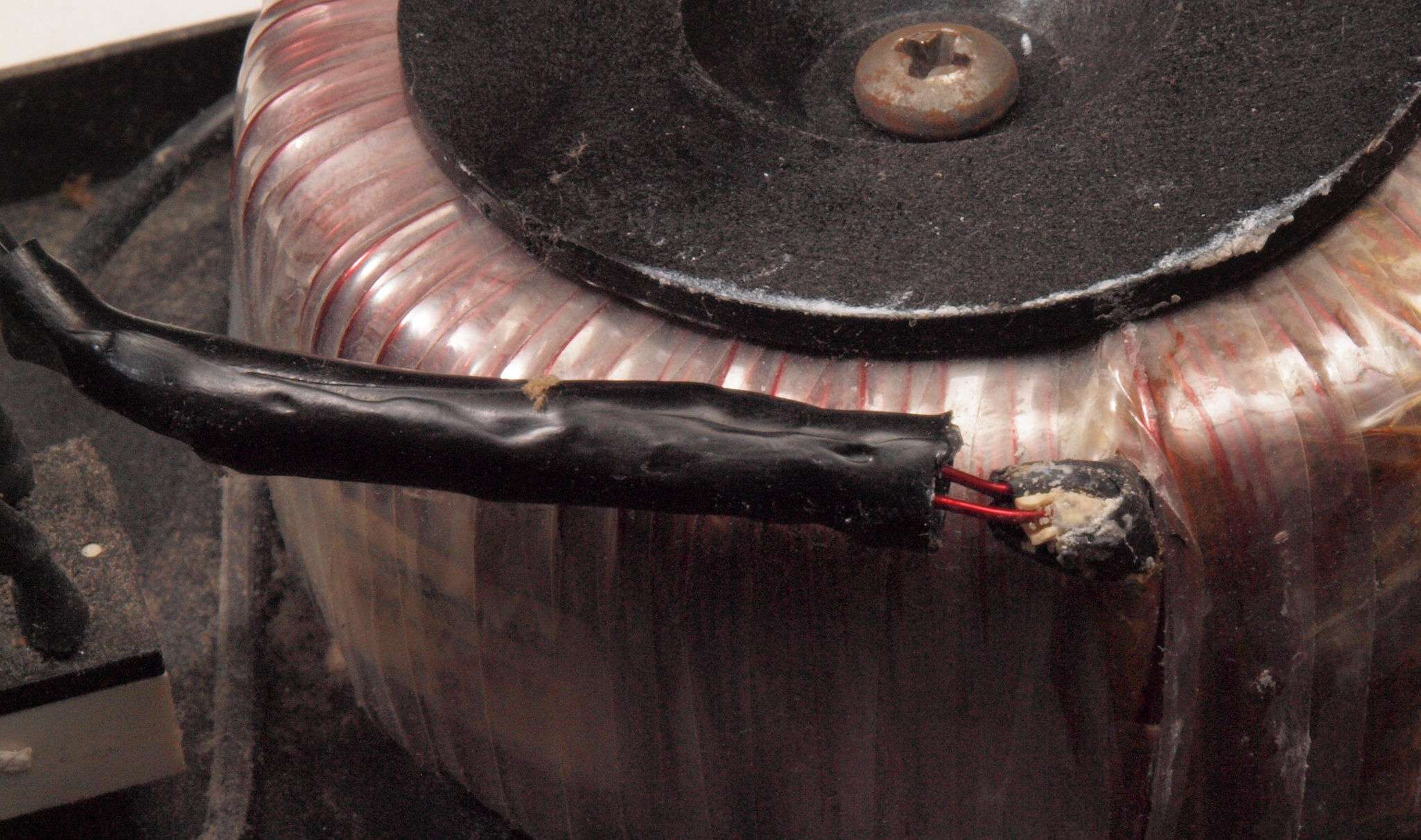 CD5. 修理中 電源トランスの電源入力線。 引き出し線を熱収縮チューブで保護する。